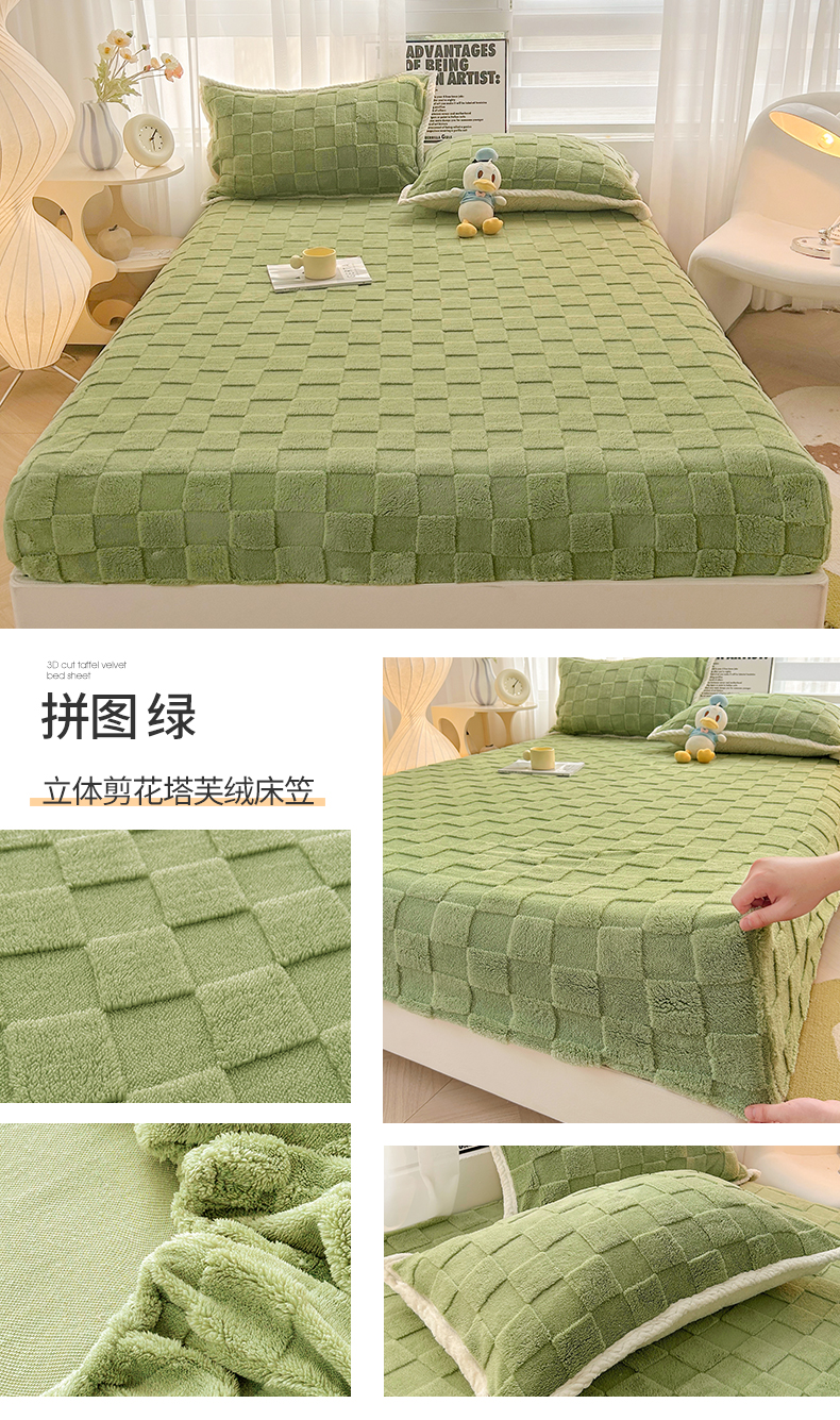 商品名称:梦舒羽 2025直播爆款牛奶绒塔芙绒纯色雕花床笠三件套 拼图 绿