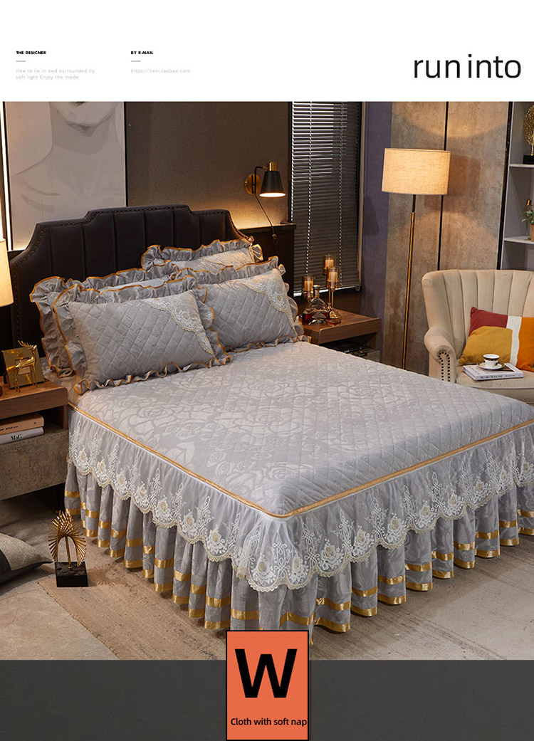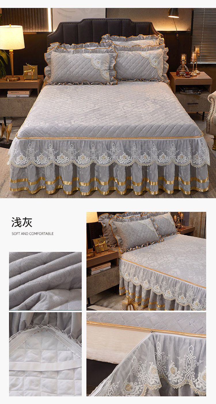 恋尚 2023新款天鹅绒可脱卸夹棉床裙 床盖四件套 床裙 浅灰