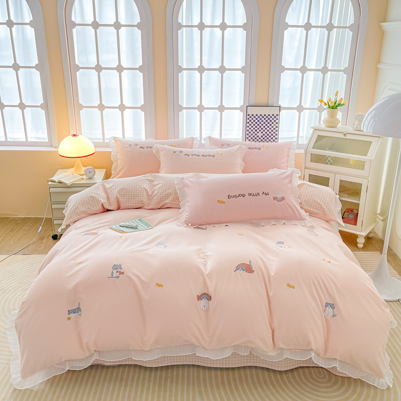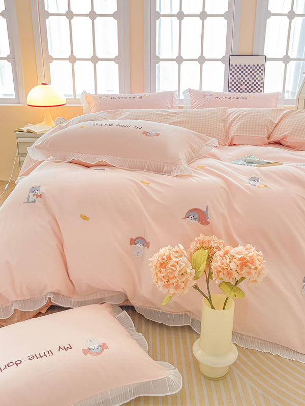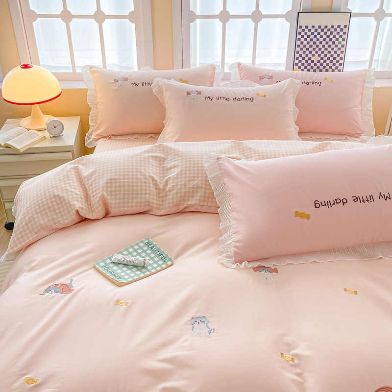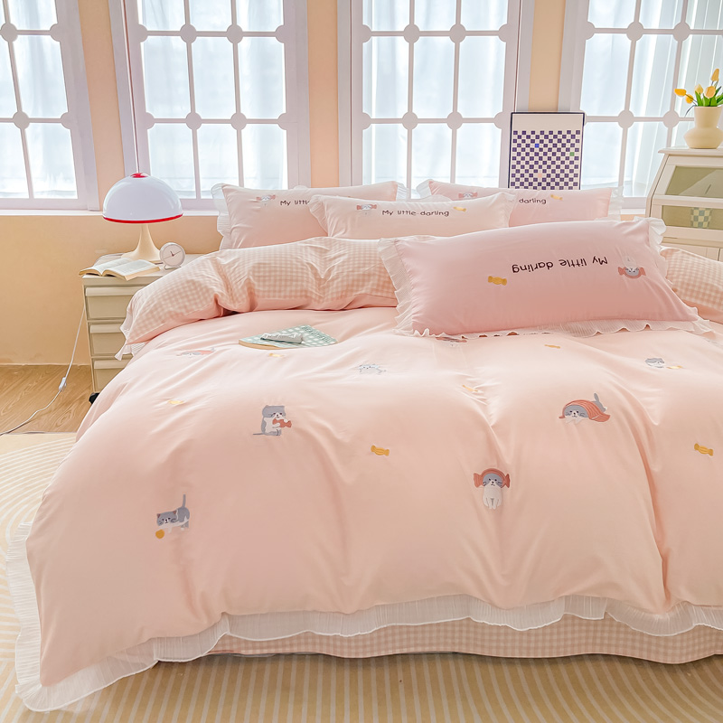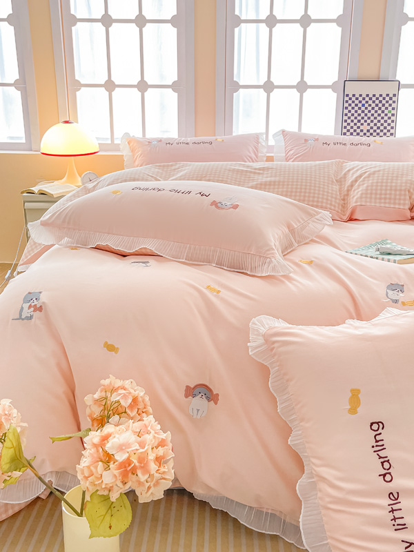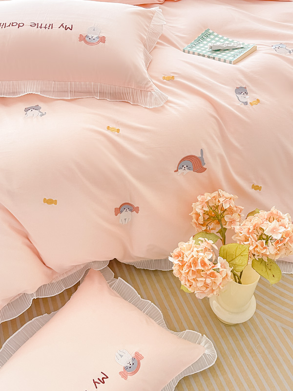 梧桐家居 2023新款全棉磨毛刺绣四件套-糖果小猫 粉