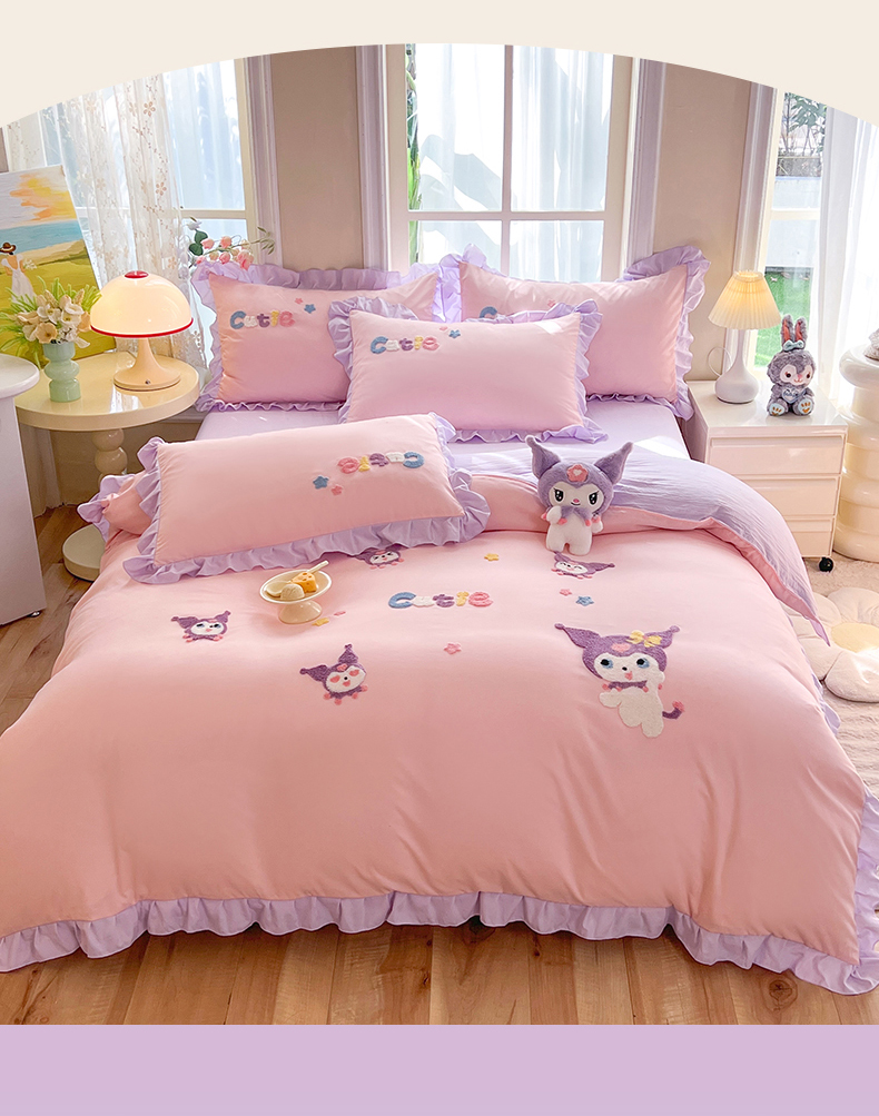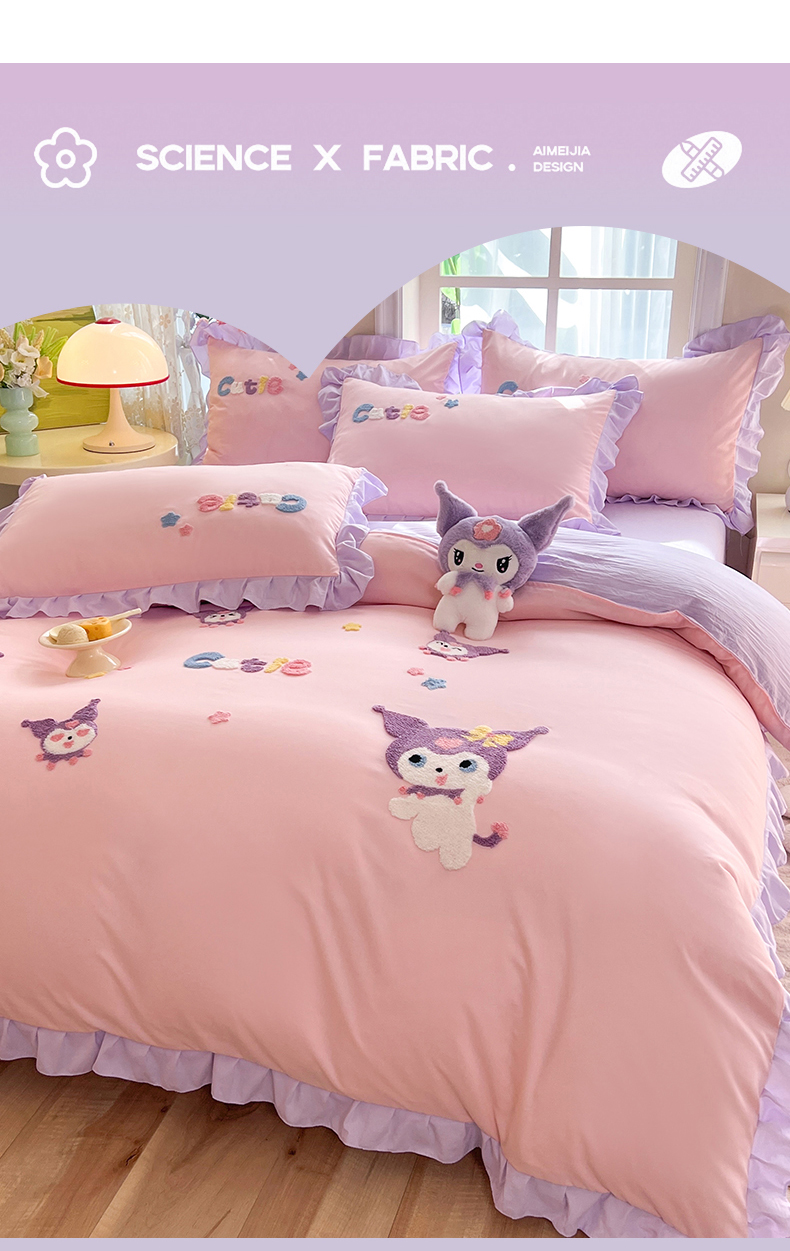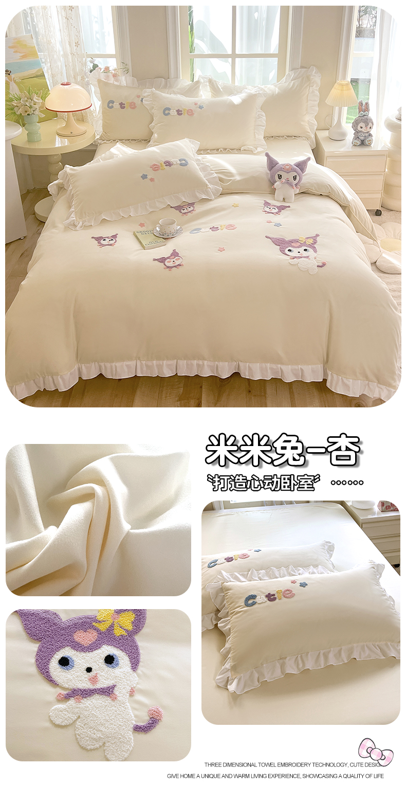 (总)雨菲家纺 2025新款高克重加厚牛奶绒毛巾绣韩版荷叶花边四件套-美美兔,美美兔粉紫,美美兔粉,美美兔奶黄紫,美美兔紫