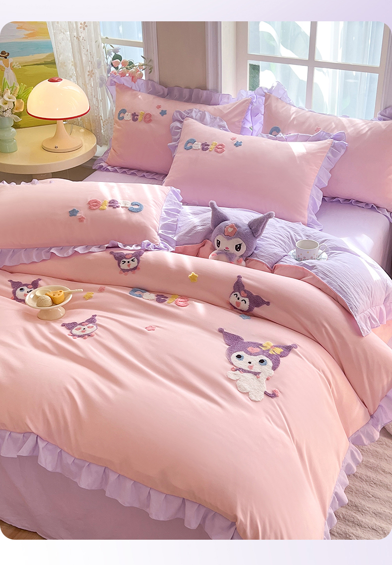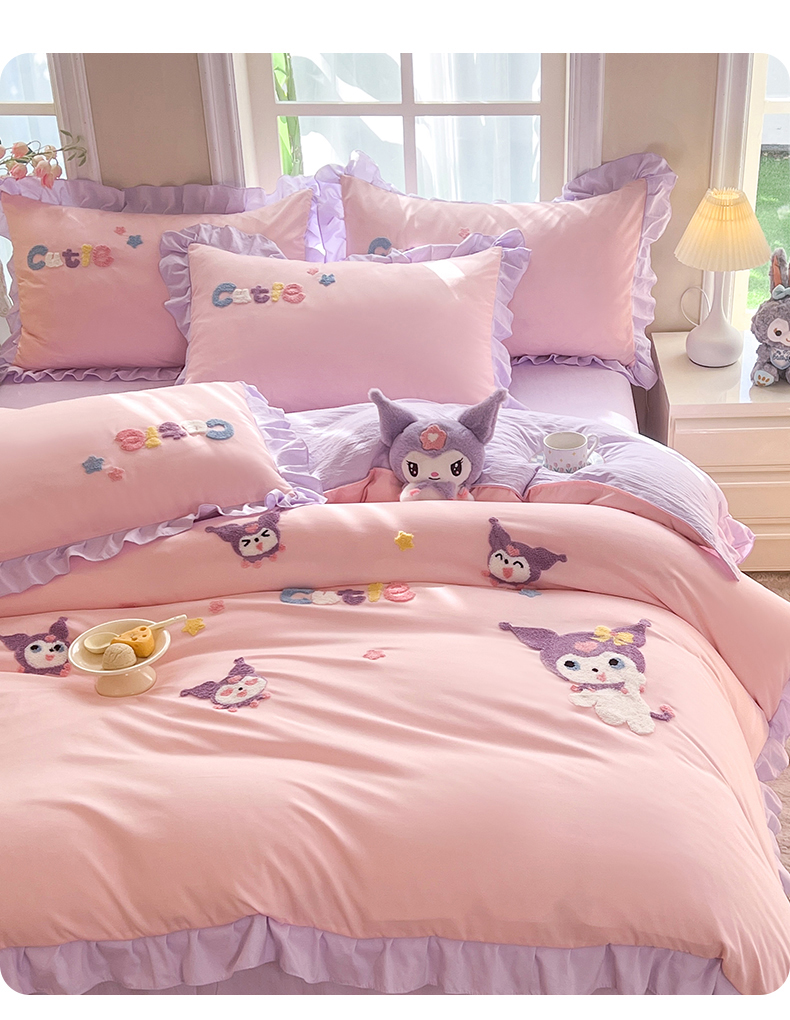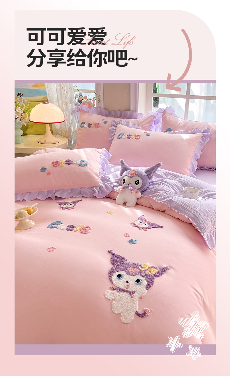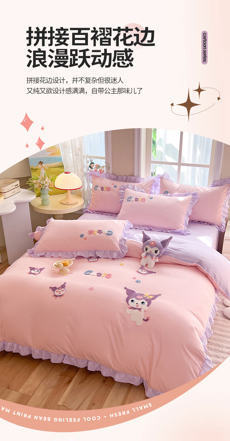 (总)雨菲家纺 2025新款高克重加厚牛奶绒毛巾绣韩版荷叶花边四件套-美美兔,美美兔粉紫,美美兔粉,美美兔奶黄紫,美美兔紫