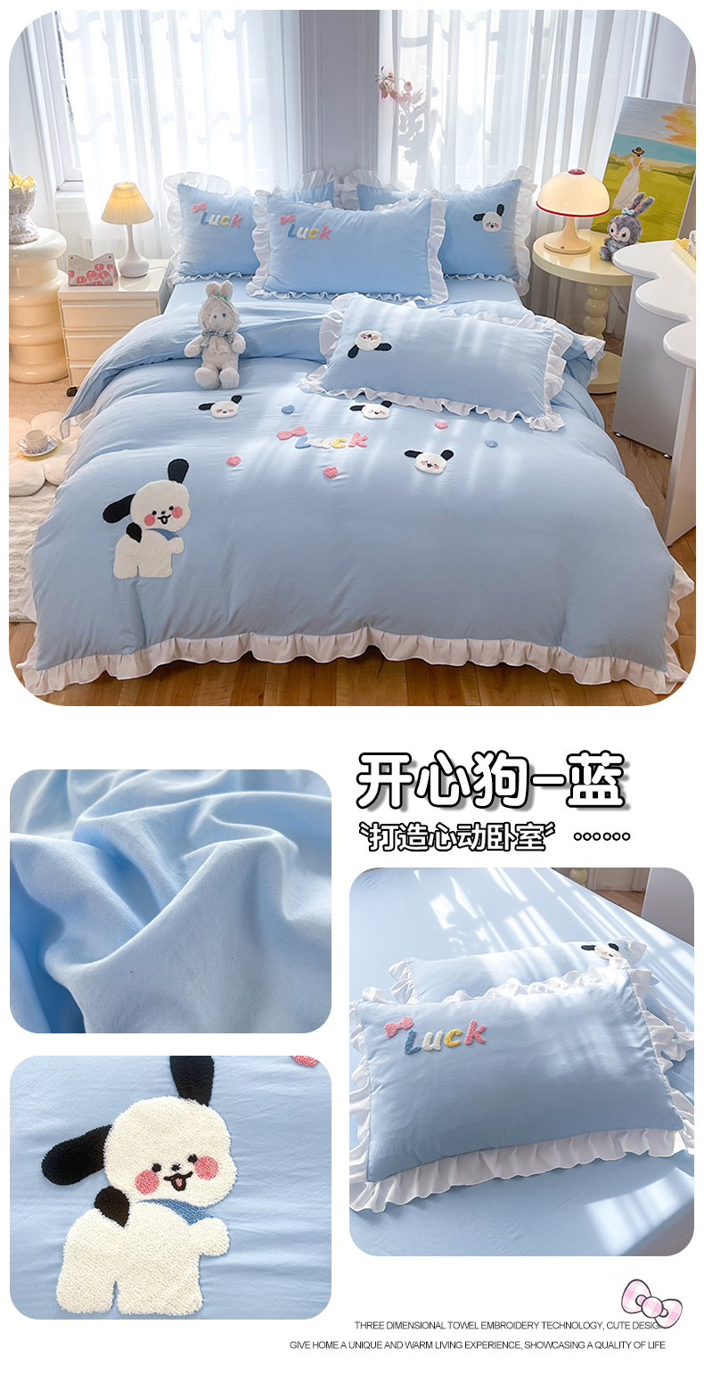 (总)雨菲家纺 2025新款水洗棉韩版荷叶花边毛巾绣四件套,开心狗-粉,开心狗-黄,开心狗-蓝,米米兔-粉,米米兔-粉紫,米米兔-杏,米米兔-杏紫,米米兔-紫
