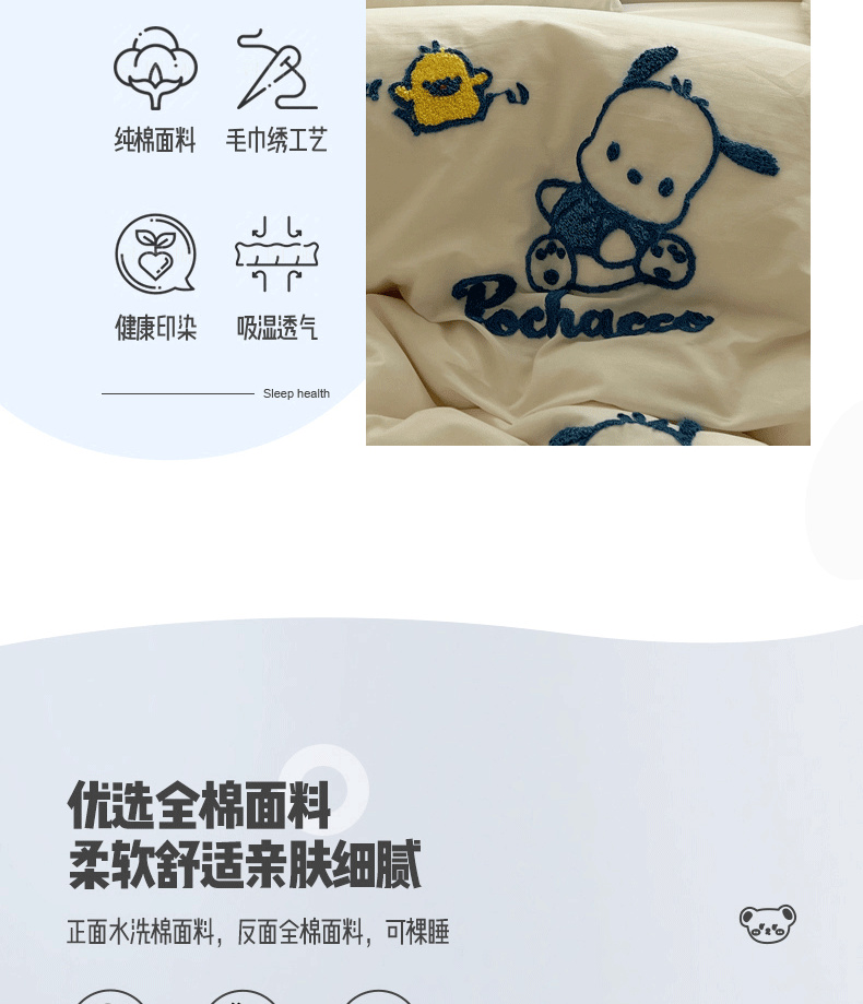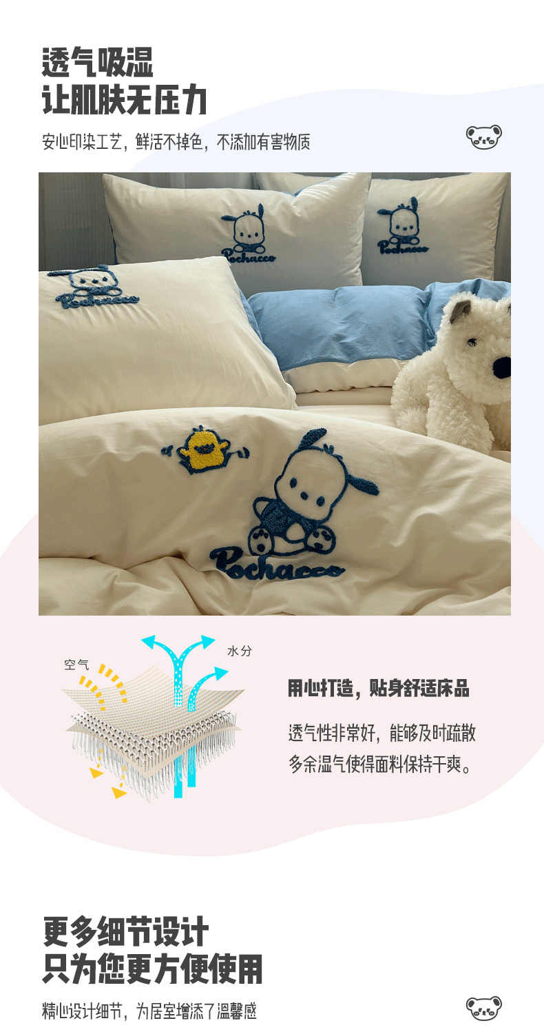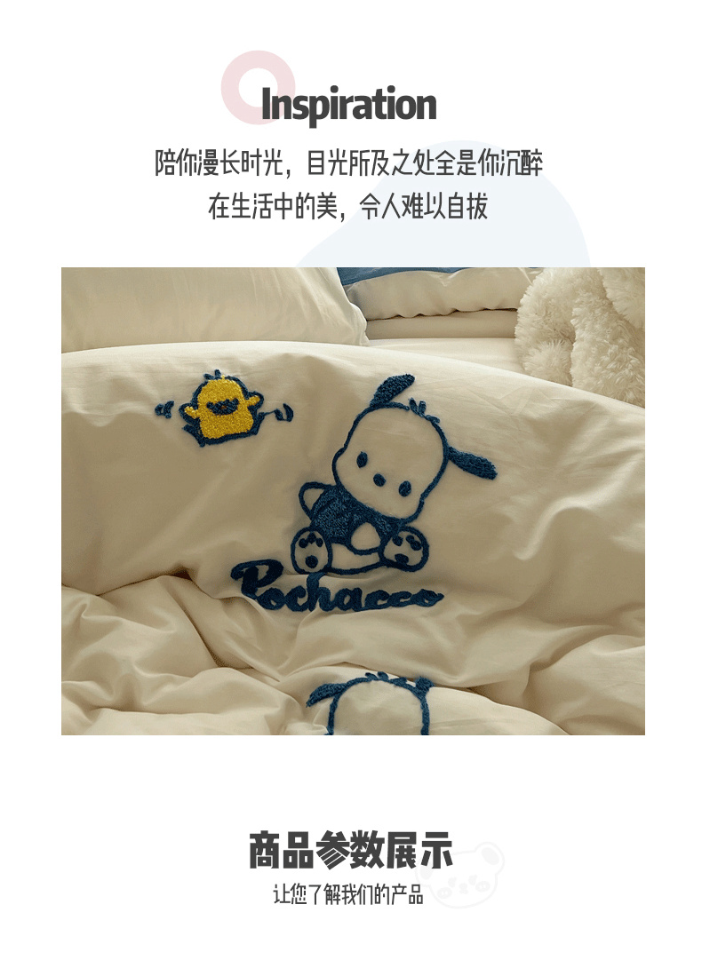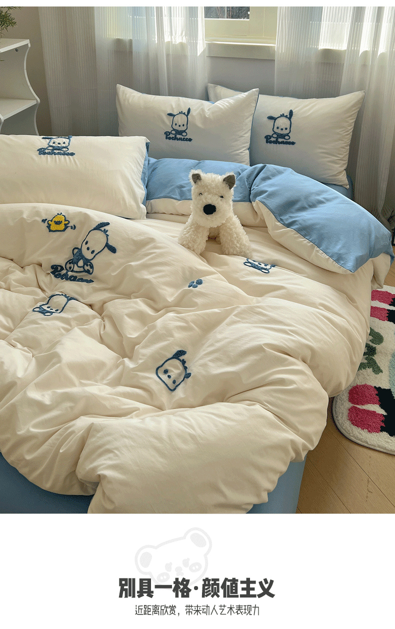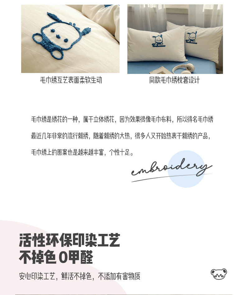 商品名称:三朵家纺 2024新款春夏全棉三丽鸥毛巾绣四件套 欢乐帕恰狗-白