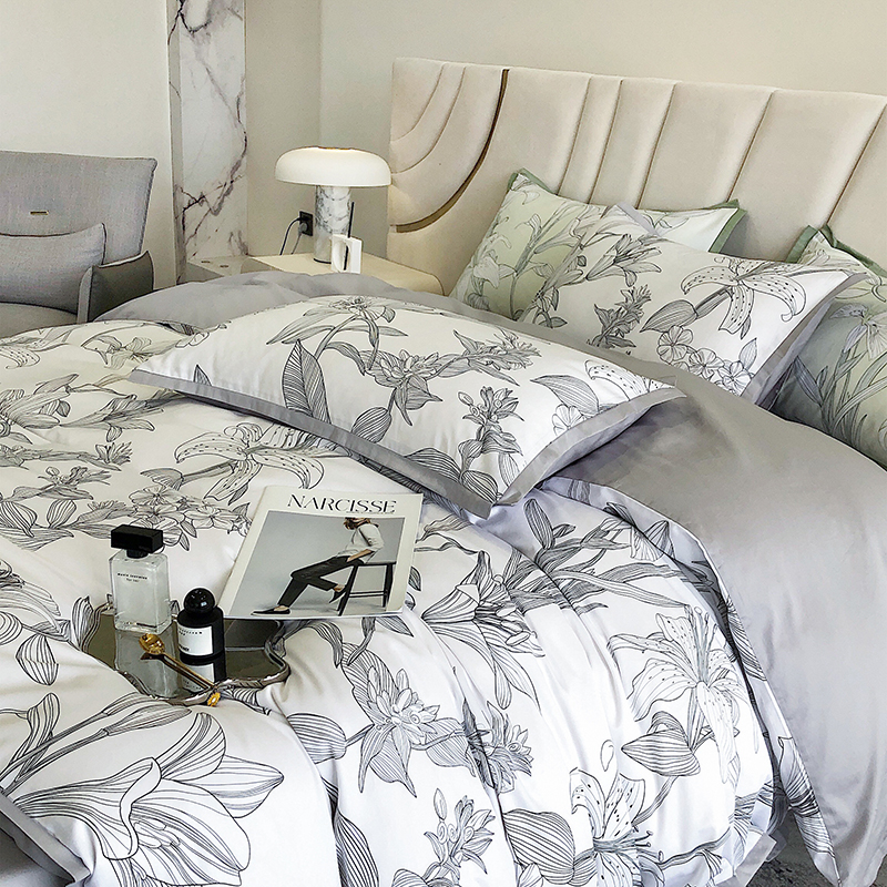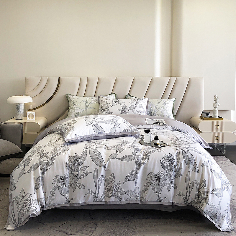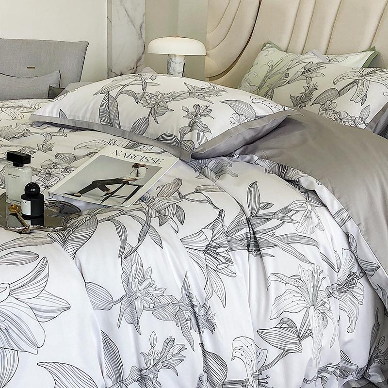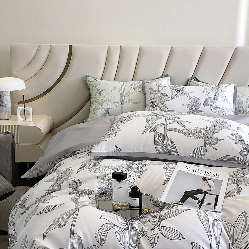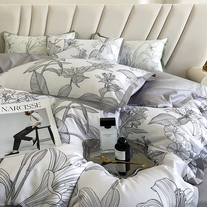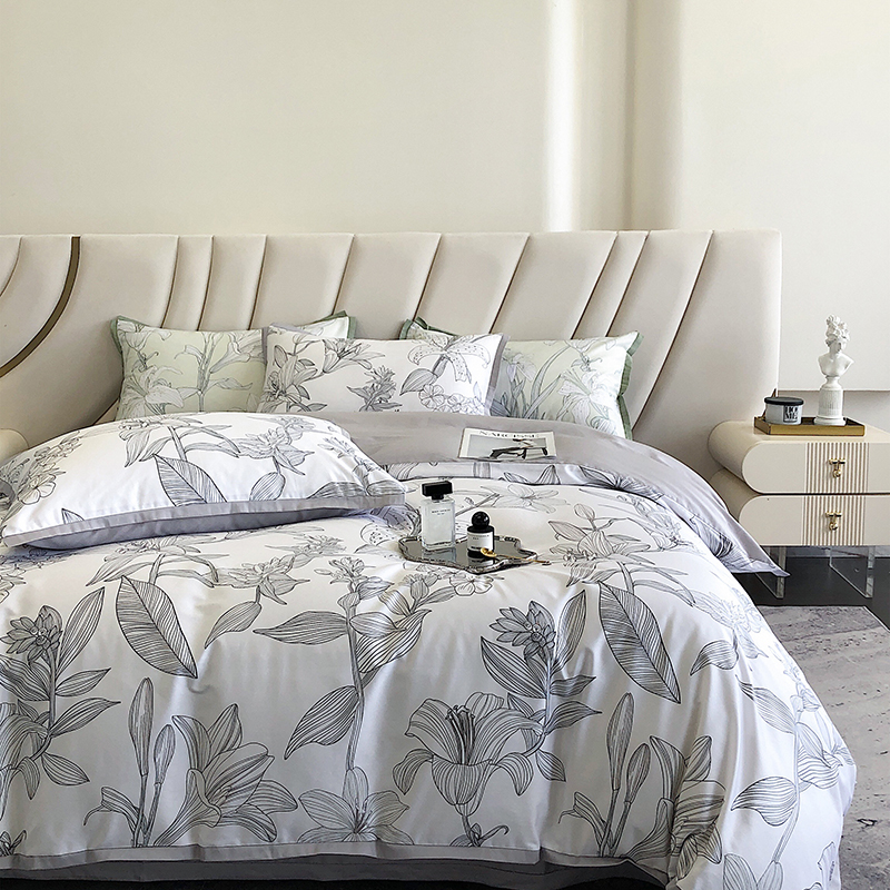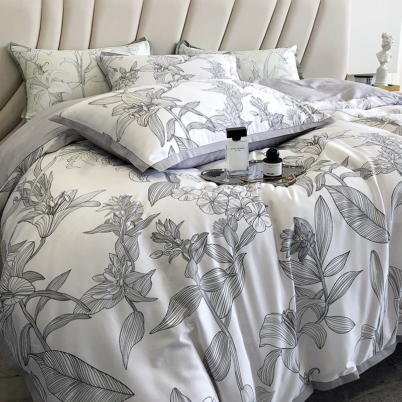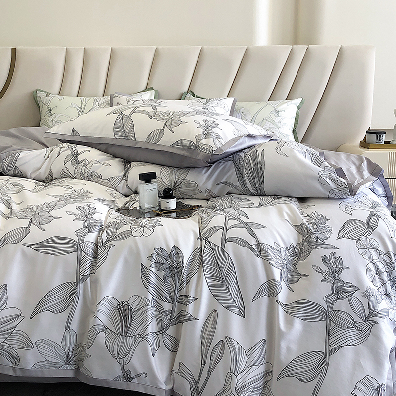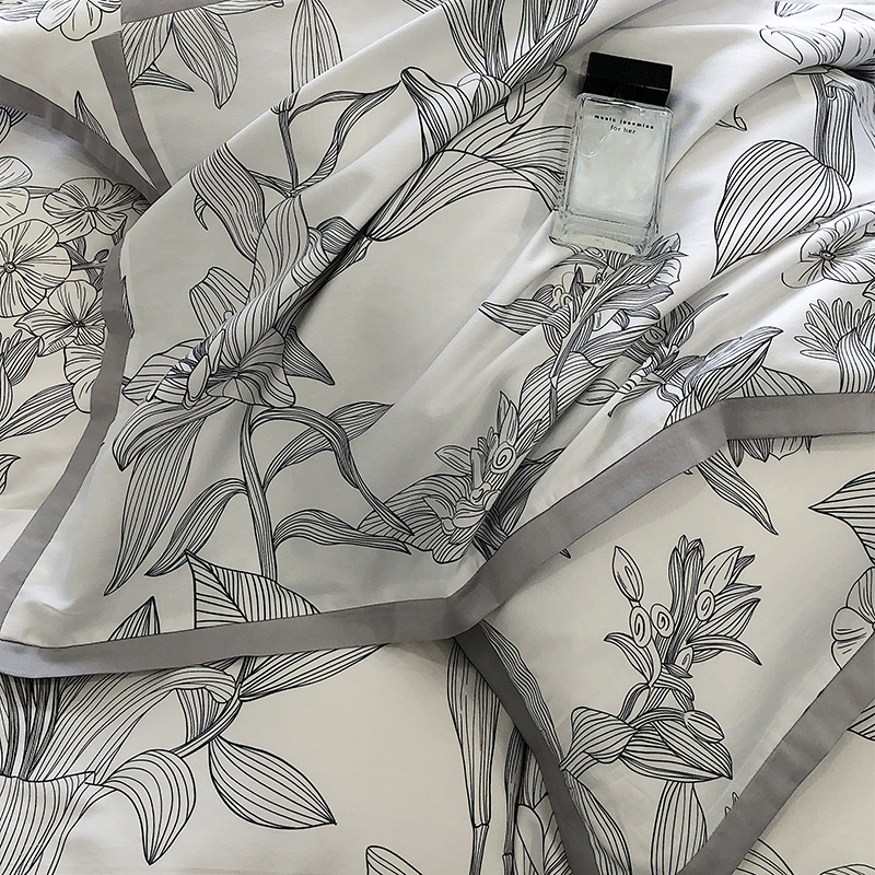 佳汐蓝家纺 2024新款60支新疆长绒棉澳棉数码印花小边款四件套 韵叶 白