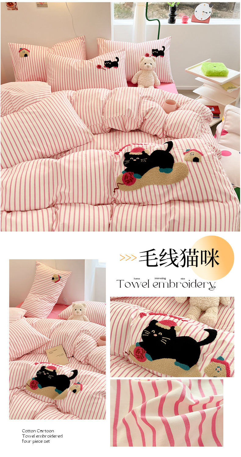 呗旺鹿 2024新款小清新全棉四件套毛巾绣四件套纯棉四件套 毛线猫咪