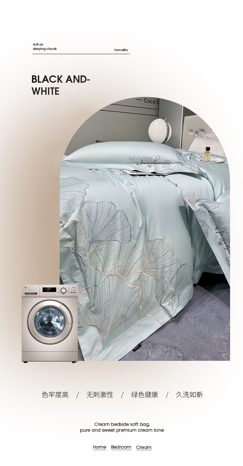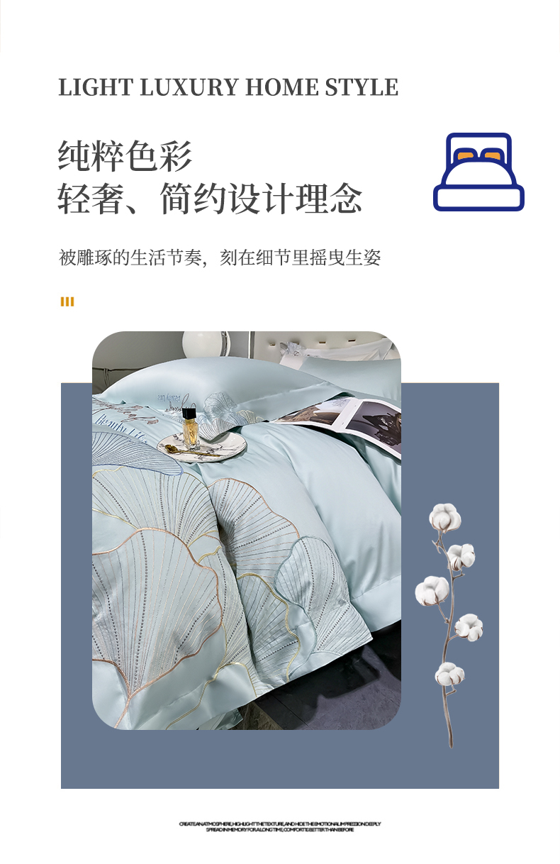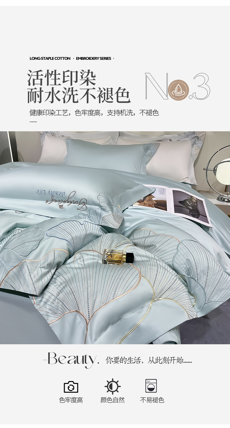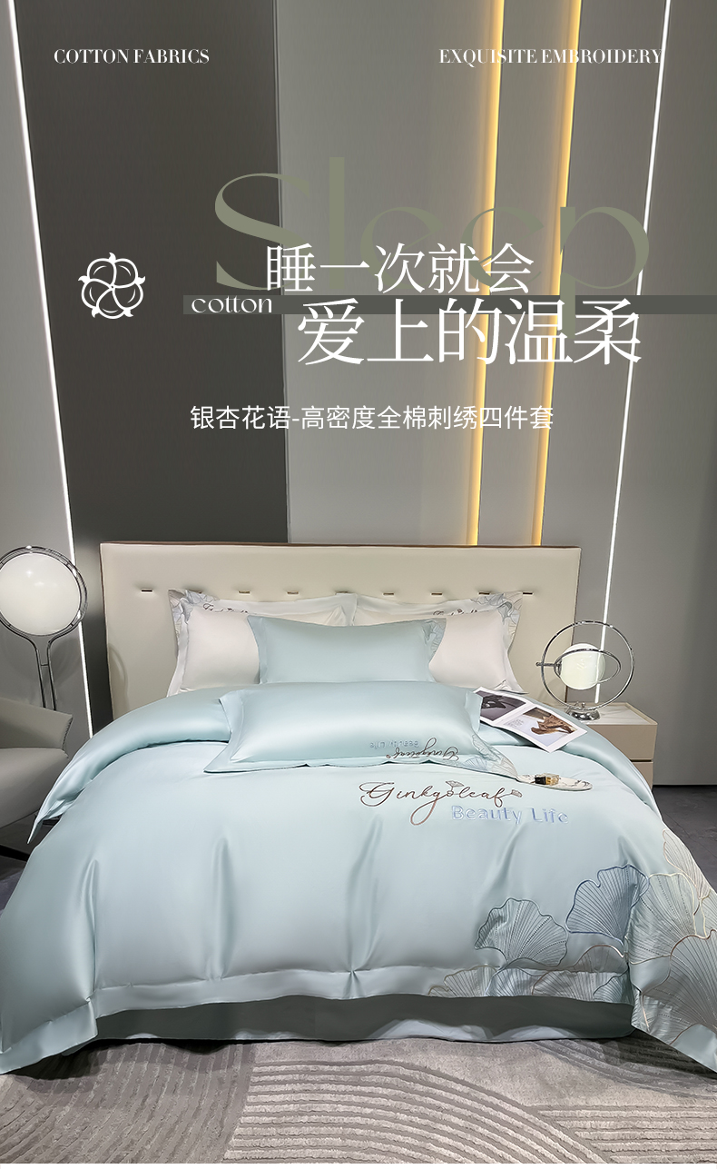 商品名称:家居1号家纺 2024新款轻奢双面100纯棉长绒棉刺绣四件套床单被套全棉床上用品直播热款-银杏花语 银杏花语-马卡绿