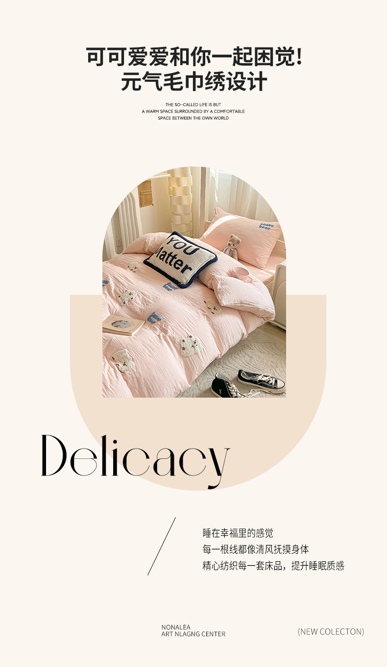 (总)韩巢家纺 2026新款花边款针织双层纱四件套,爱心,彩色蝴蝶结,春和豆沙,春和米,春意花开,叮当熊,花田薇,可爱多兰,可爱熊,敏敏灰,魔法森林,木昔,奶油波点米,奶油狗,巧克力,塞林娜绿,塞林娜米黄,问秋黄,问秋棕,熊先生,悠然紫,云山沐晚