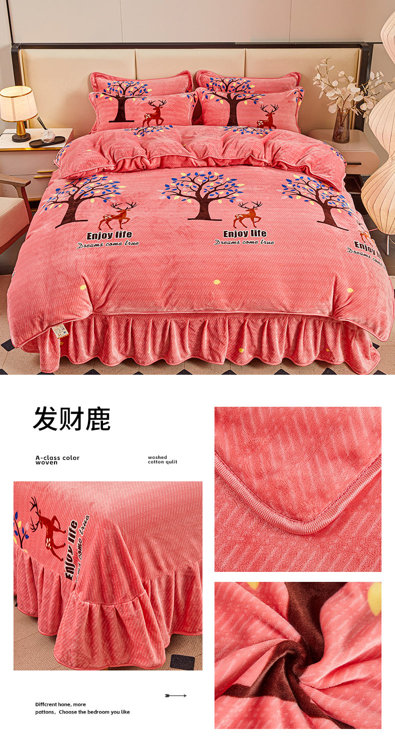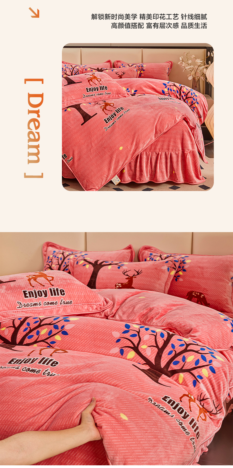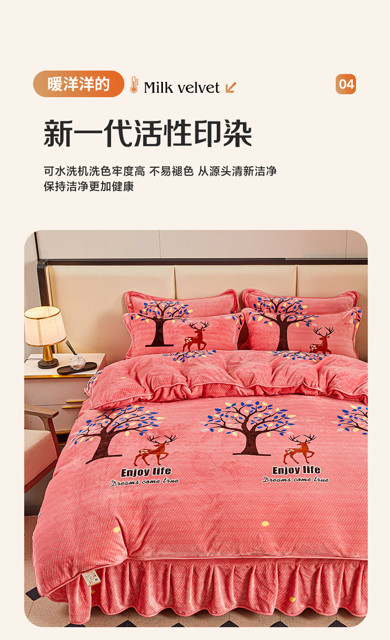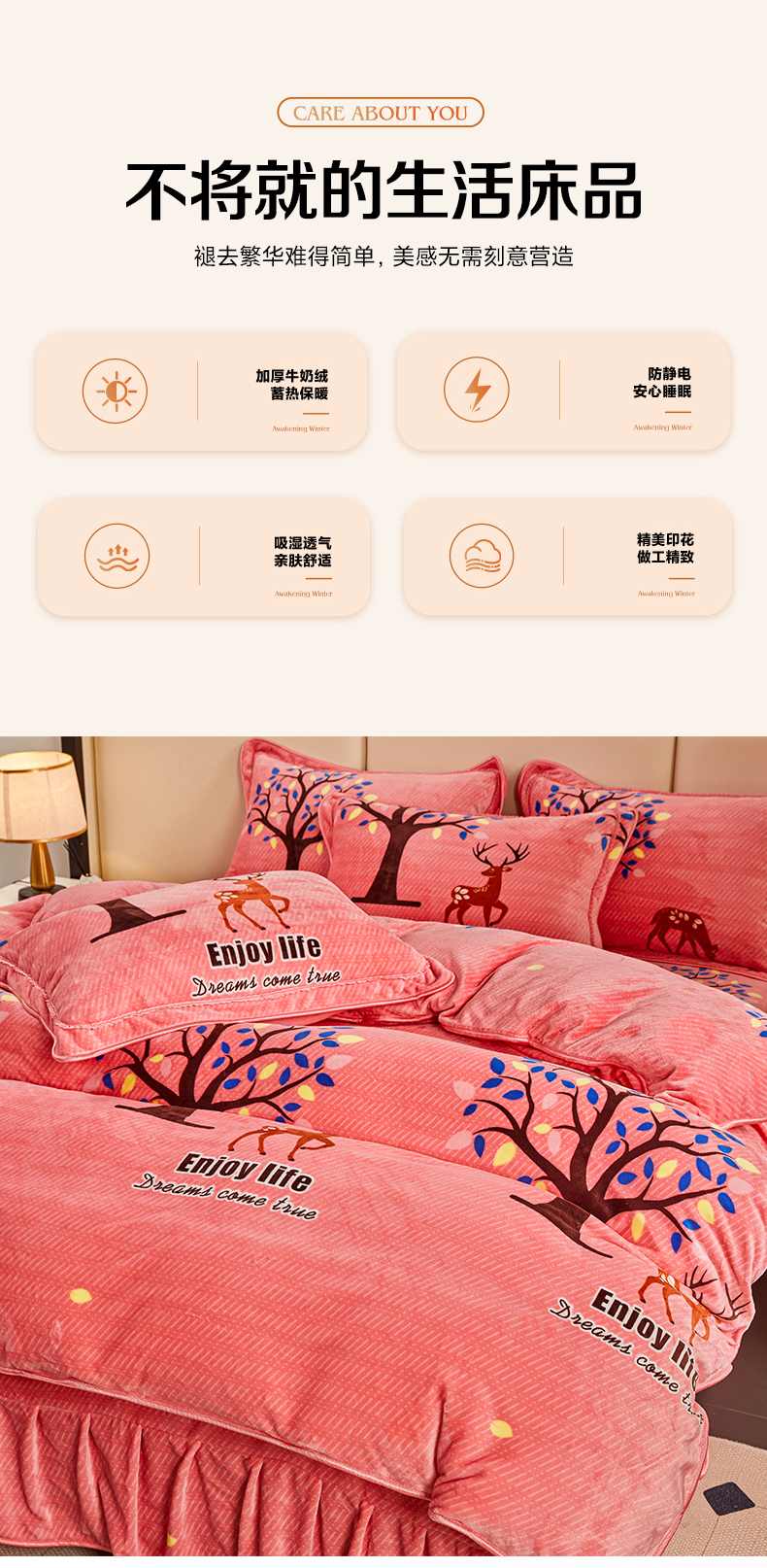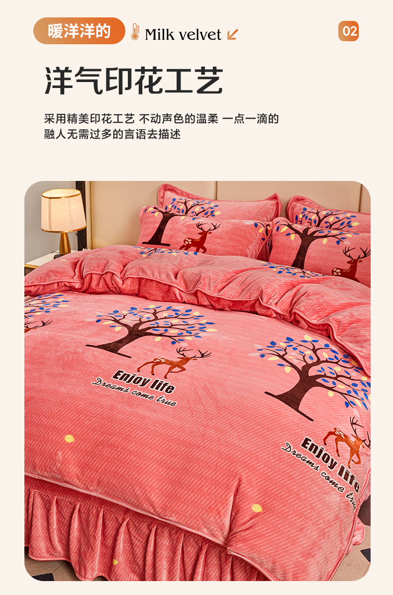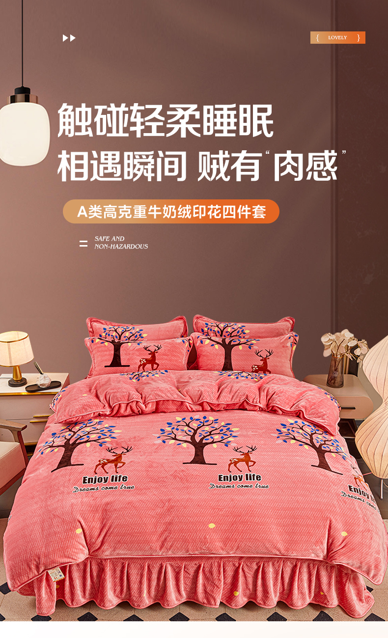当前位置: 91家纺网 > 商品网购 > 床品套件 > 四件套 > 牛奶绒四件套 > 博兰蒂 2025新款床裙款高克重牛奶绒印花四件套 发财鹿