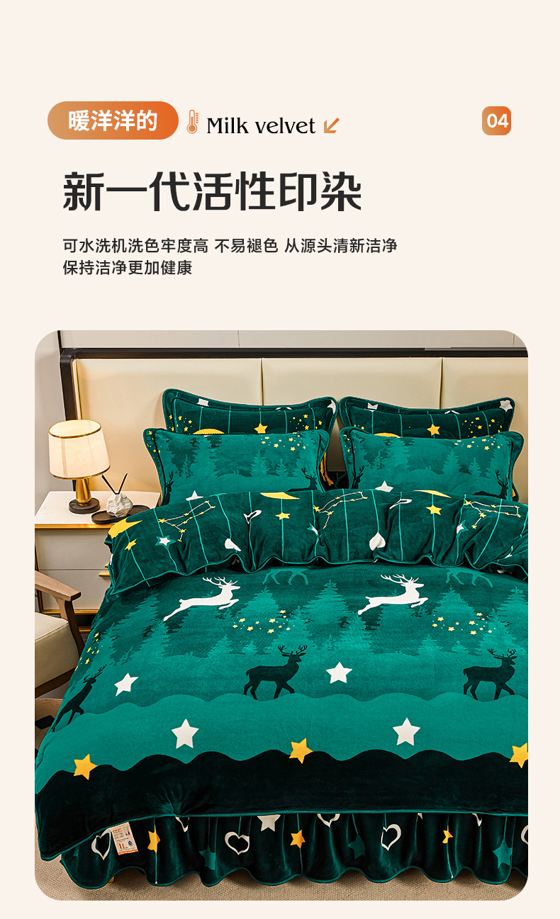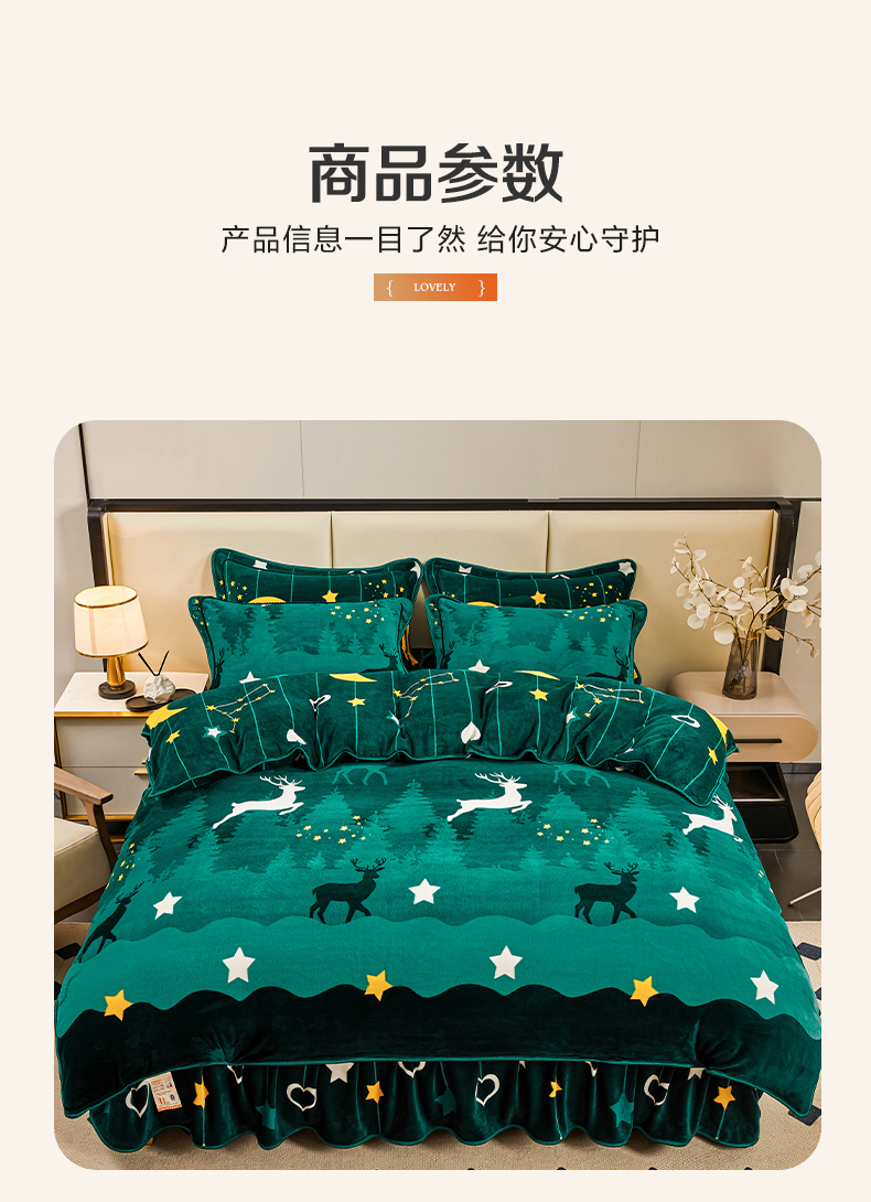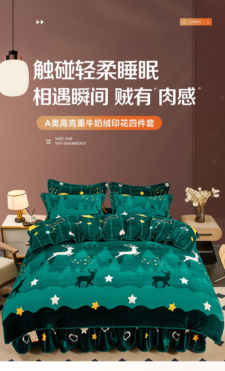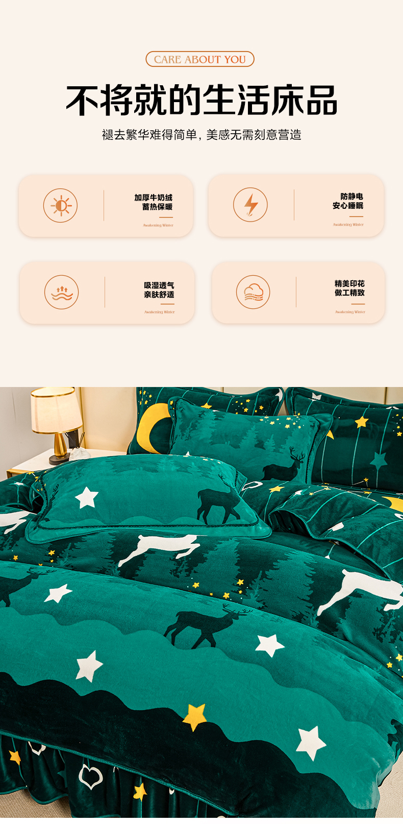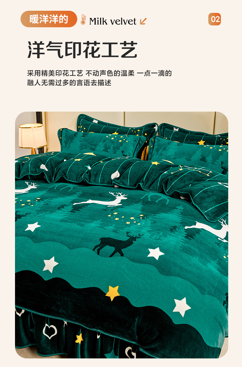 当前位置: 91家纺网 > 商品网购 > 床品套件 > 四件套 > 牛奶绒四件套 > 博兰蒂 2025新款床裙款高克重牛奶绒印花四件套 迷情鹿