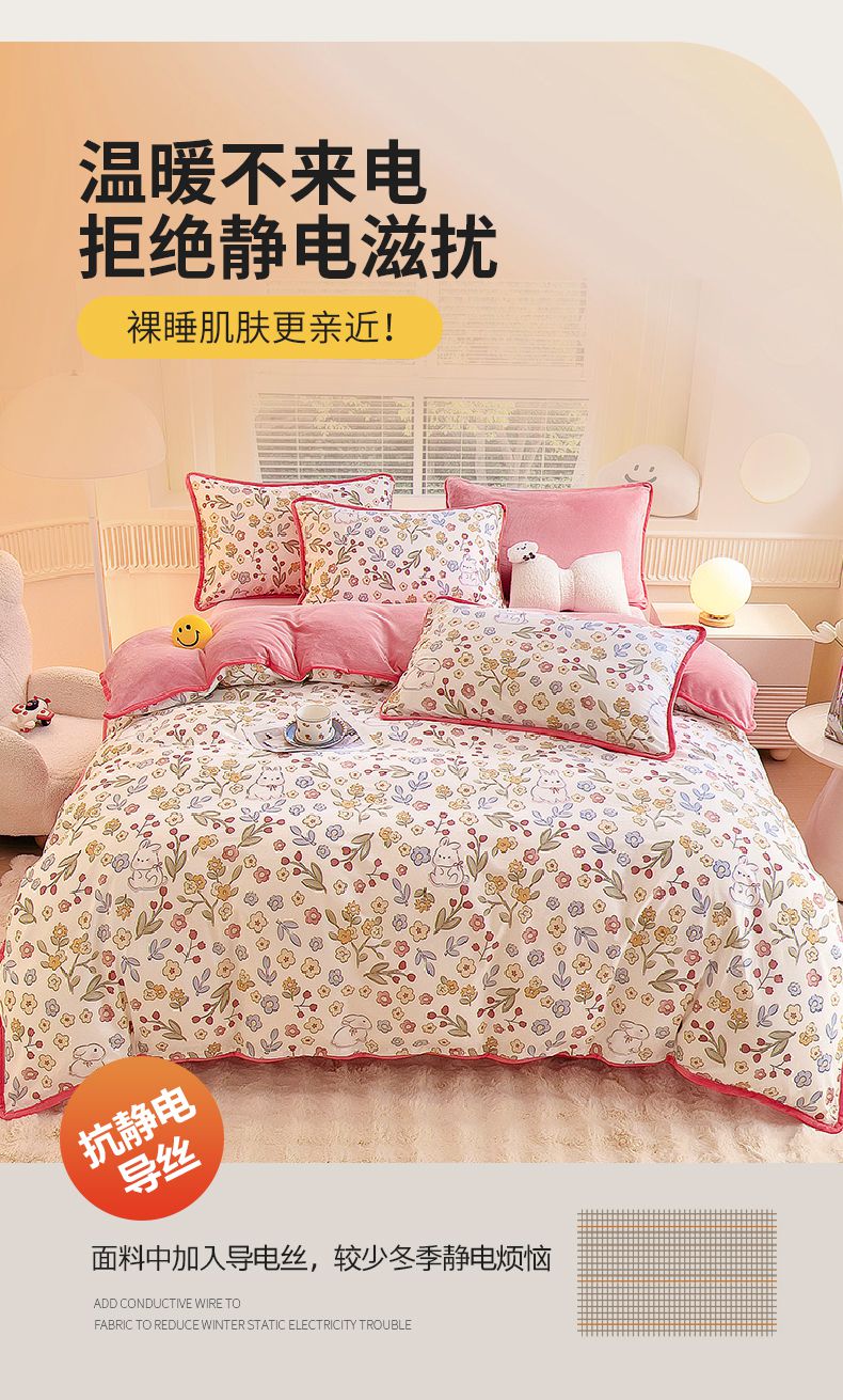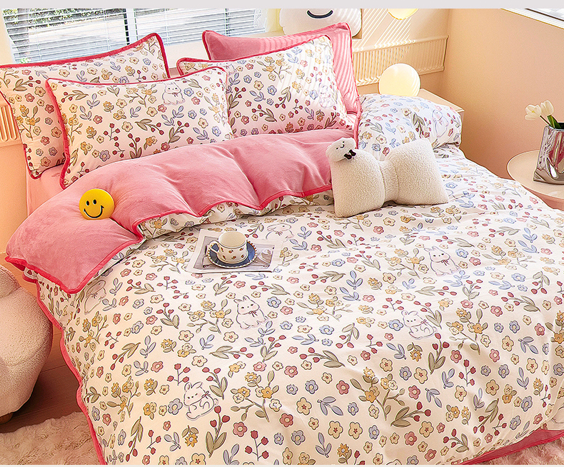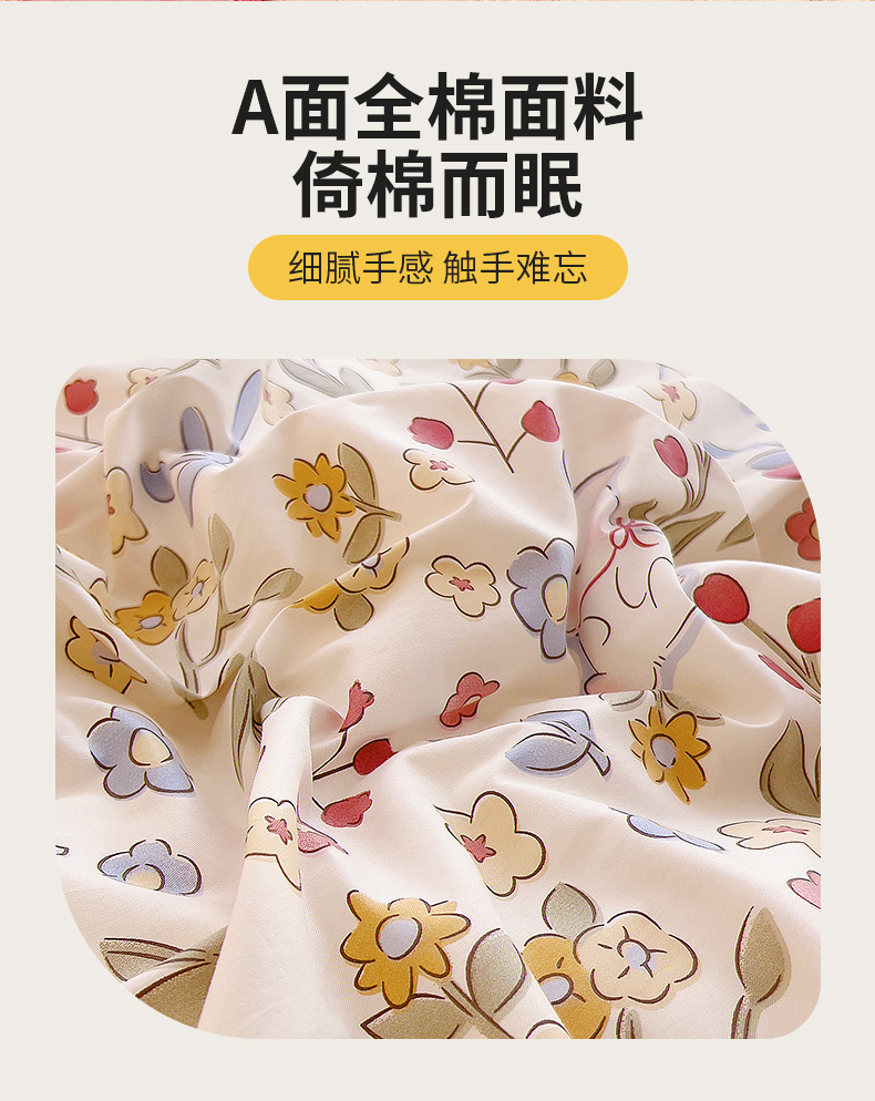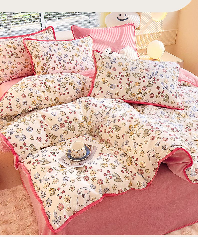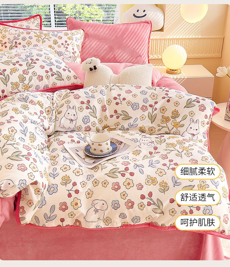 当前位置: 91家纺网 > 商品网购 > 床品套件 > 四件套 > 牛奶绒四件套 > 2024新款全棉加牛奶绒四件套单被套系列-四件套 花语小兔