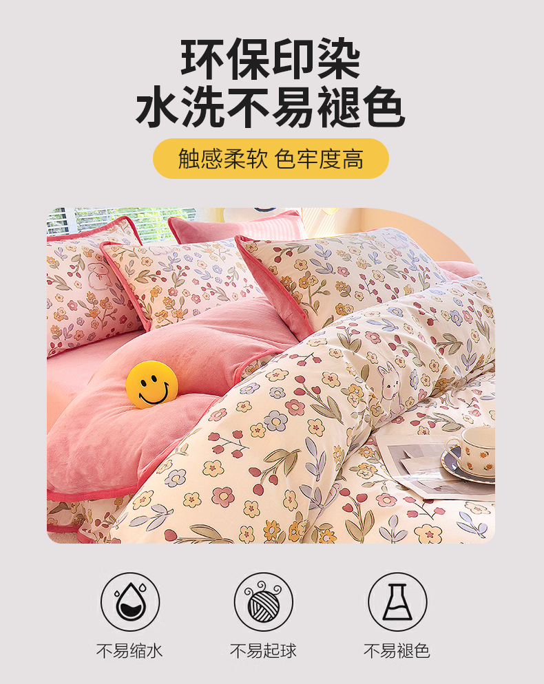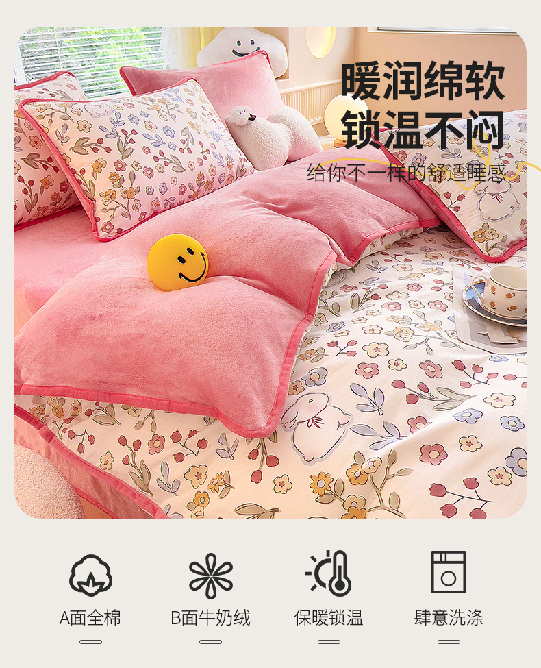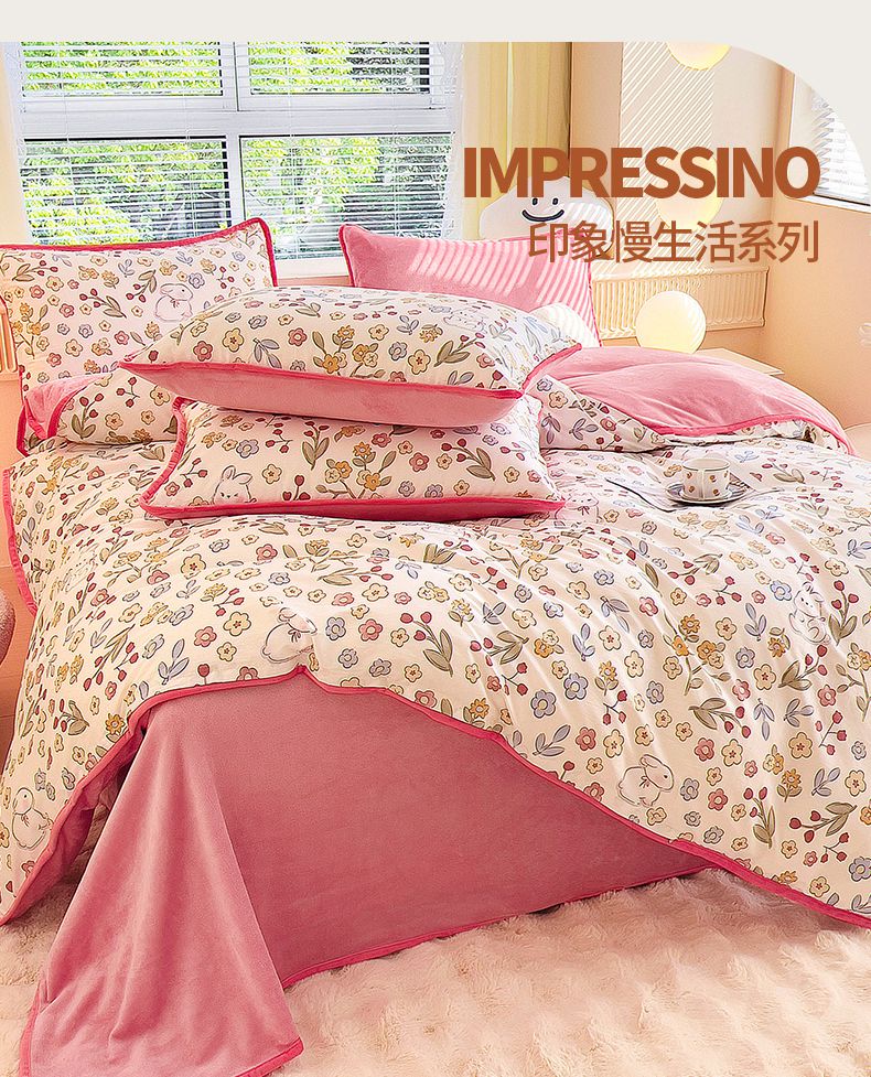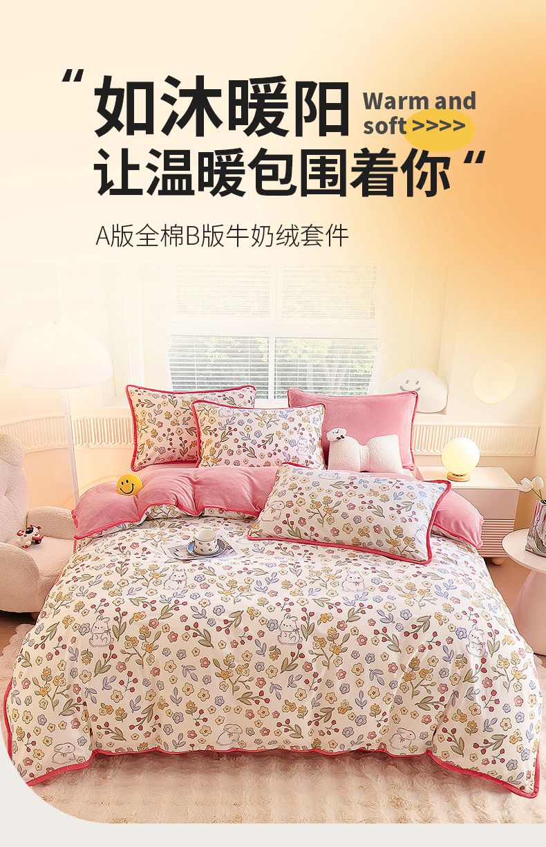 当前位置: 91家纺网 > 商品网购 > 床品套件 > 四件套 > 牛奶绒四件套 > 2024新款全棉加牛奶绒四件套单被套系列-四件套 花语小兔