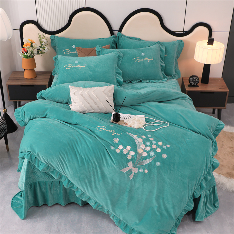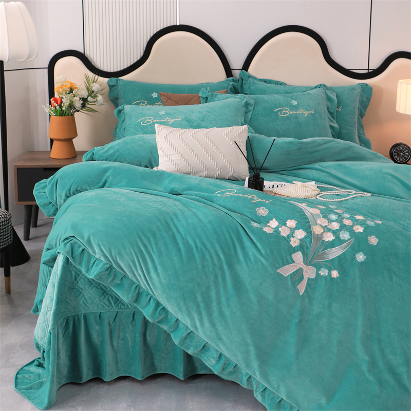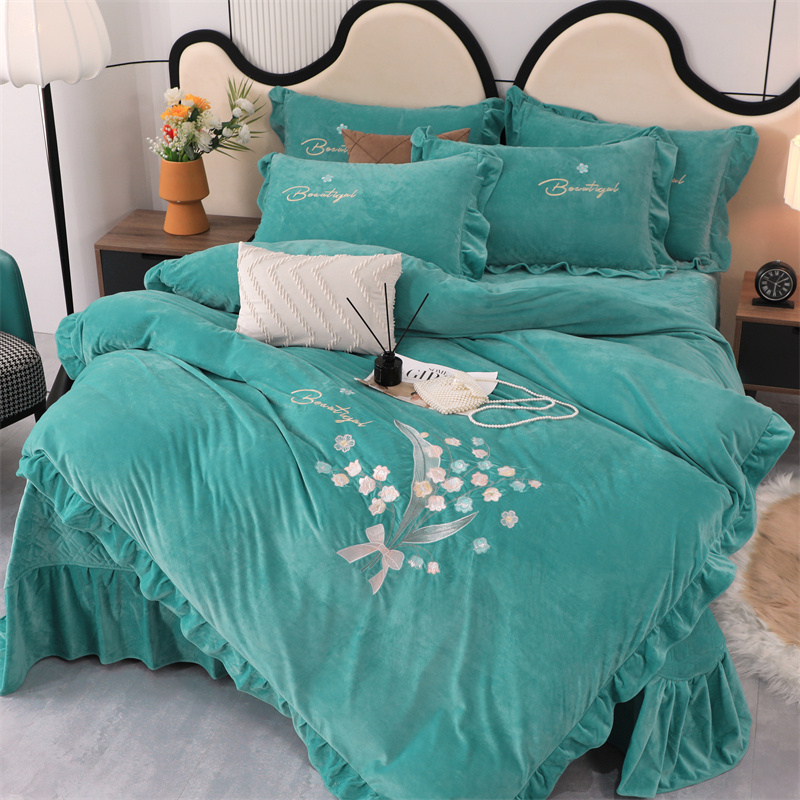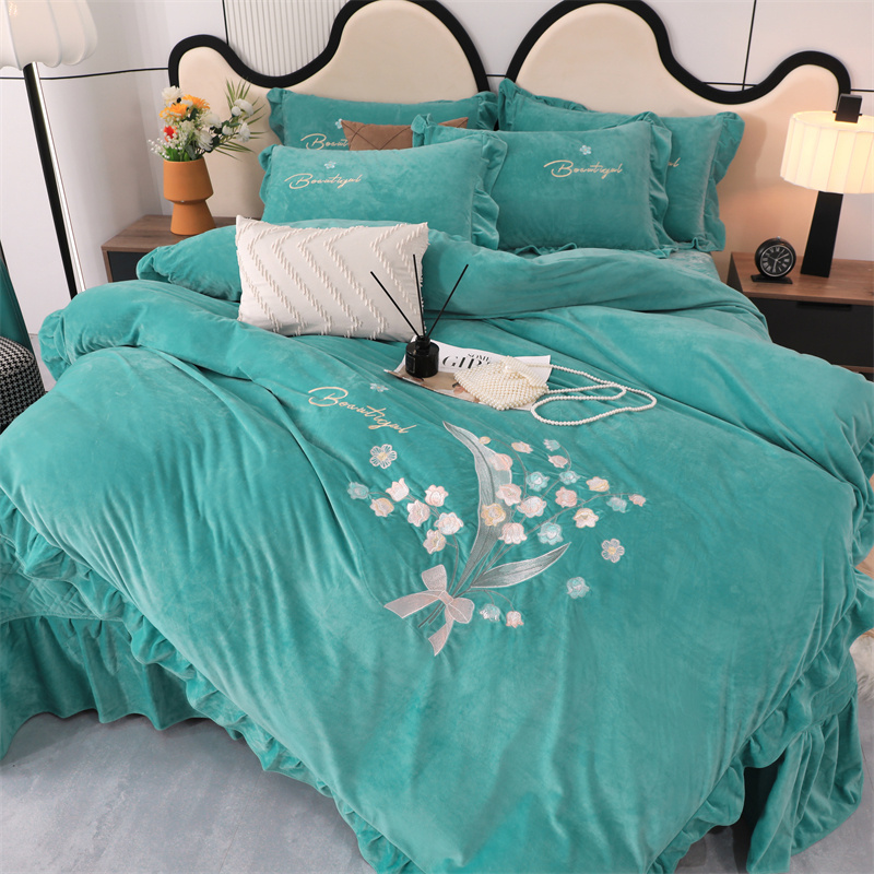 商品名称:卡迪亚家纺 2024新款宝宝绒绣花床盖款四件套-铃兰花 湖蓝