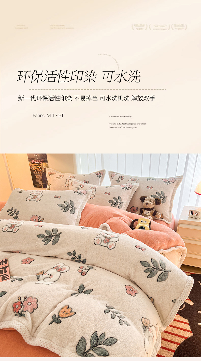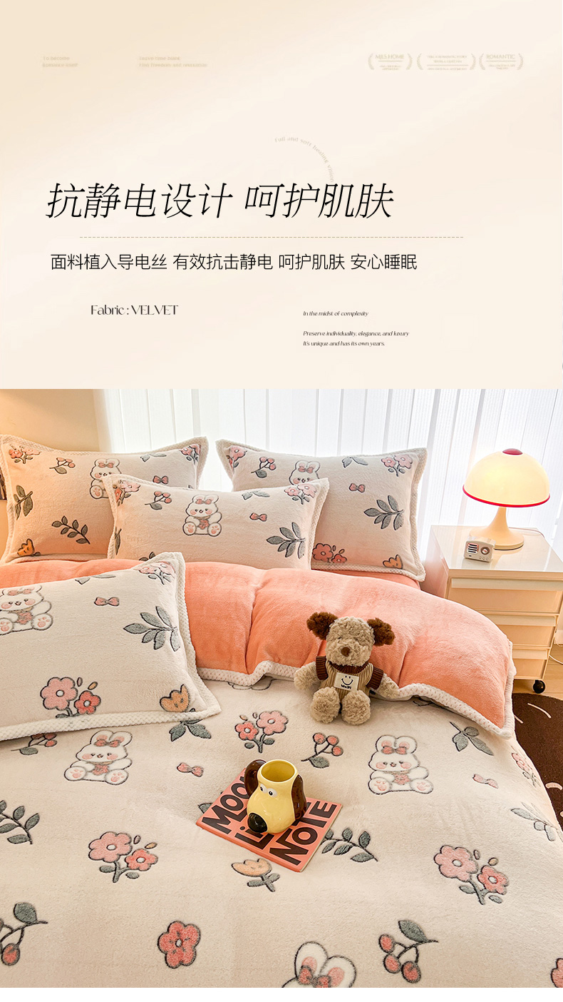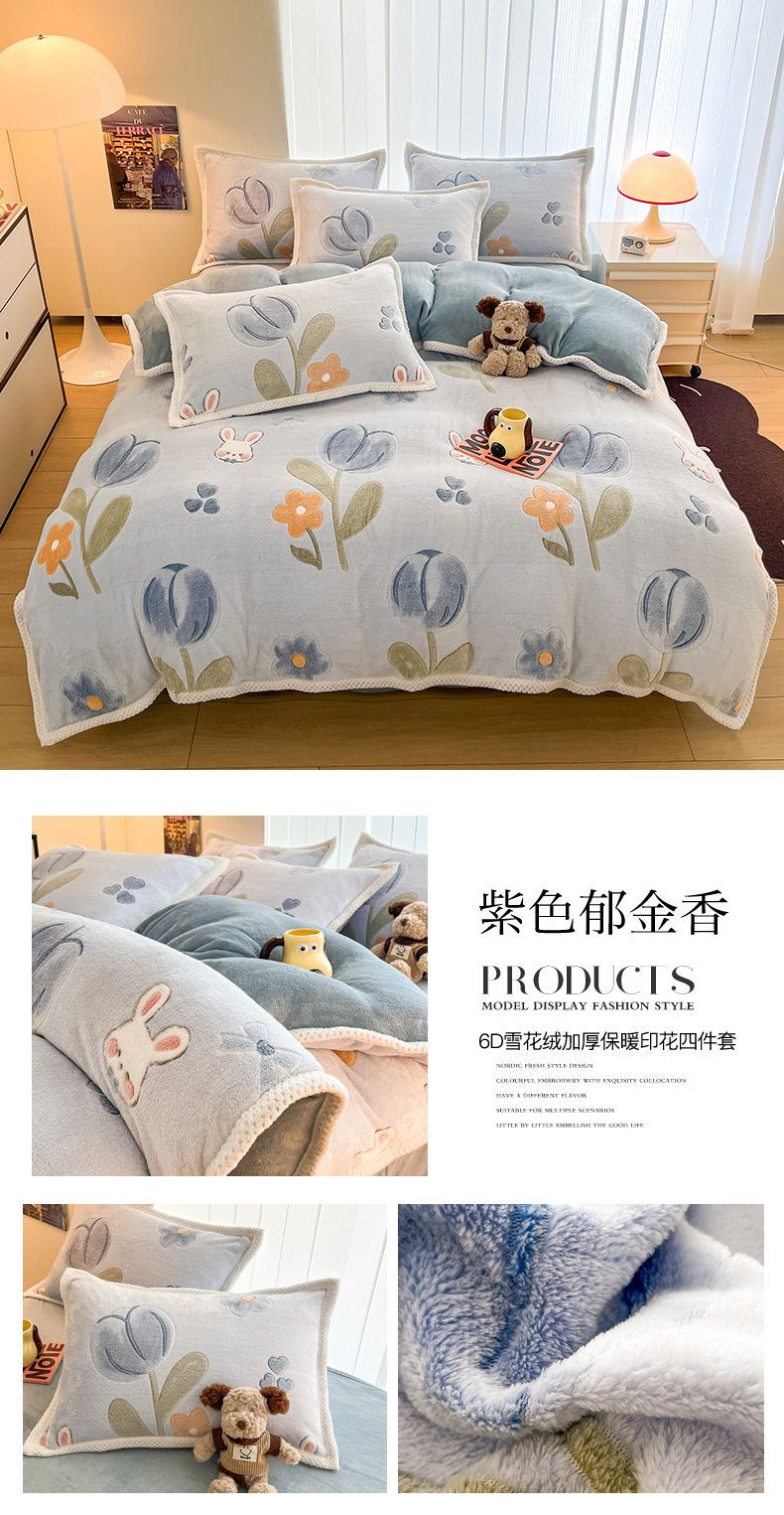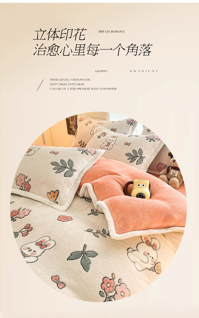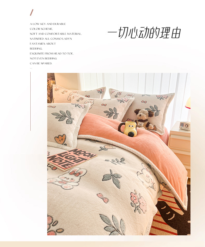 当前位置: 91家纺网 > 商品网购 > 床品套件 > 四件套 > 其它四件套 > 倾慕家纺 2024新款加厚保暖6D立体雪花绒系列-四件套 萌萌兔