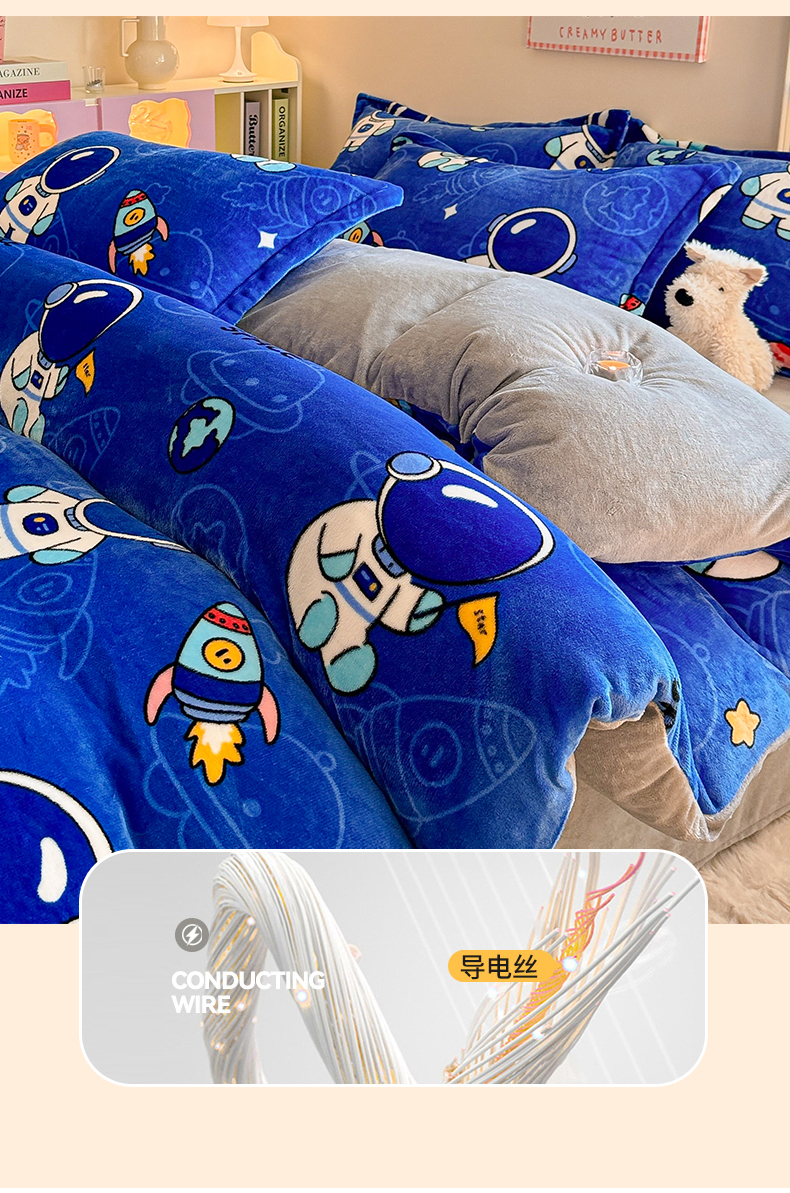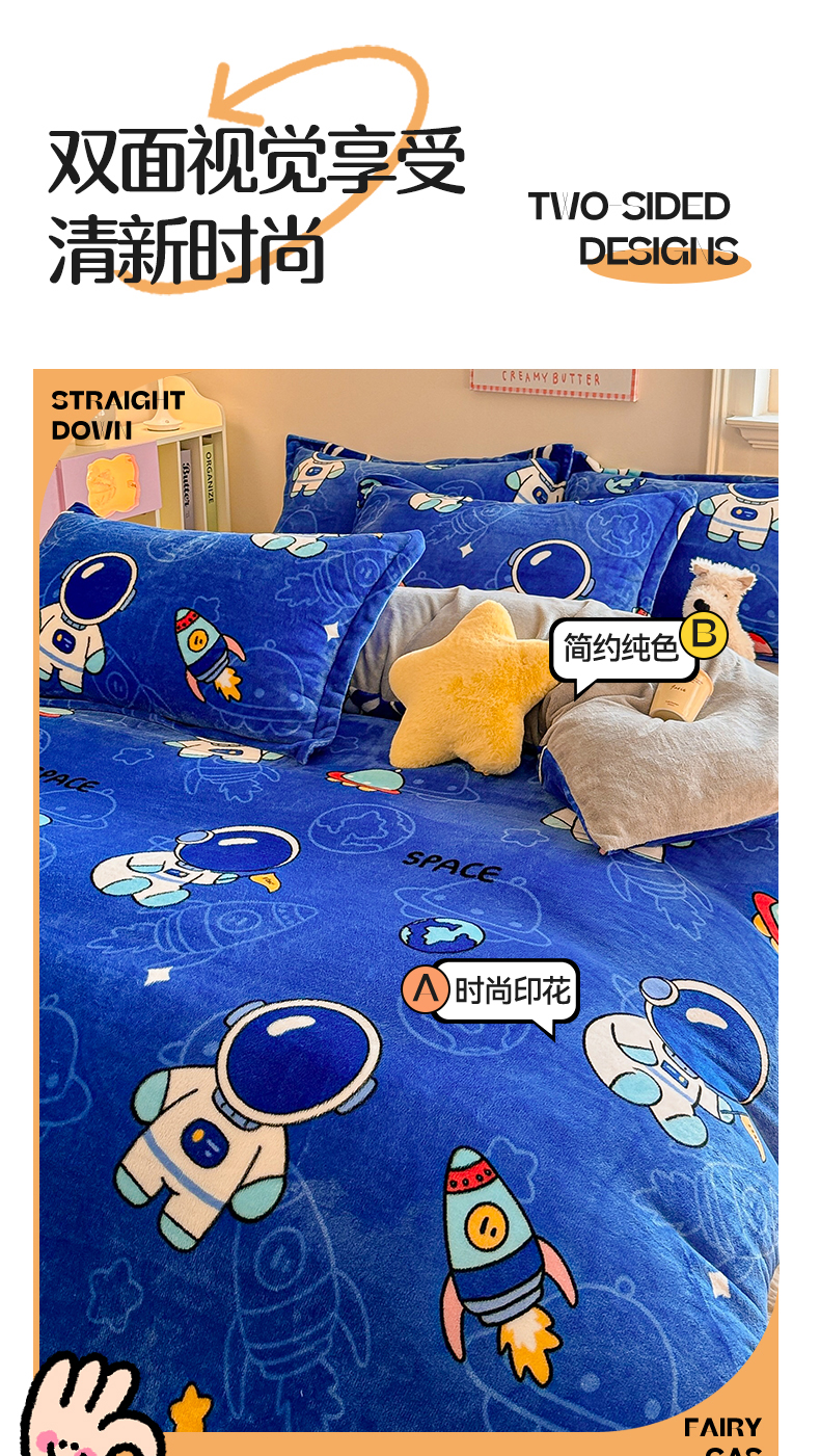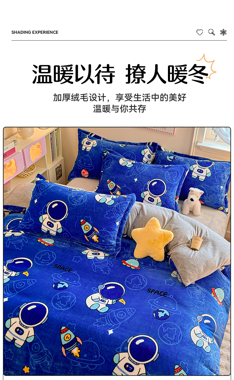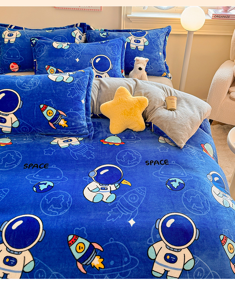 当前位置: 91家纺网 > 商品网购 > 床品套件 > 四件套 > 牛奶绒四件套 > 名兮 2024新款卡通时尚风高克重牛奶绒四件套 太空人
