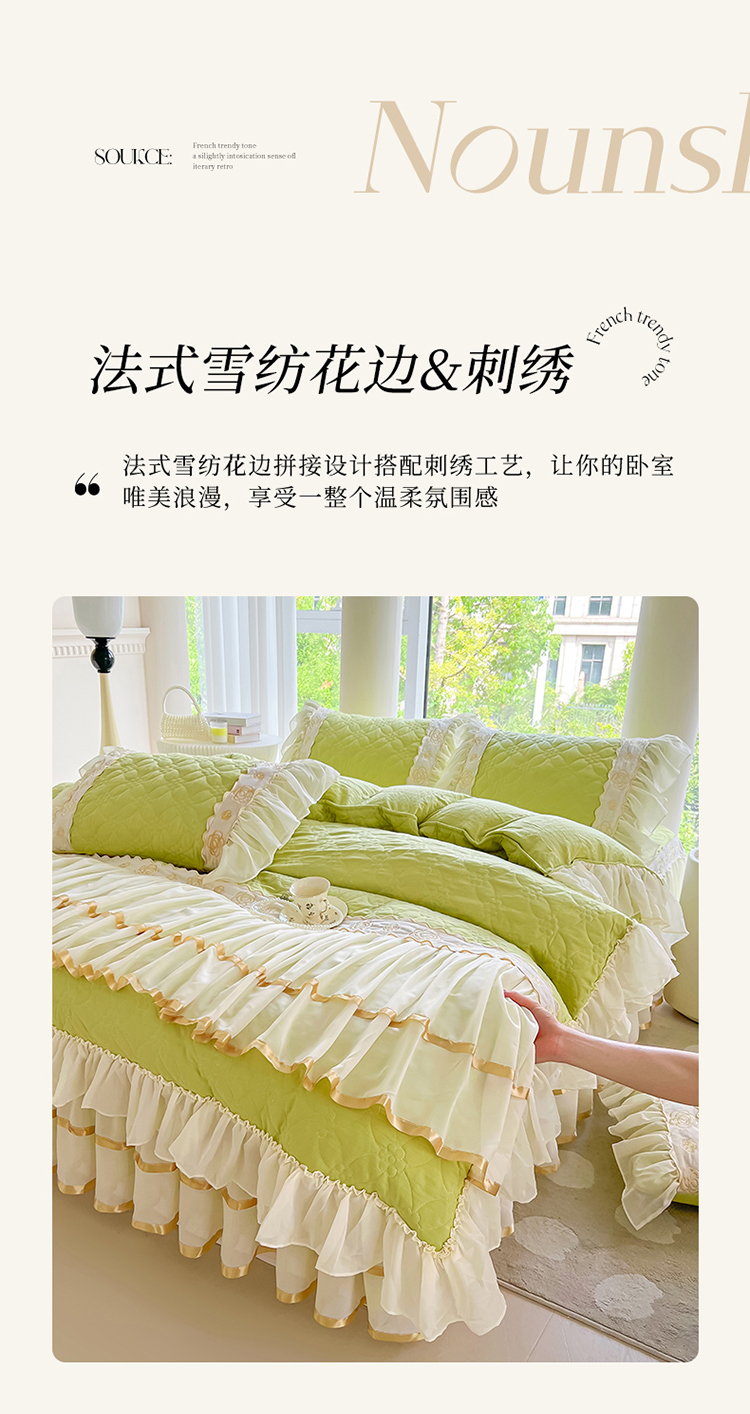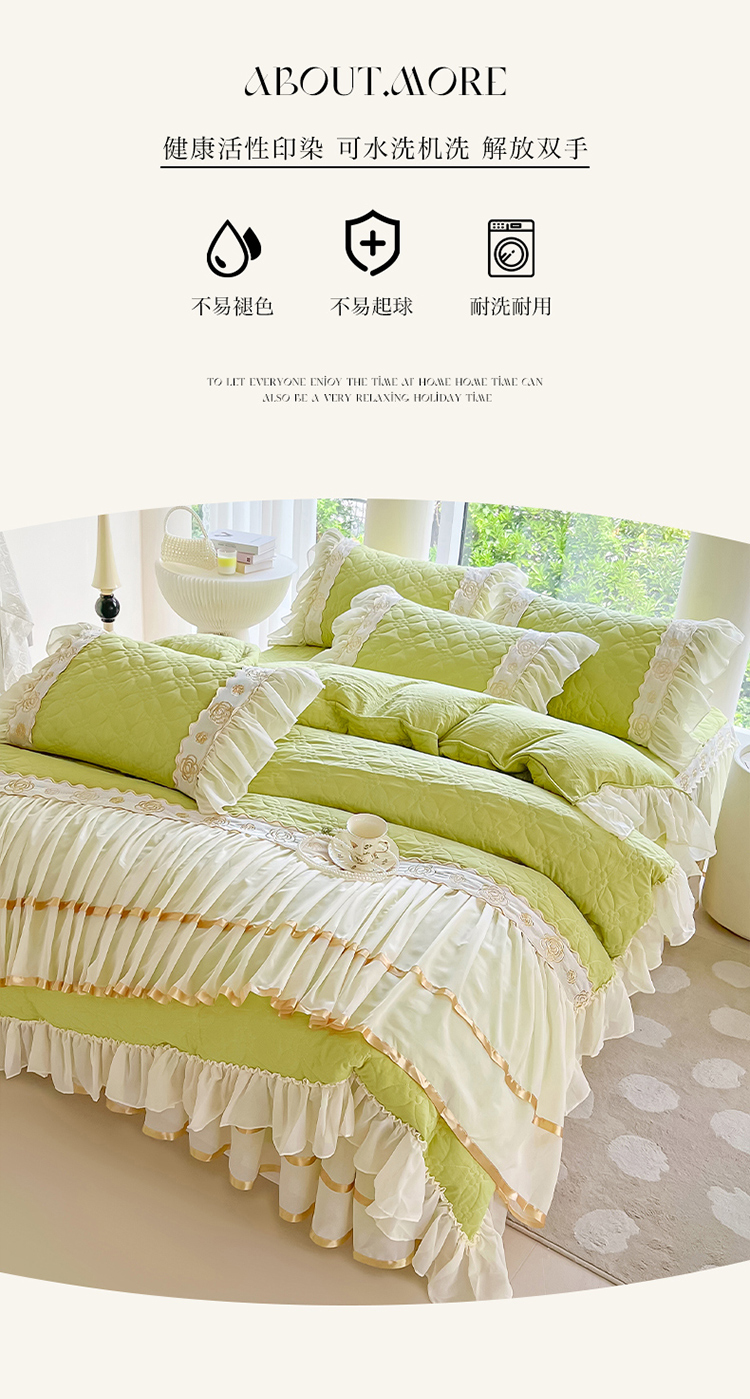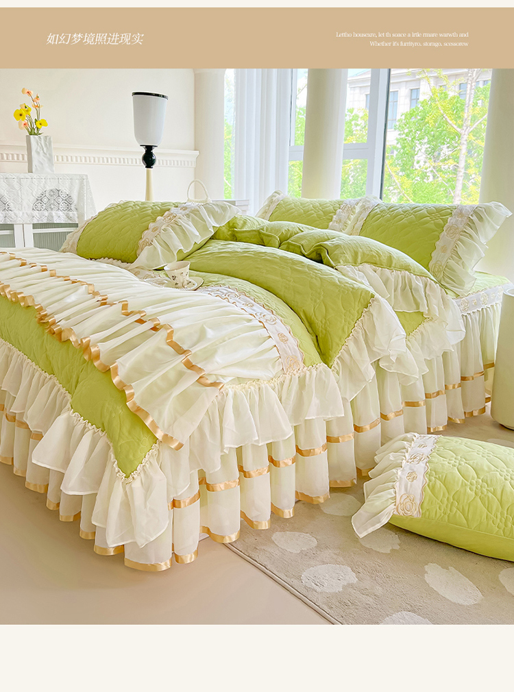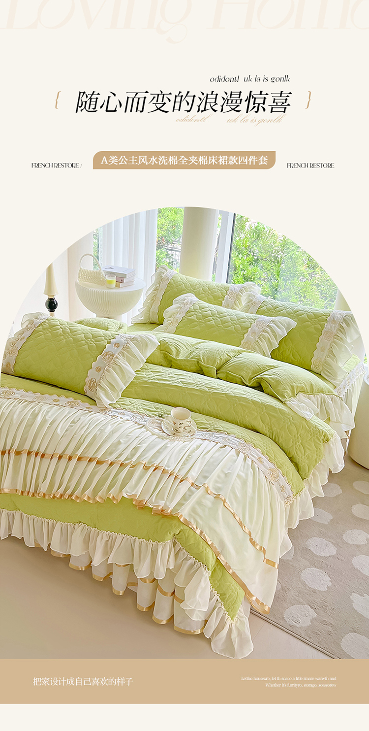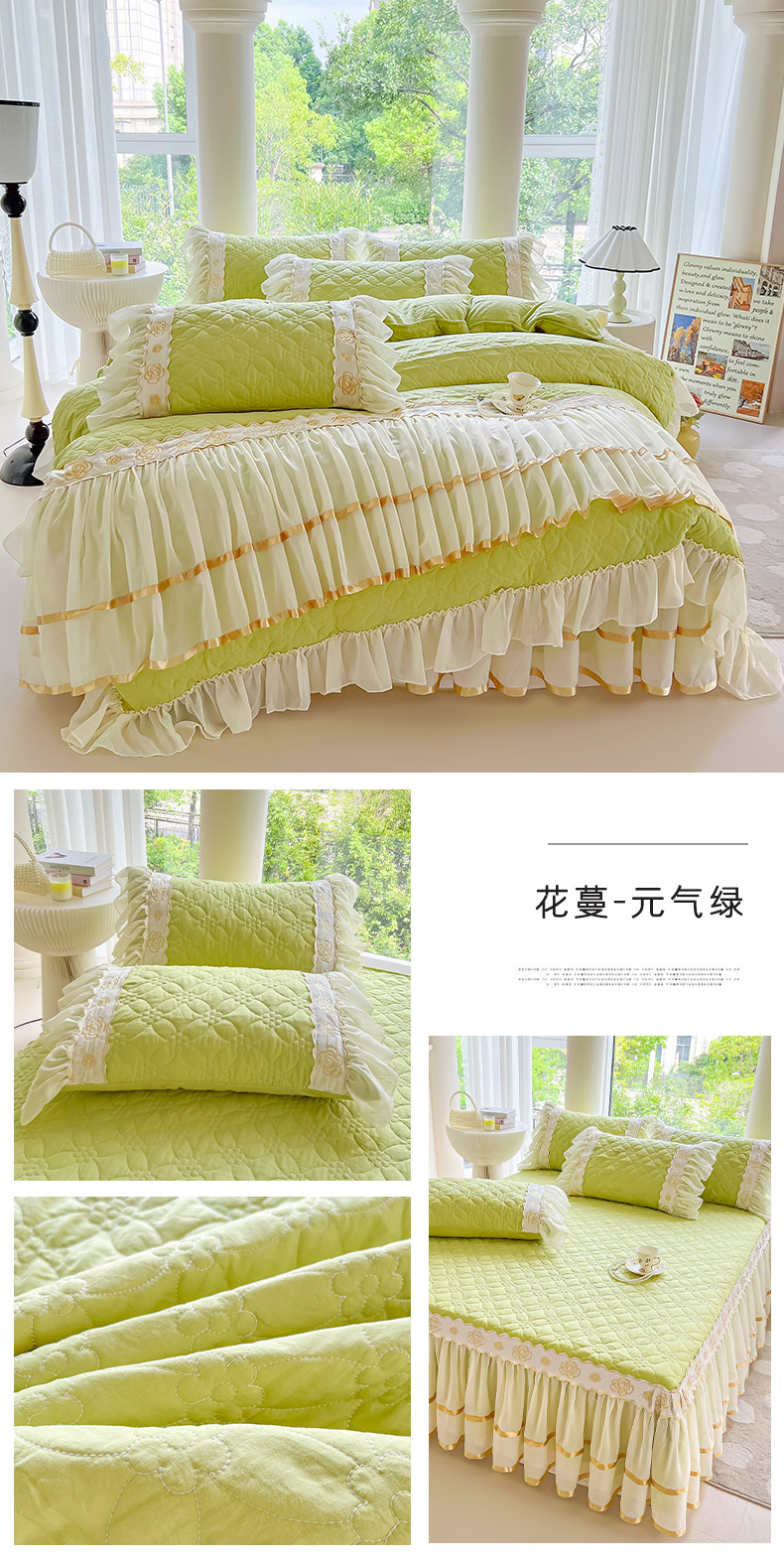 当前位置: 91家纺网 > 商品网购 > 床品套件 > 四件套 > 其它四件套 > 罗艺轩 2024新款公主风水洗棉夹棉床裙款四件套-花蔓花蔓-元气绿