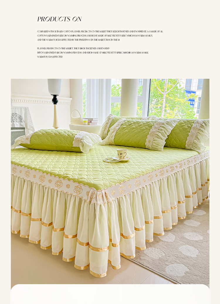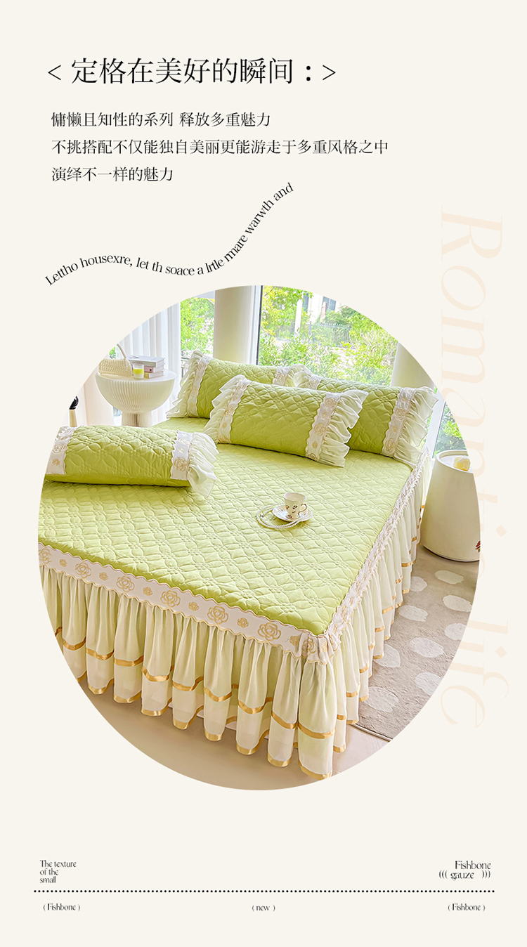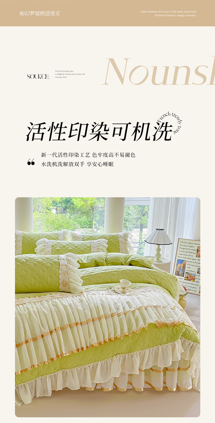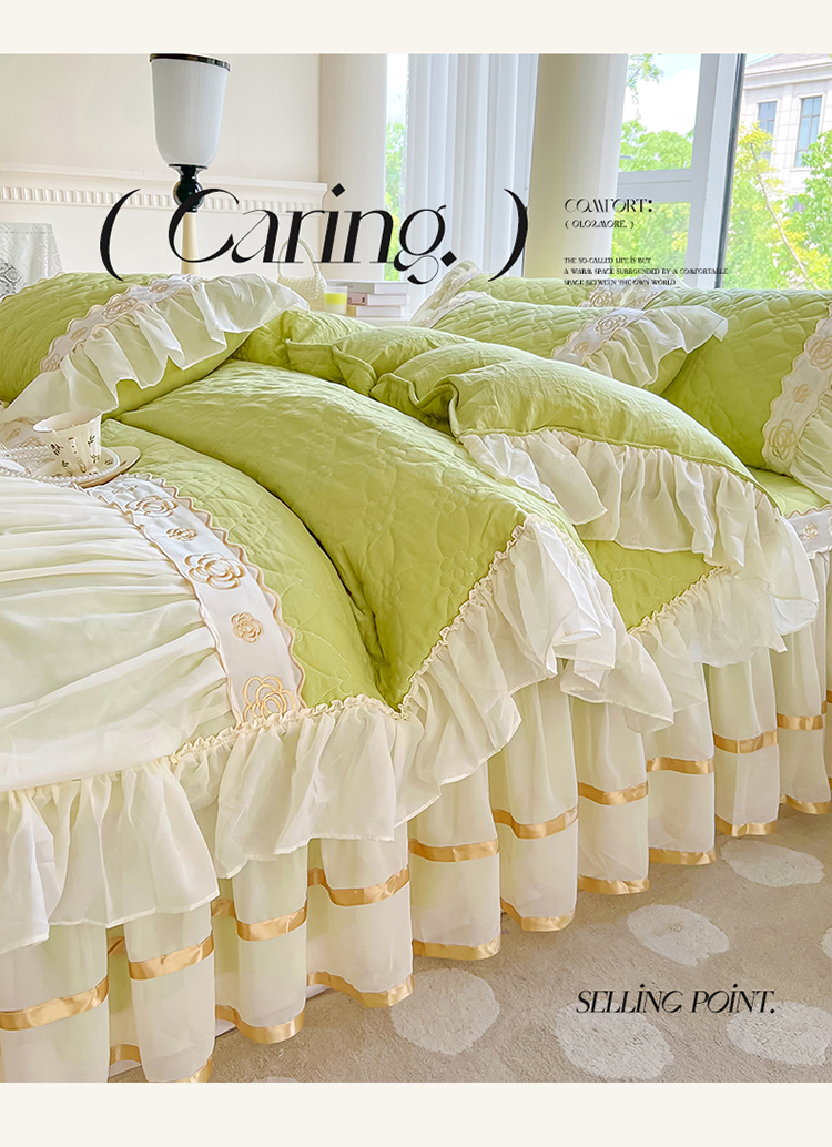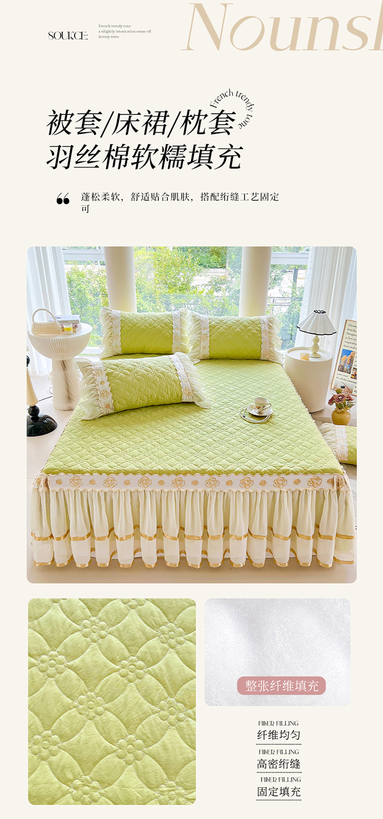 当前位置: 91家纺网 > 商品网购 > 床品套件 > 四件套 > 其它四件套 > 罗艺轩 2024新款公主风水洗棉夹棉床裙款四件套-花蔓花蔓-元气绿