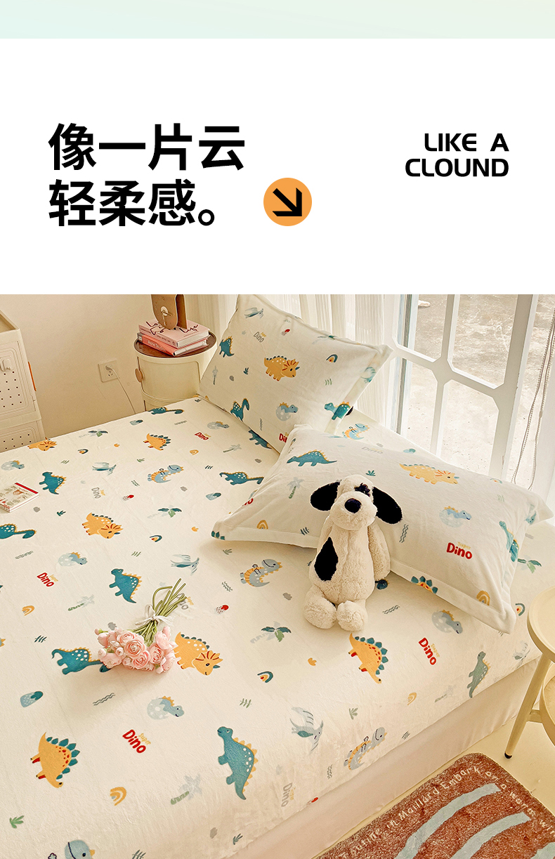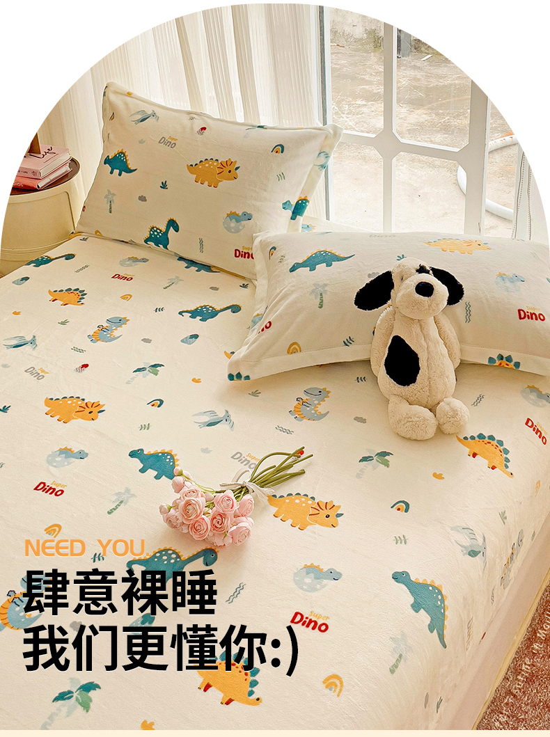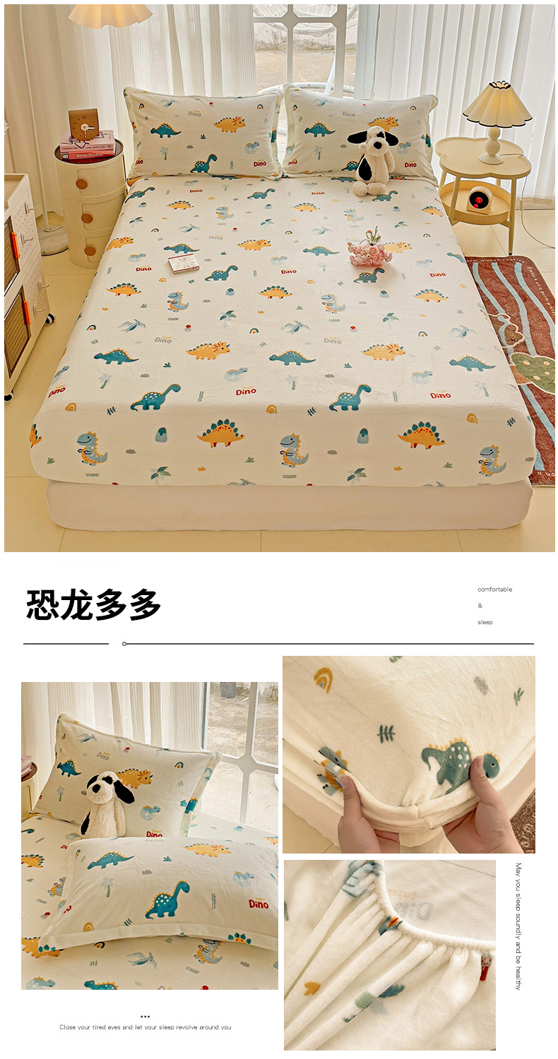 • 91家纺网 家纺一手货源 找家纺 名兮 2024卡通时尚风高克重牛奶绒床笠 恐龙多多