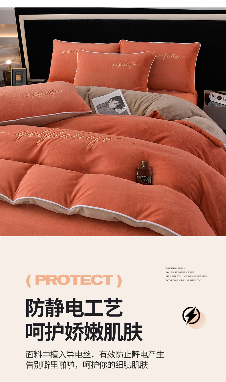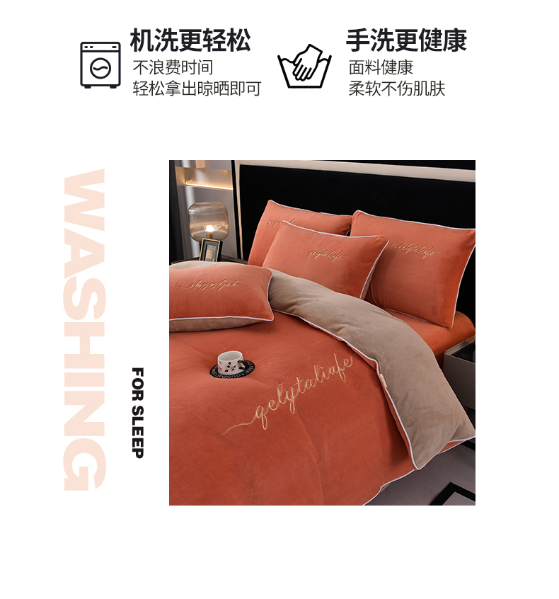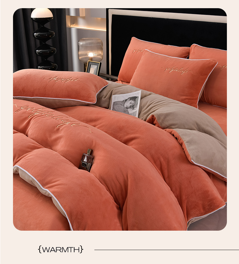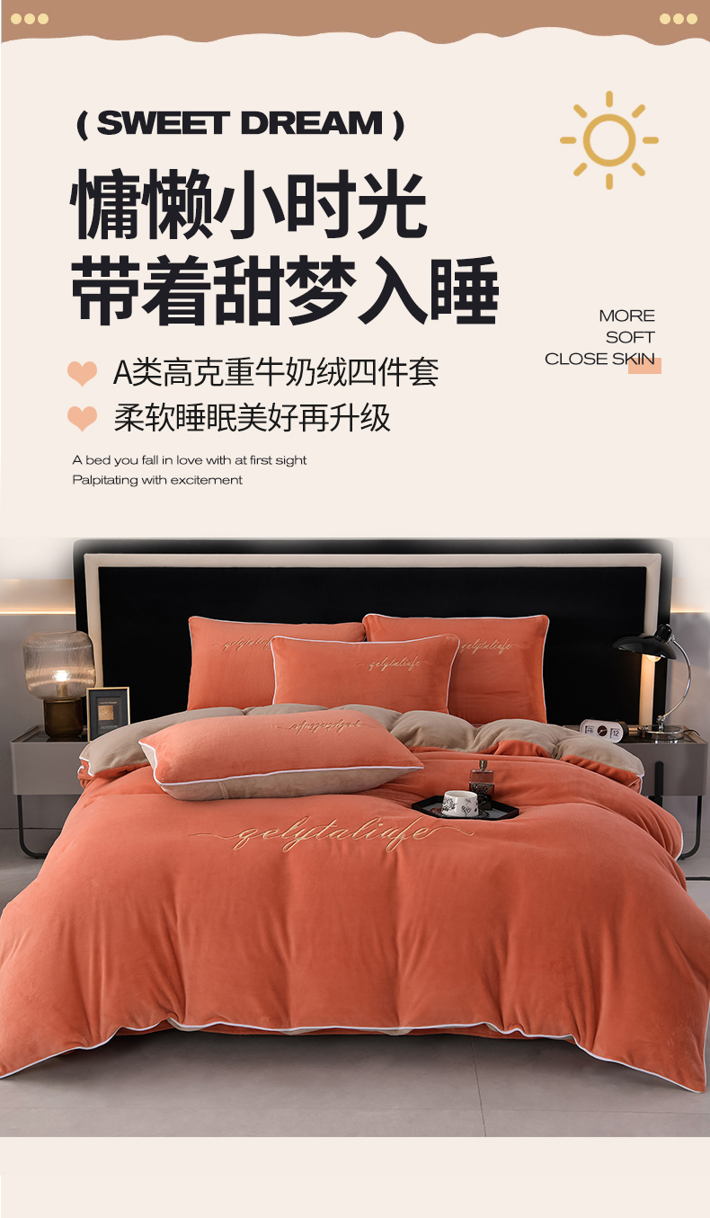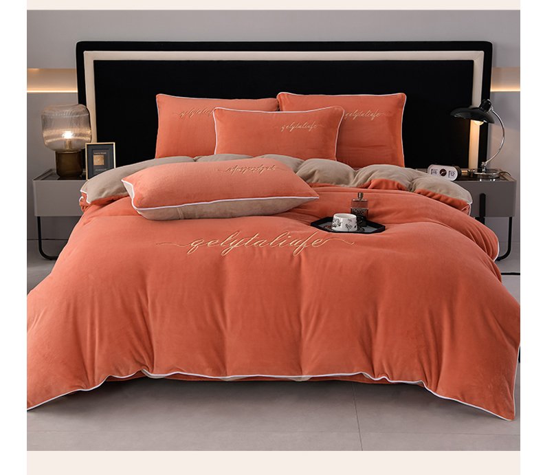 氧家 2024新款宽边撞色对角牛奶绒绣花四件套--典雅 典雅-橙橘色