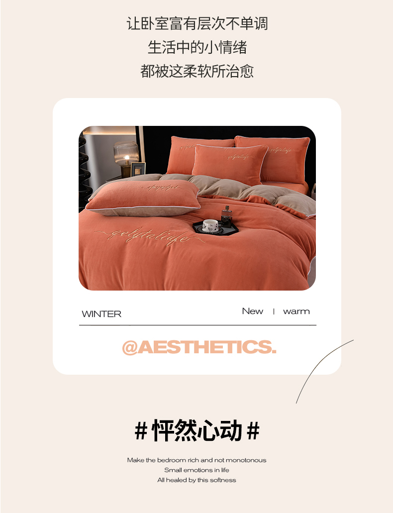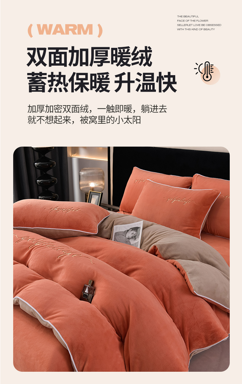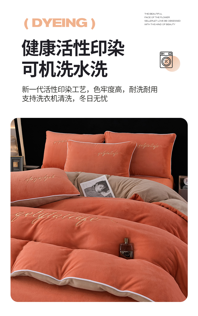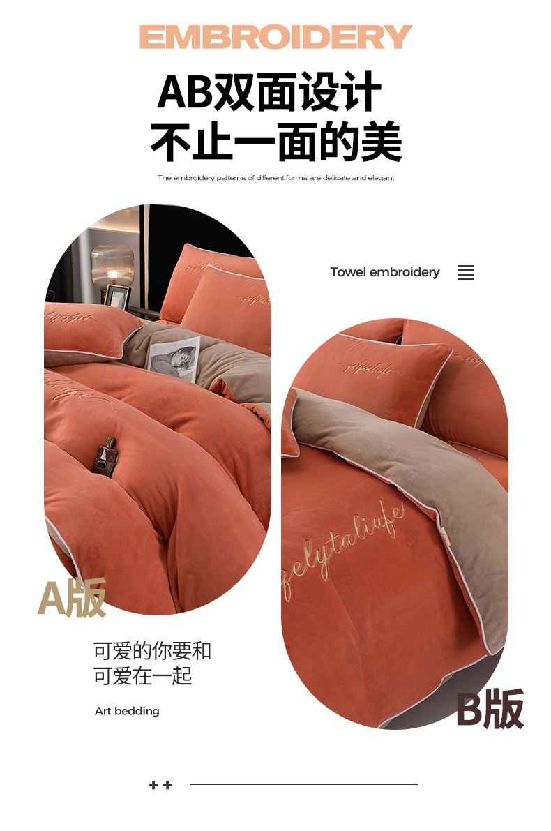 氧家 2024新款宽边撞色对角牛奶绒绣花四件套--典雅 典雅-橙橘色