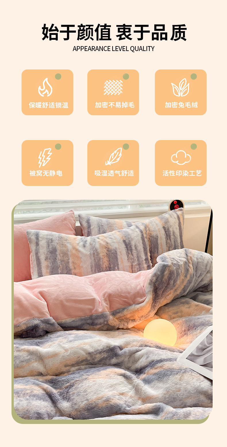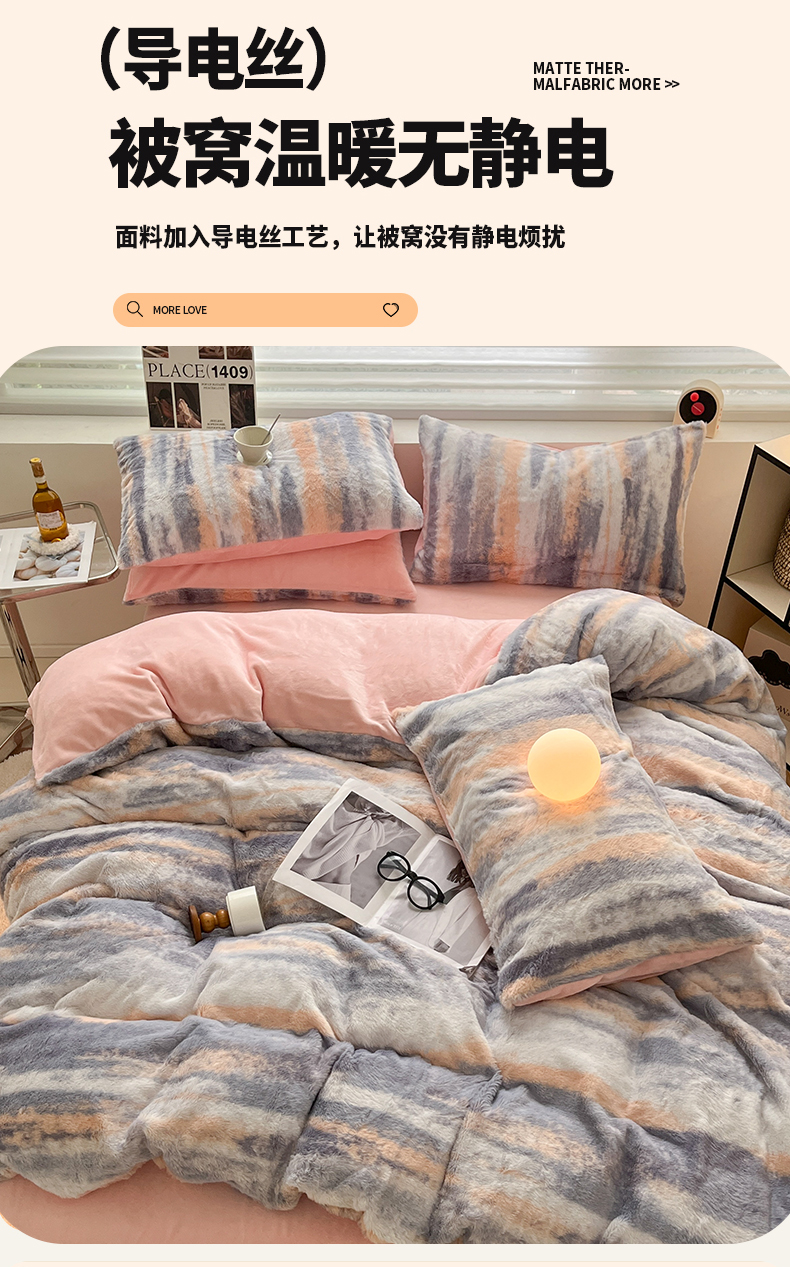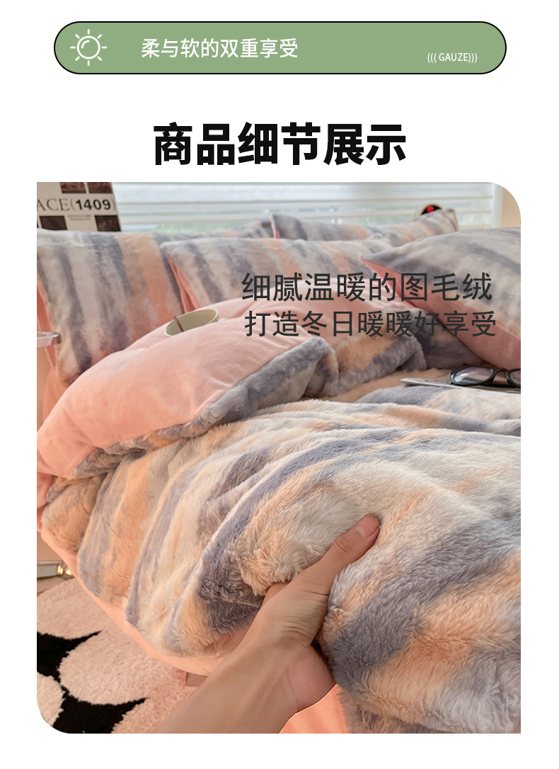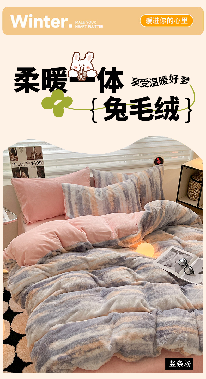 商品名称:金爱家 2024新款立体牛奶绒兔毛绒印花四件套 兔毛印花-竖条粉