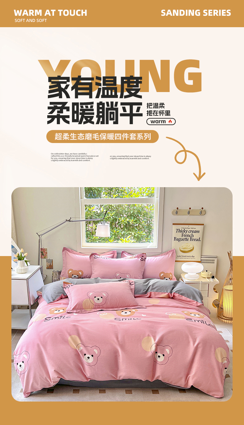 (总)品乐家纺 2025秋冬新款糯米绒缇肤绒印花贝壳边四件套,卡拉-灰,开心熊-米,南笙-咖,南笙-绿,浅夏-咖,素影-酒红,素影-紫,小樱桃-酒红,叶茂-驼