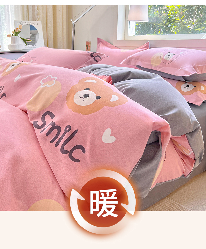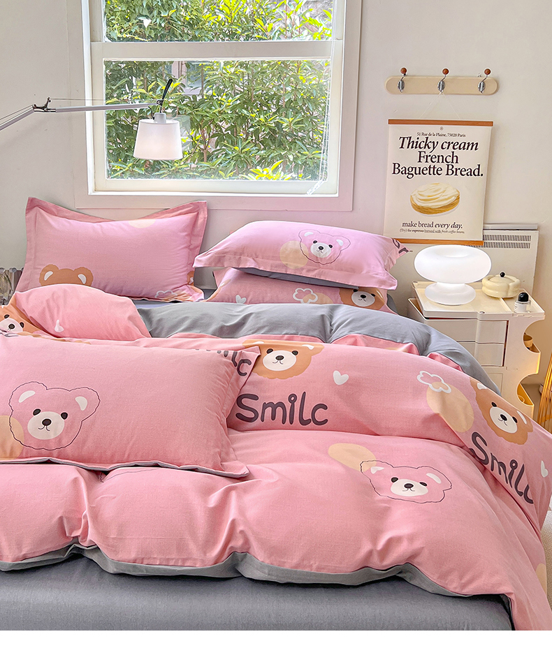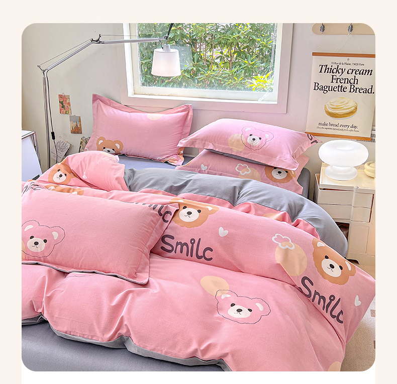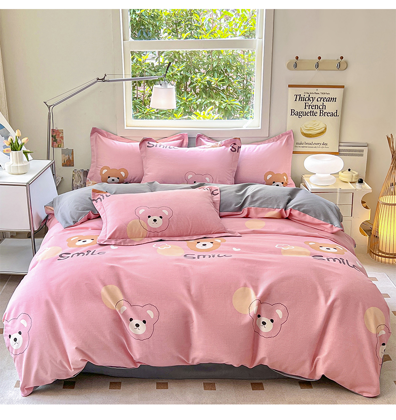 品乐家纺 2024新款全棉生态棉印花磨毛四件套 微笑熊-粉