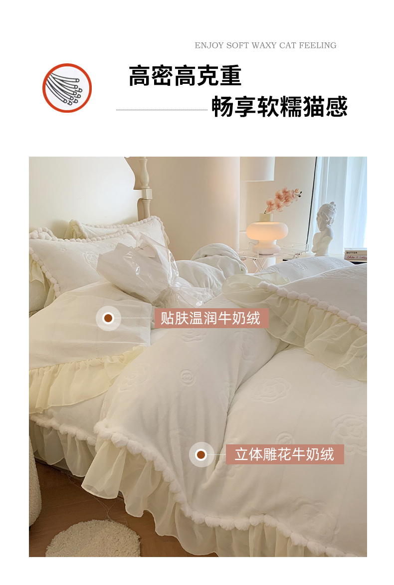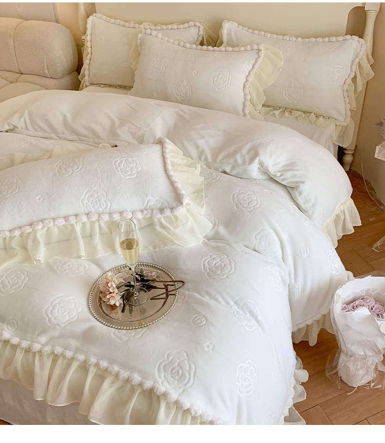 富盛家纺 2024新款牛奶绒雕花四件套韩版公主风四件套-依恋 依恋-白