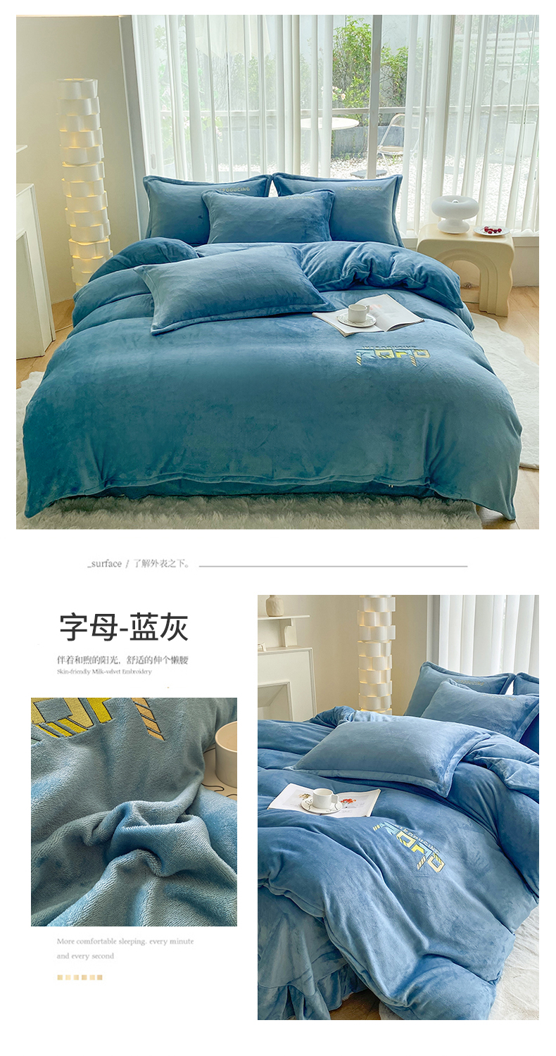 商品名称:美伦美焕 2024新款牛奶绒绣花四件套 字母-蓝灰