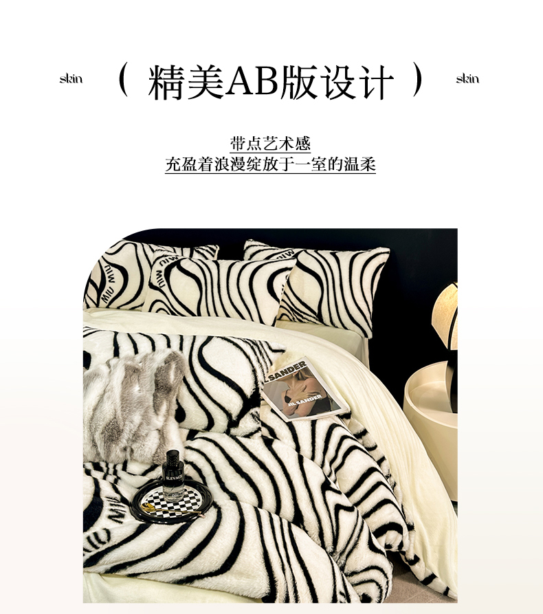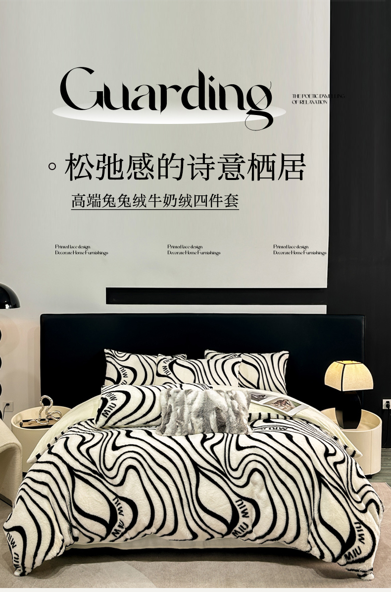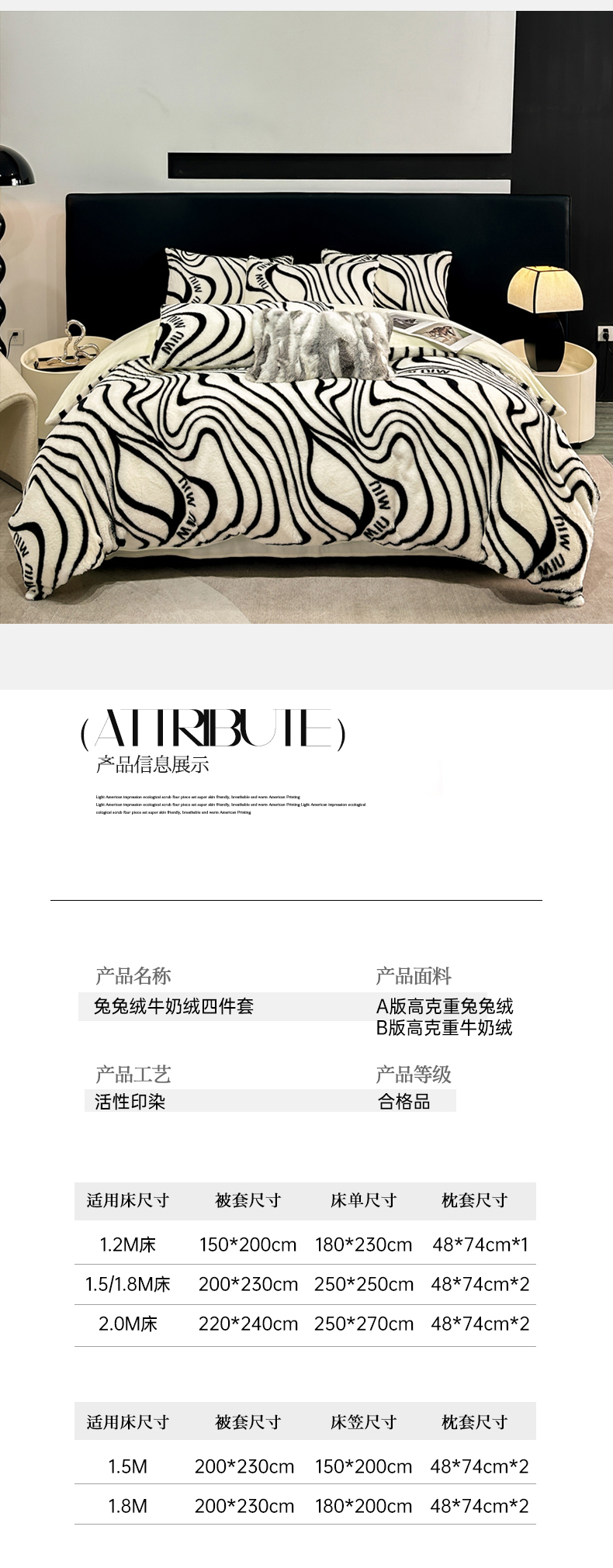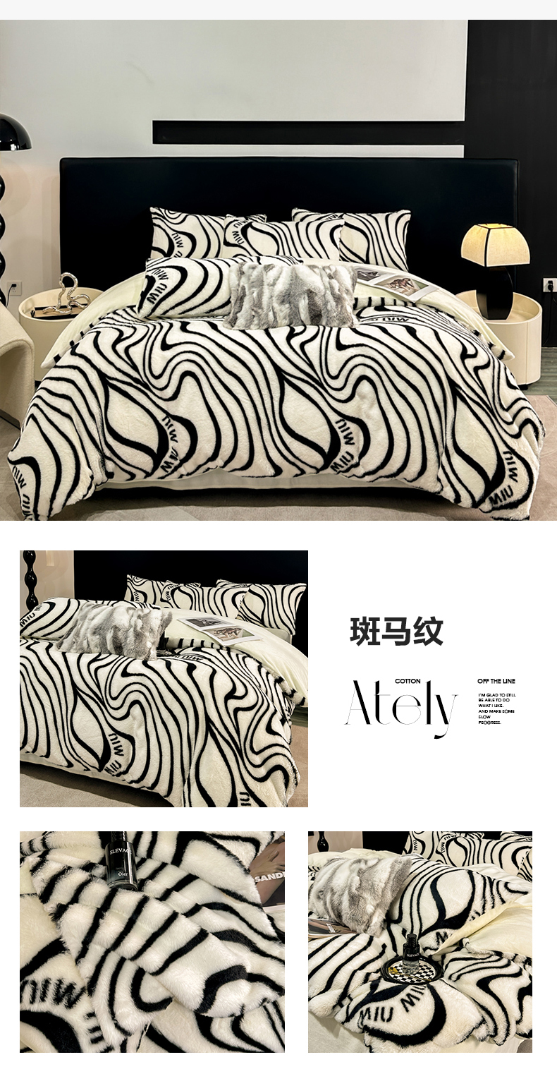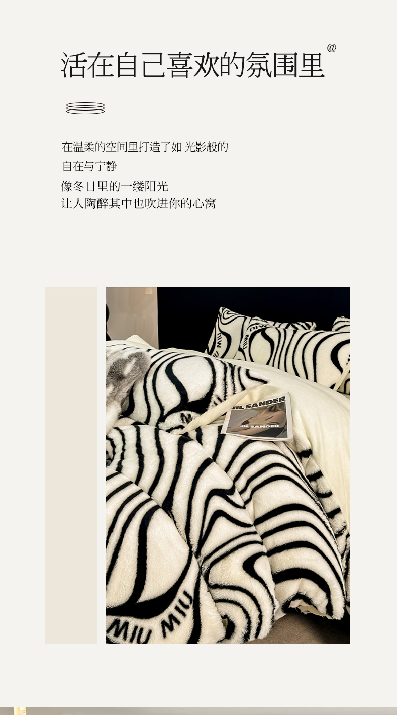 当前位置: 91家纺网 > 商品网购 > 床品套件 > 四件套 > 兔毛绒四件套 > 舒慕家纺 2025新款兔兔绒四件套 斑马纹