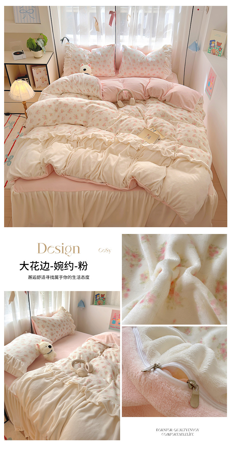 当前位置: 91家纺网 > 商品网购 > 床品套件 > 四件套 > 牛奶绒四件套 > 山茶家纺 2024新款高克重牛奶绒印花花边四件套-场景二 大花边-婉约-粉