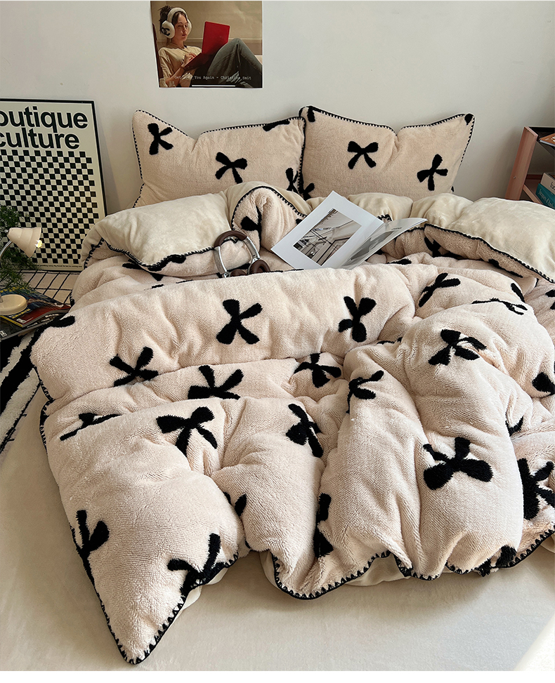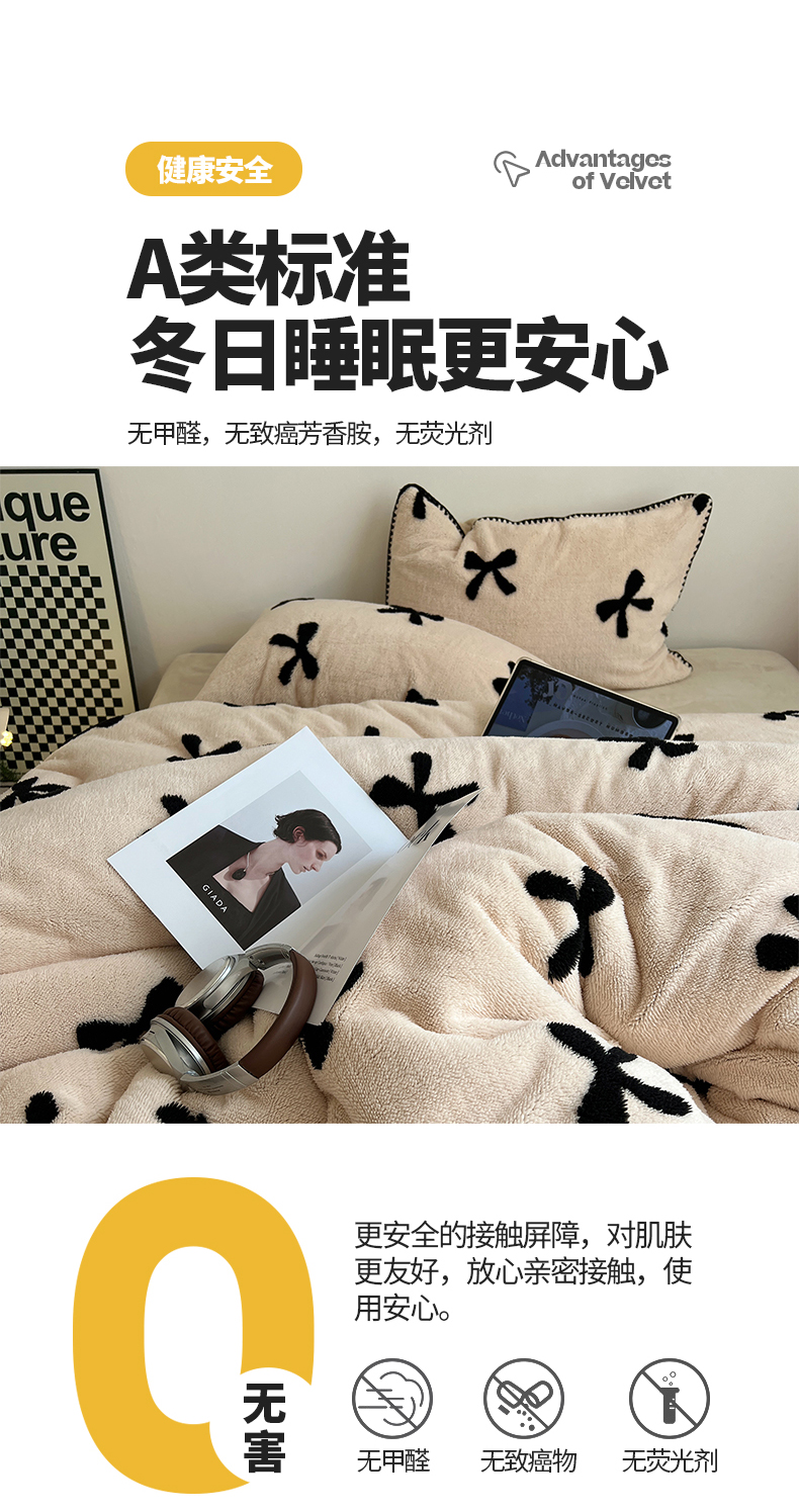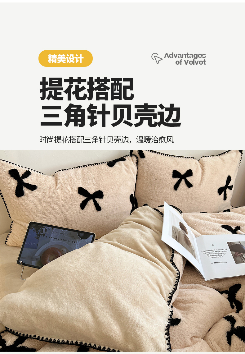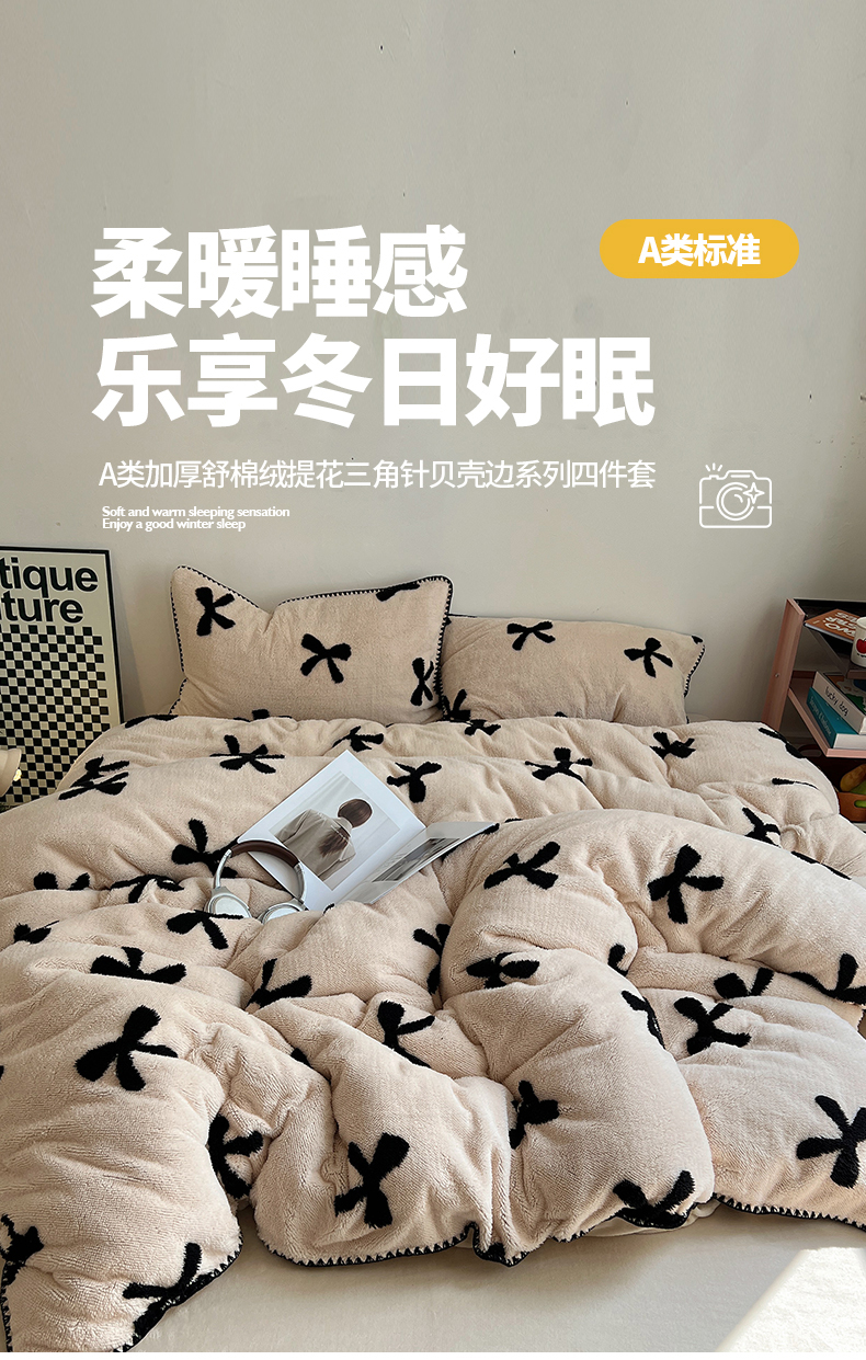 当前位置: 91家纺网 > 商品网购 > 床品套件 > 四件套 > 牛奶绒四件套 > 桃子家居 2024新款A类加厚美拉德温暖治愈风舒棉绒黑纱阳离子提花三角针贝壳边牛奶绒系列四件套 绒三角针-美拉德蝴蝶结