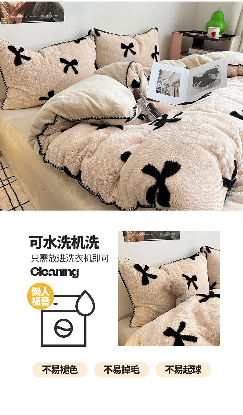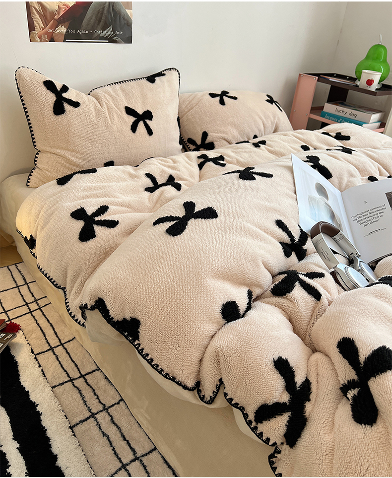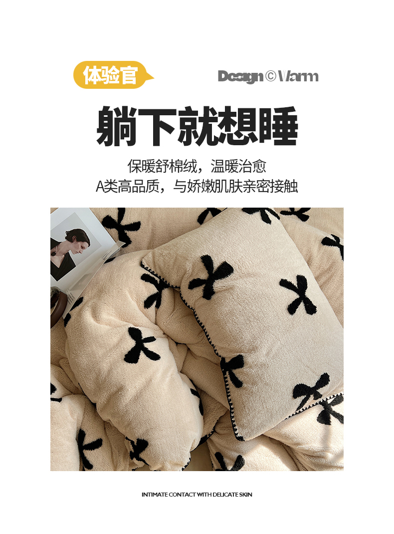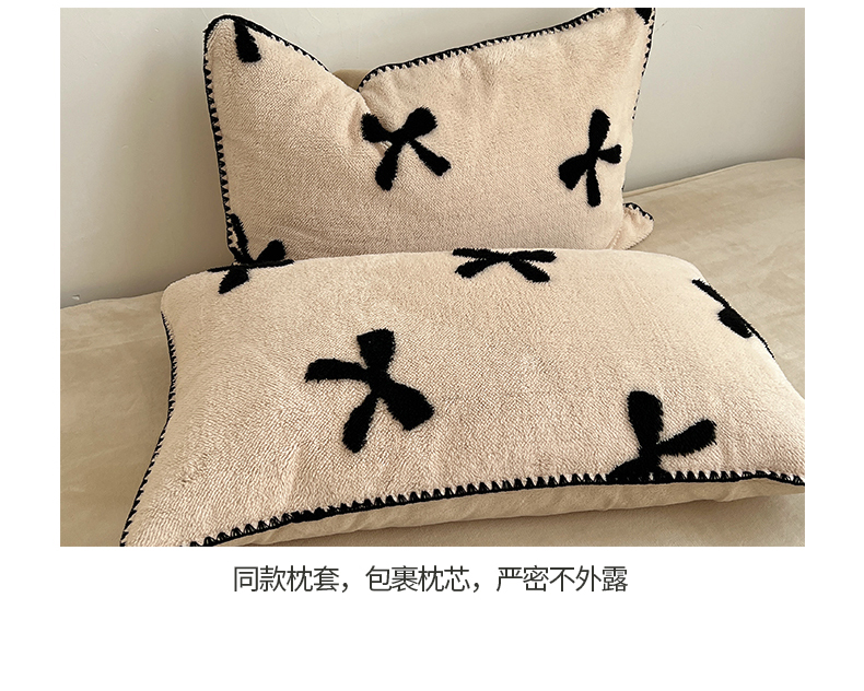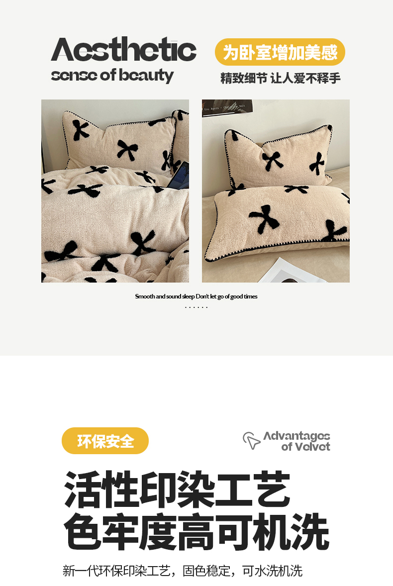 当前位置: 91家纺网 > 商品网购 > 床品套件 > 四件套 > 牛奶绒四件套 > 桃子家居 2024新款A类加厚美拉德温暖治愈风舒棉绒黑纱阳离子提花三角针贝壳边牛奶绒系列四件套 绒三角针-美拉德蝴蝶结