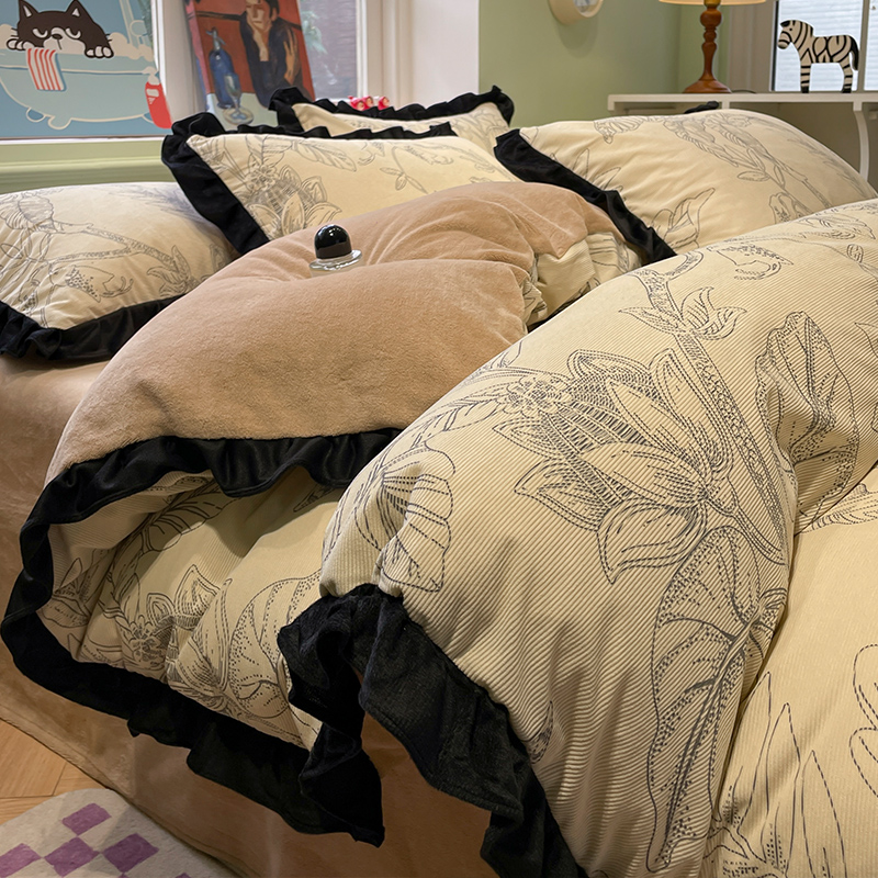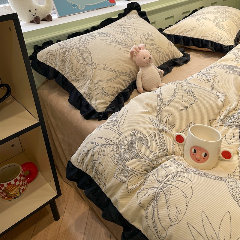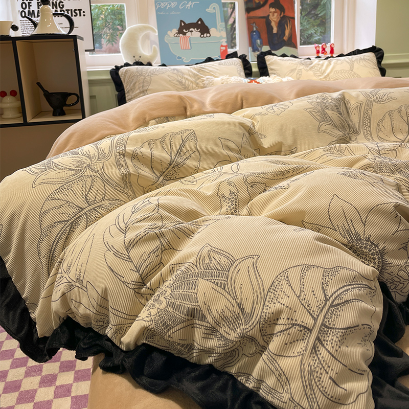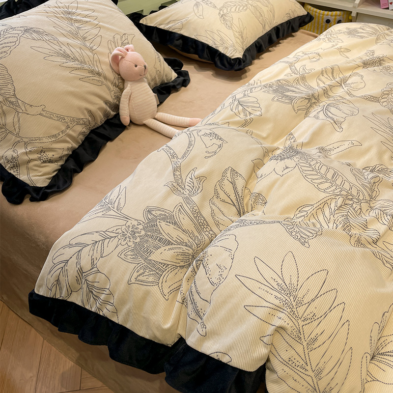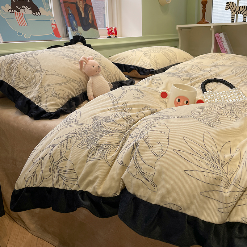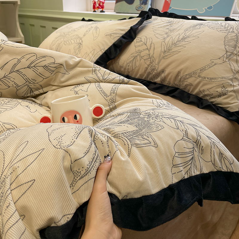 当前位置: 91家纺网 > 商品网购 > 床品套件 > 四件套 > 牛奶绒四件套 > 羚羊语家纺 爆款2024轻法式赫本风灯芯绒四件套小香风提花立体韩版花边牛奶绒三件套珊瑚法莱绒灯芯绒单被套-实拍风 月亮花房-羽叶