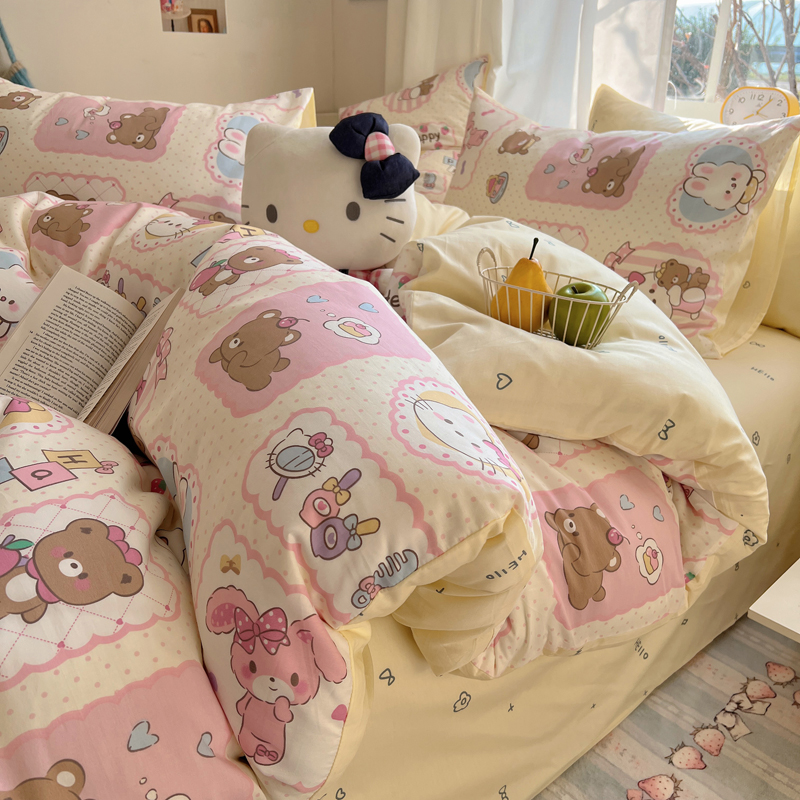 (总)桃喜 2025新款亲肤卡通系列四件套,黄格小熊,拼接甜心猫