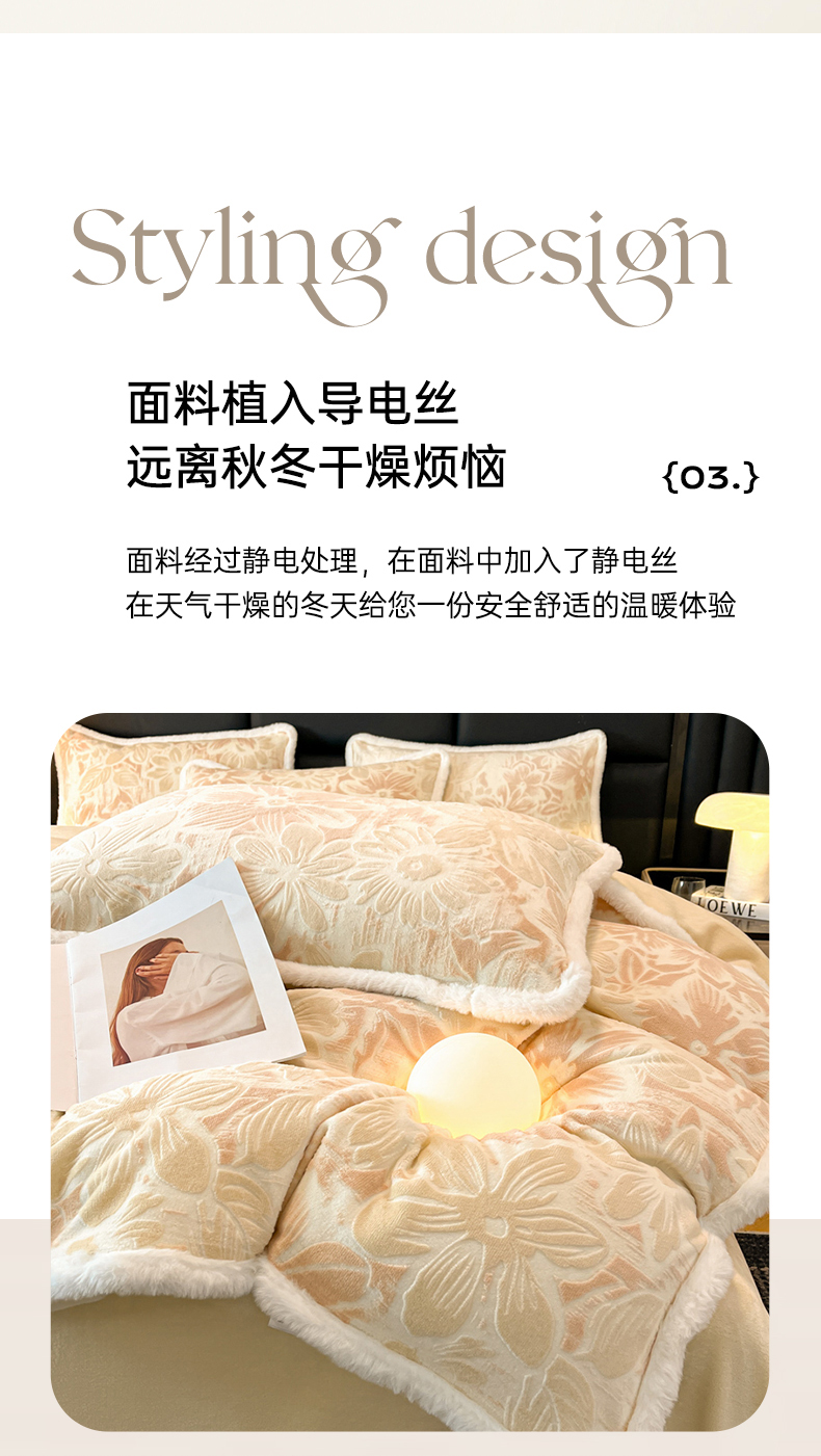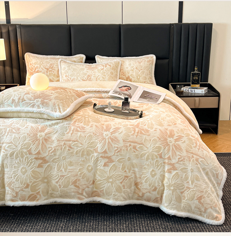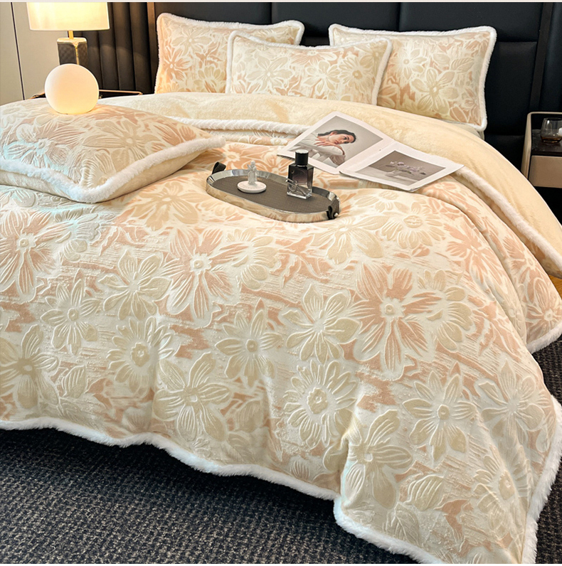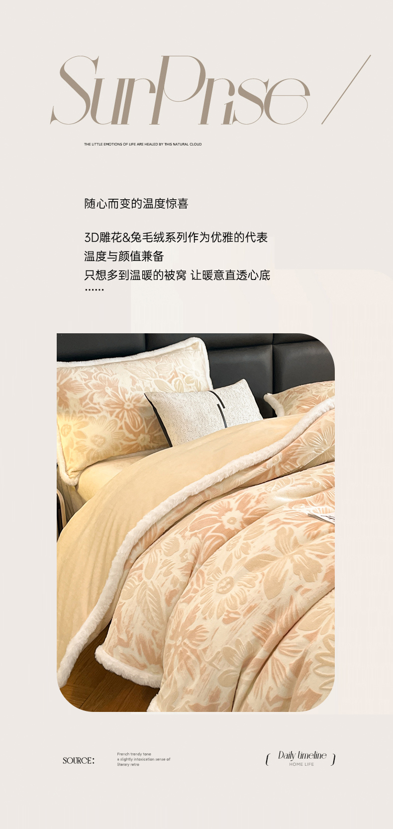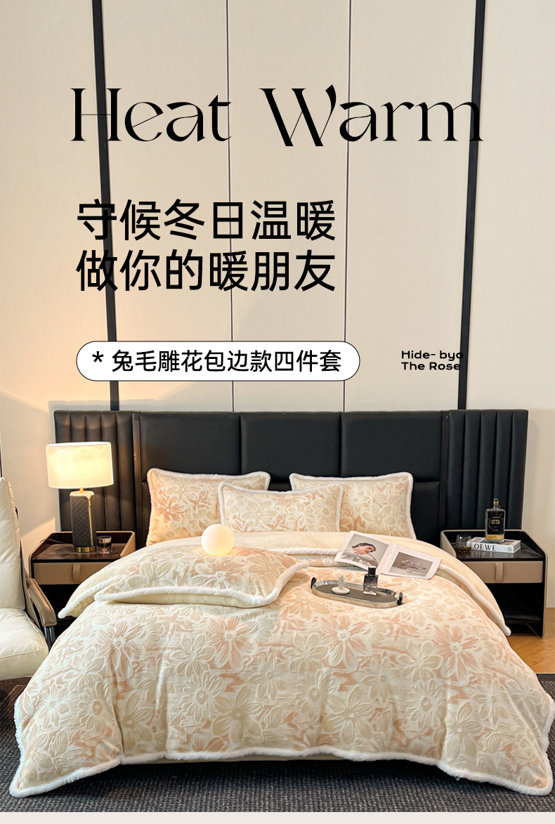 畅畅家纺 2025新款兔毛绒大包边雕花牛奶绒绒四件套 梵花-米白