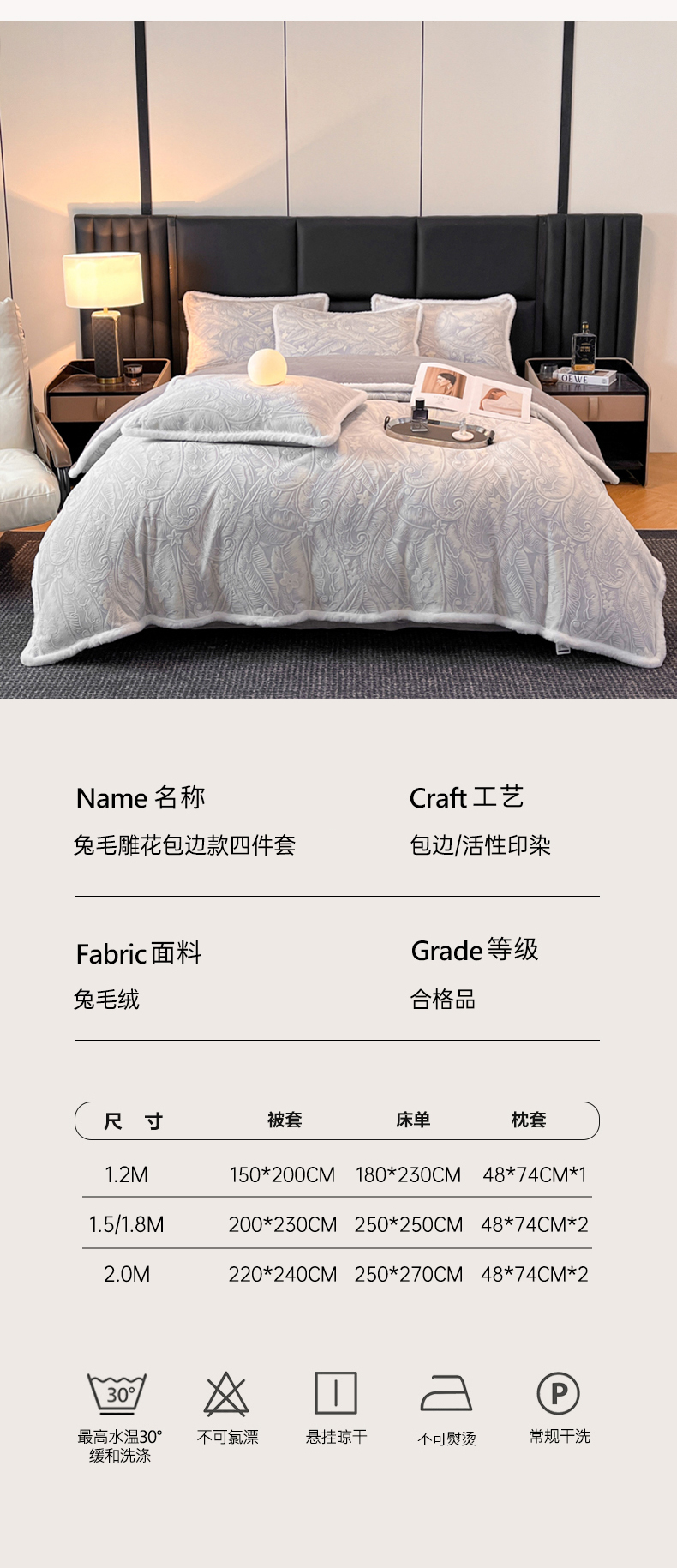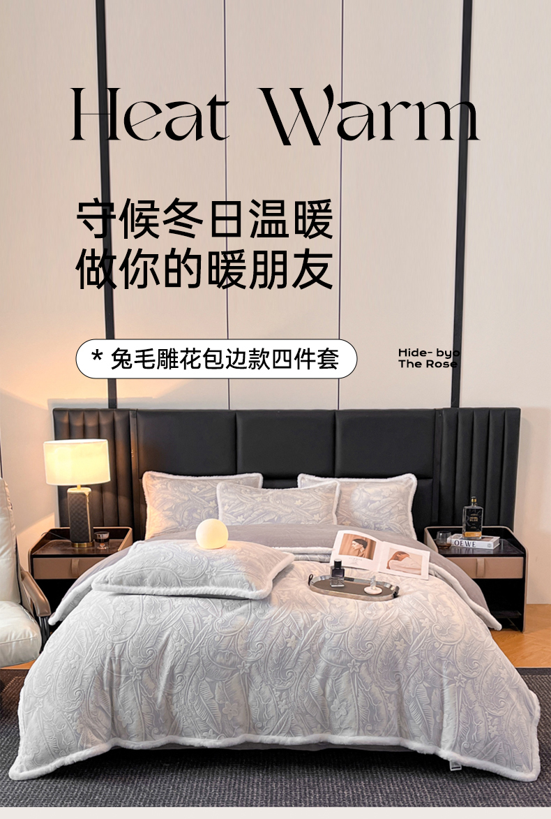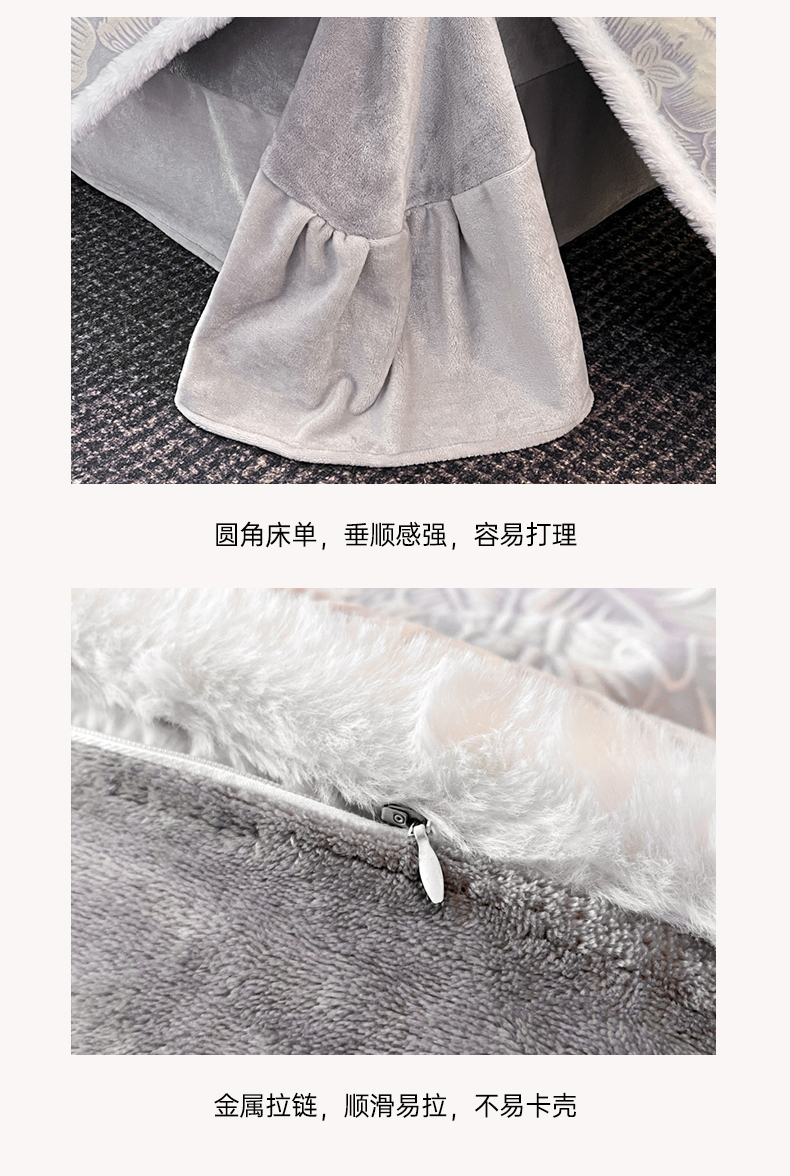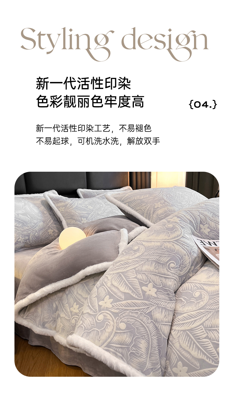 商品名称:畅畅家纺 2025新款兔毛绒大包边雕花牛奶绒绒四件套 叶语-灰