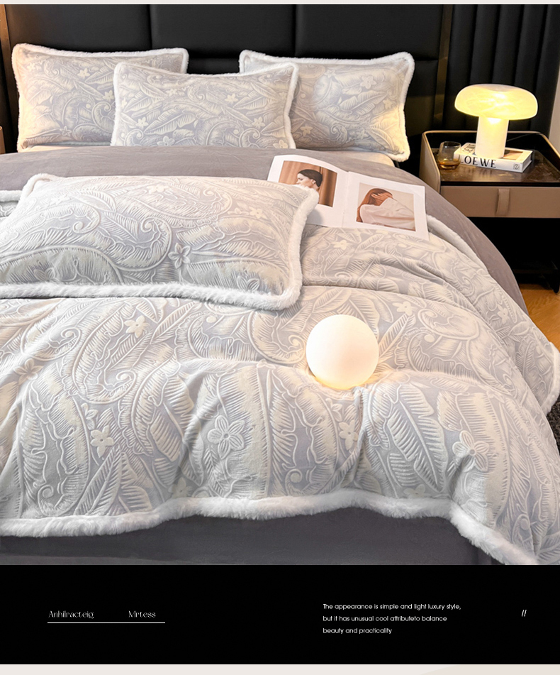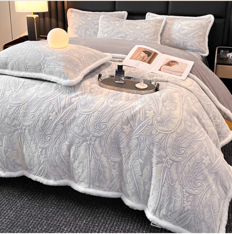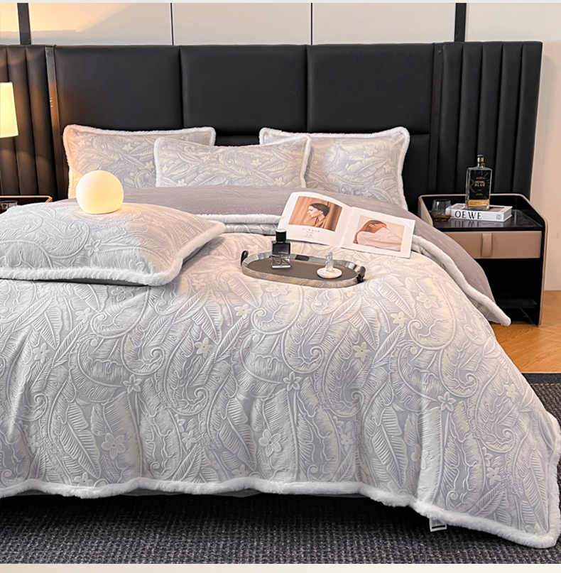 畅畅家纺 2025新款兔毛绒大包边雕花牛奶绒绒四件套 叶语-灰