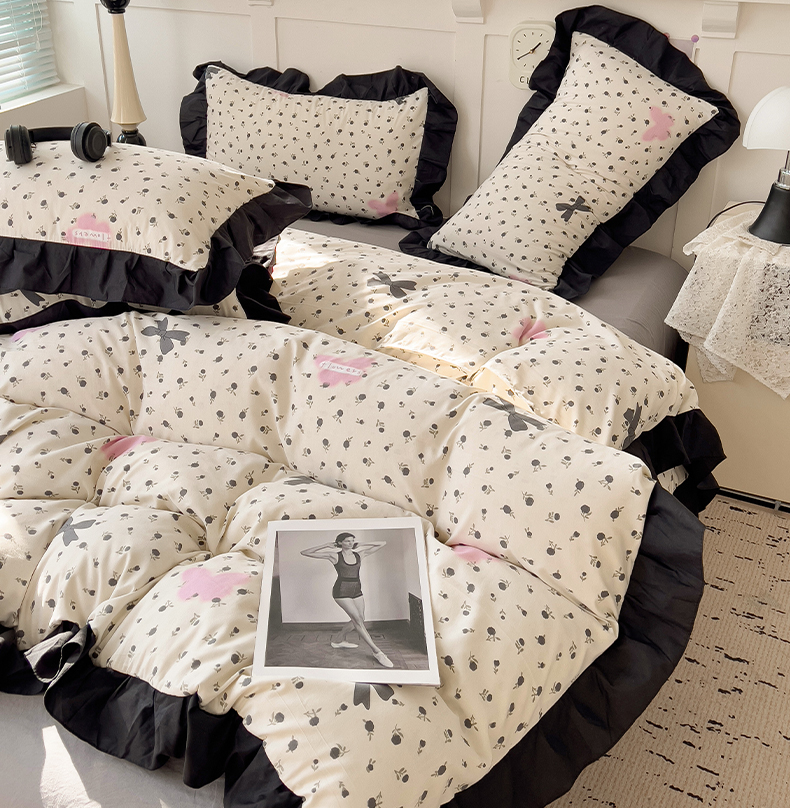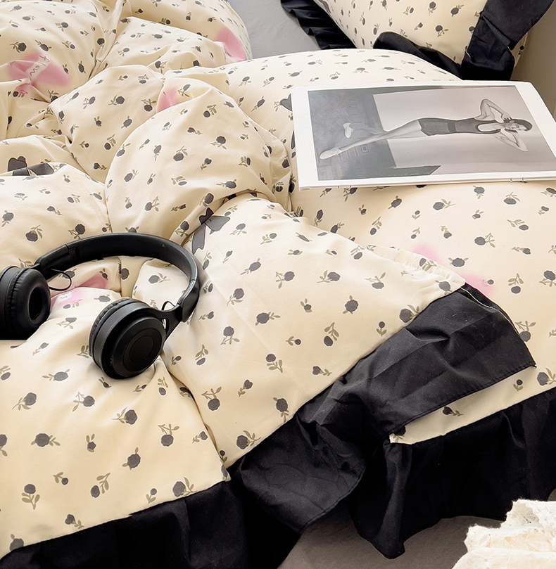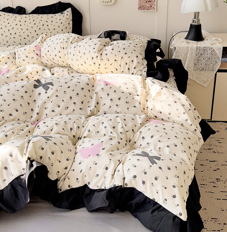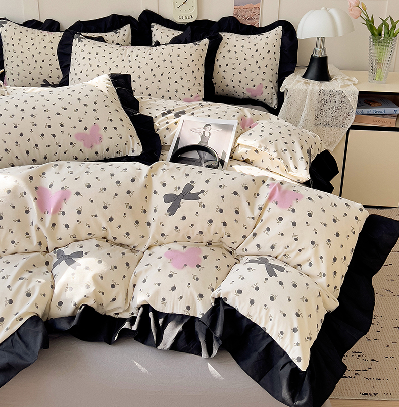 当前位置: 91家纺网 > 商品网购 > 床品套件 > 四件套 > 水洗棉四件套 > 艺玲家纺 2025新款韩版法式赫本风黑色花边水洗棉印花四件套 朵蔓花馨