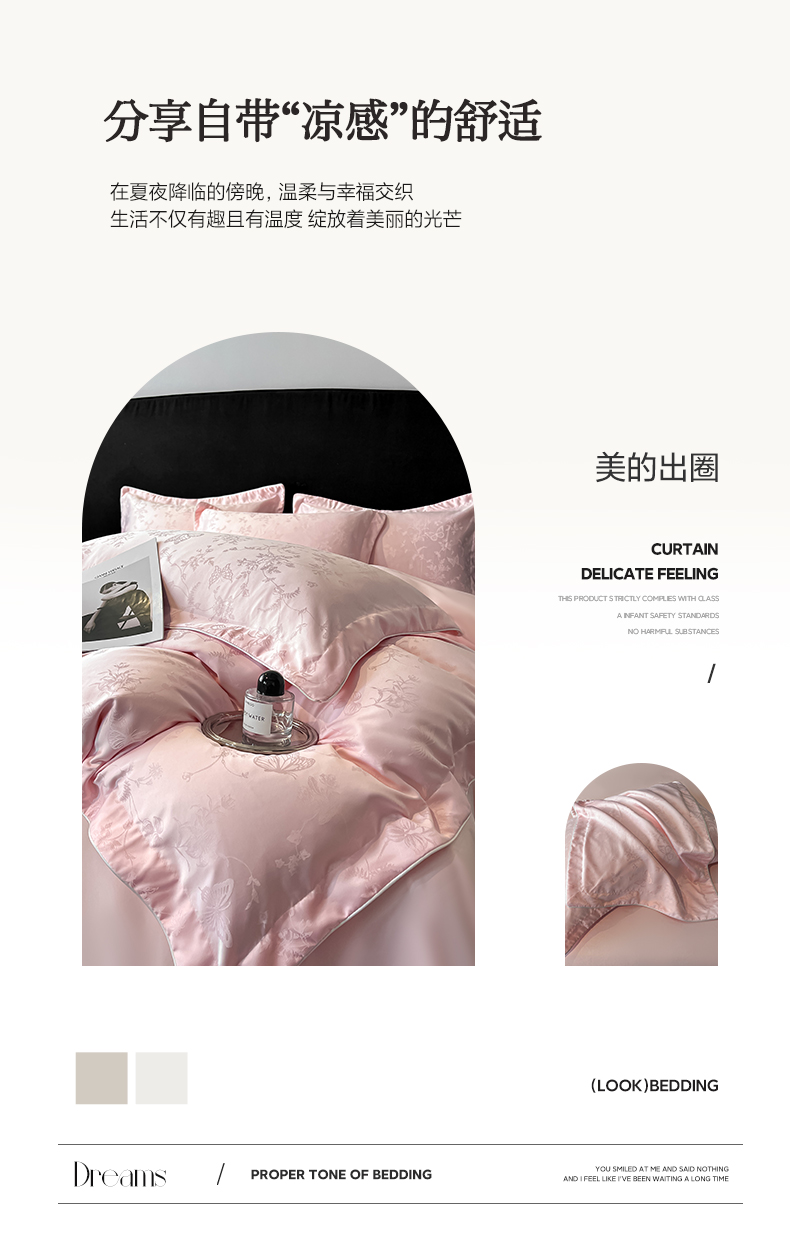 (总)米彩家纺 2025新款A类水洗真丝亮光浮雕洛丽塔夏被夏凉被空调被四件套,粉玉,金香槟,奶昔白,天兰