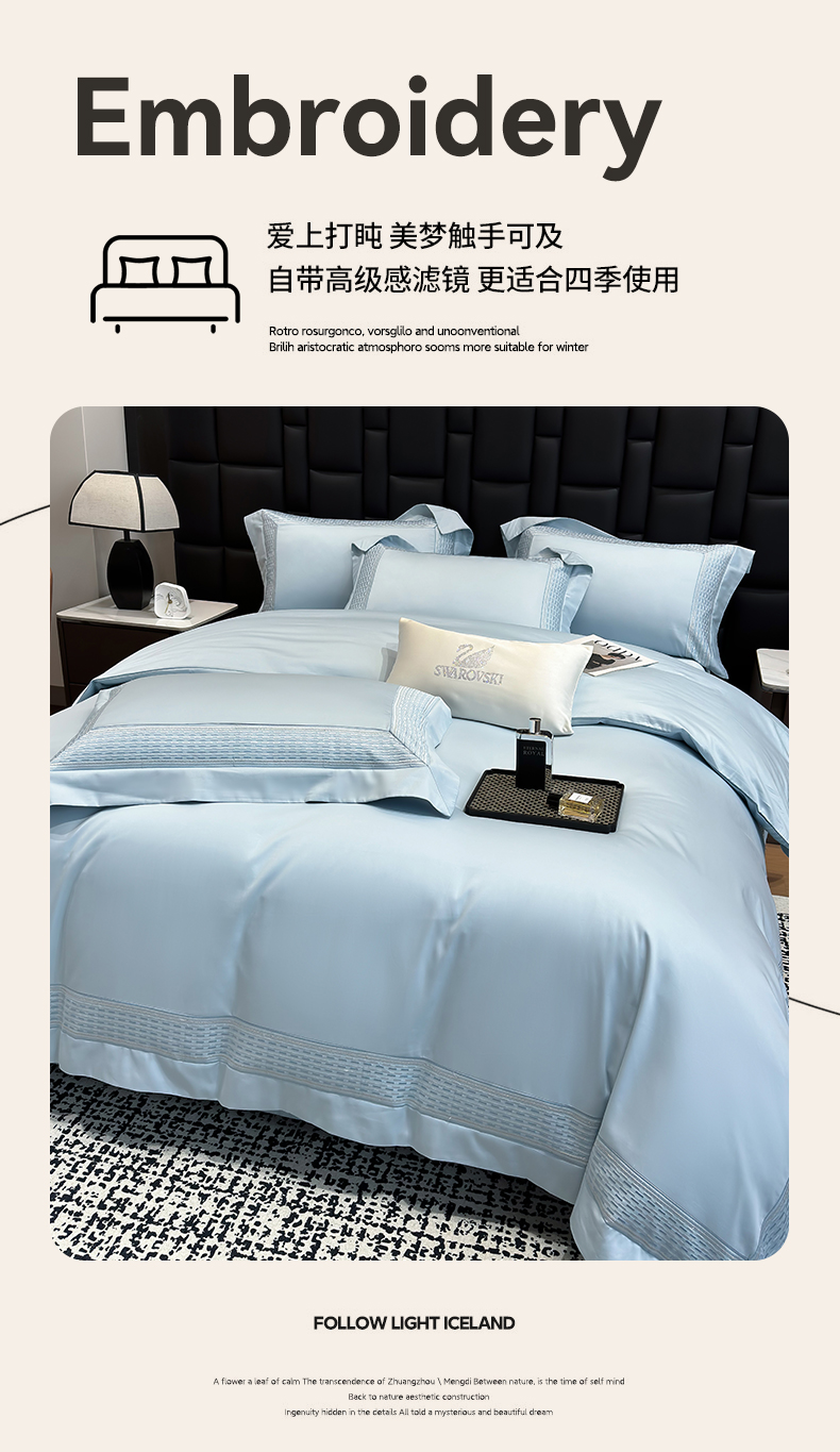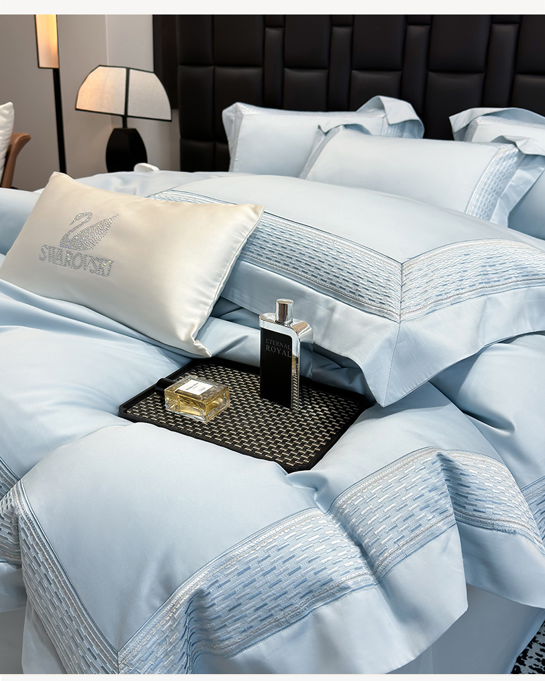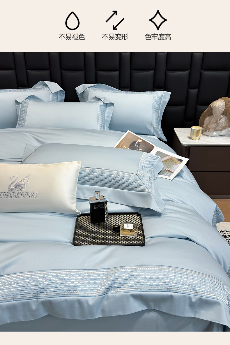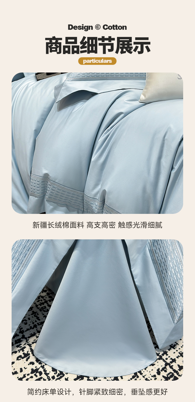 商品名称:家居1号家纺 2025新款长绒棉边条刺绣四件套威尼斯系列 威尼斯-月光蓝