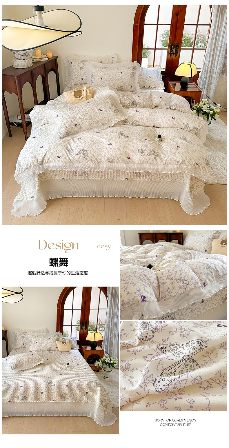 商品名称:赫本家纺 2025新款水洗棉花边款夹棉床盖三件套四件套 蝶舞