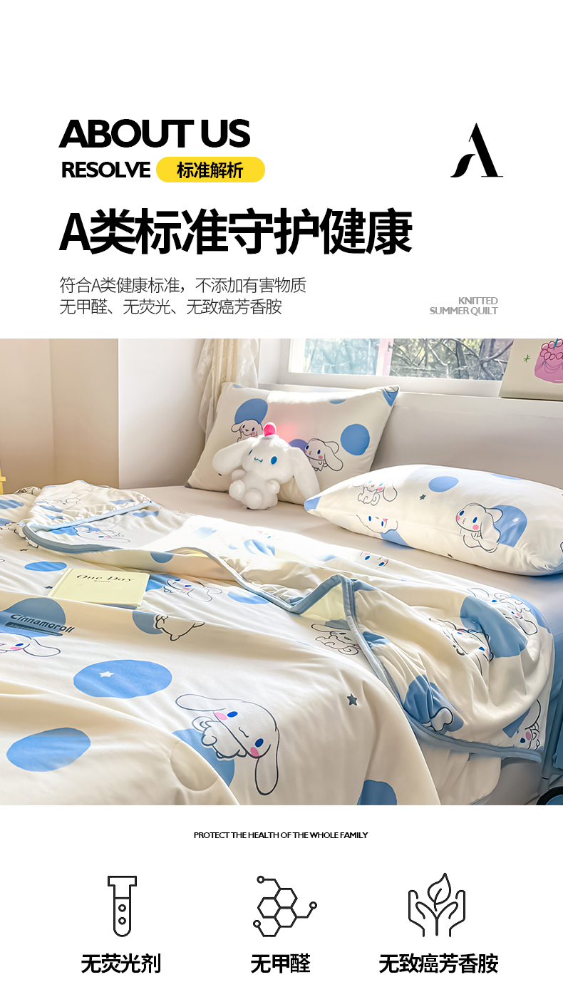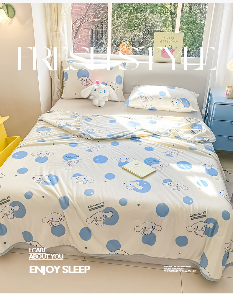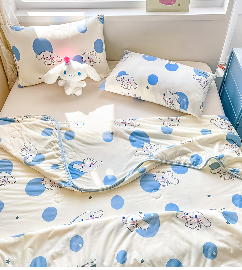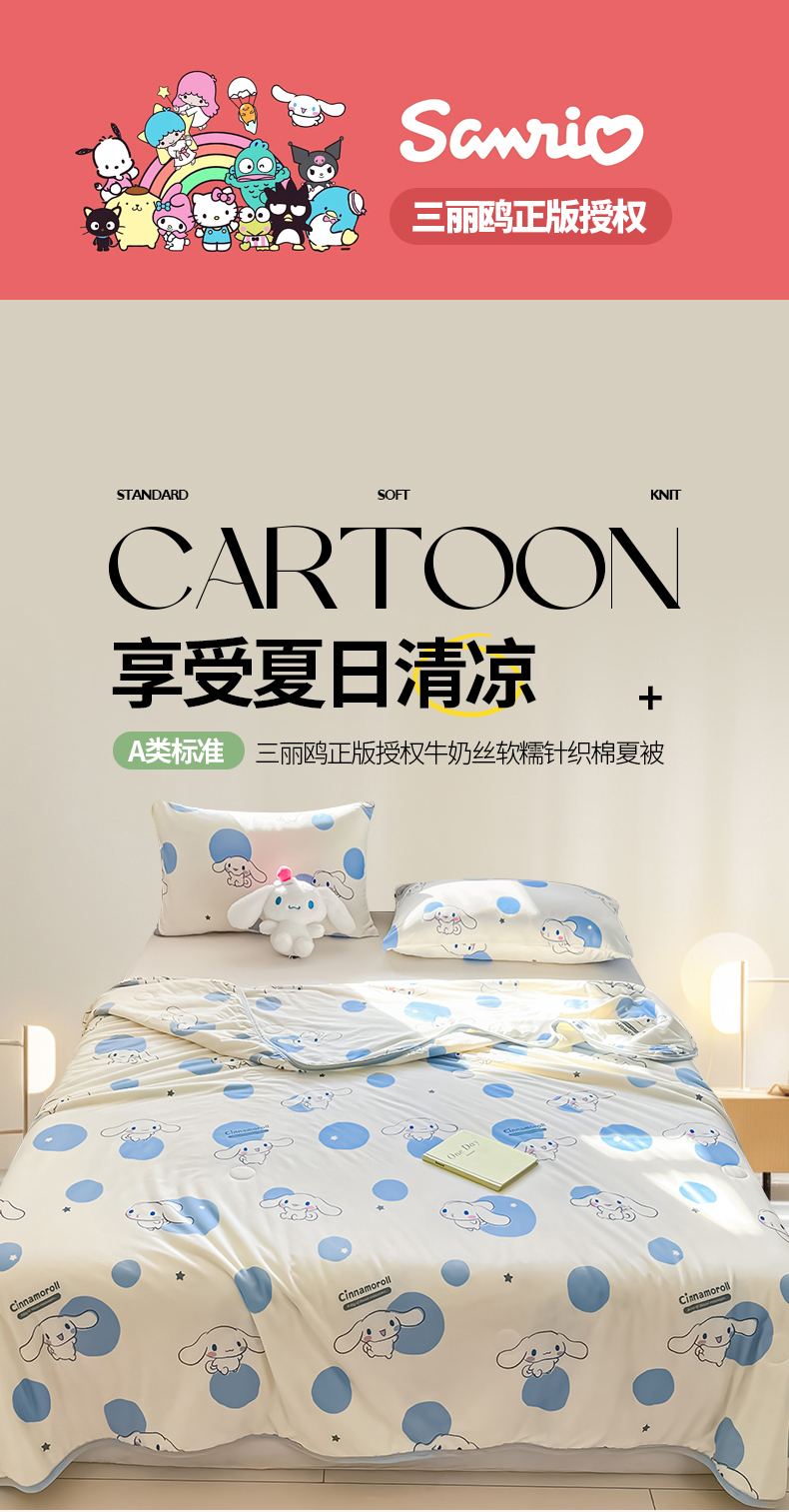• 91家纺网 家纺一手货源 找家纺 桃子家居 2025新款A类三丽鸥正版授权高品质牛奶丝软糯针织棉大豆夏被系列 针织棉三丽鸥-蓝蓝波点玉桂狗
