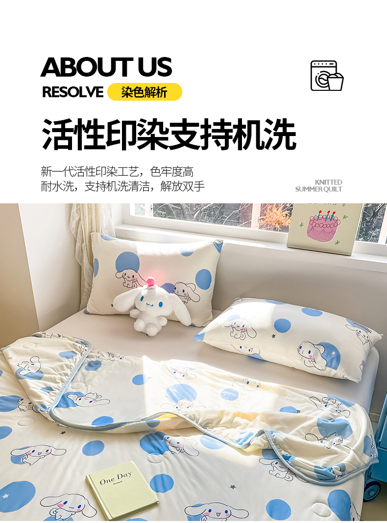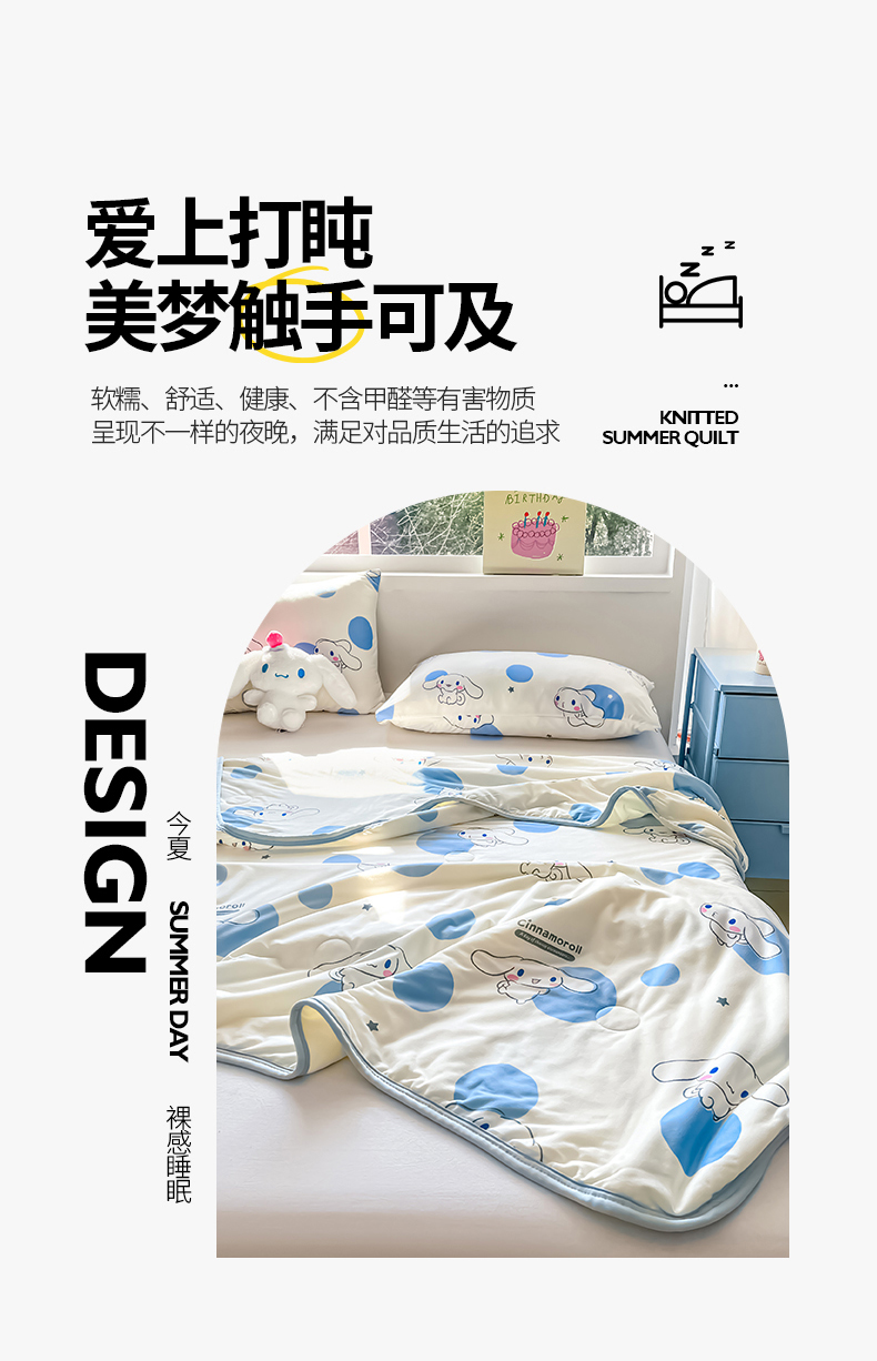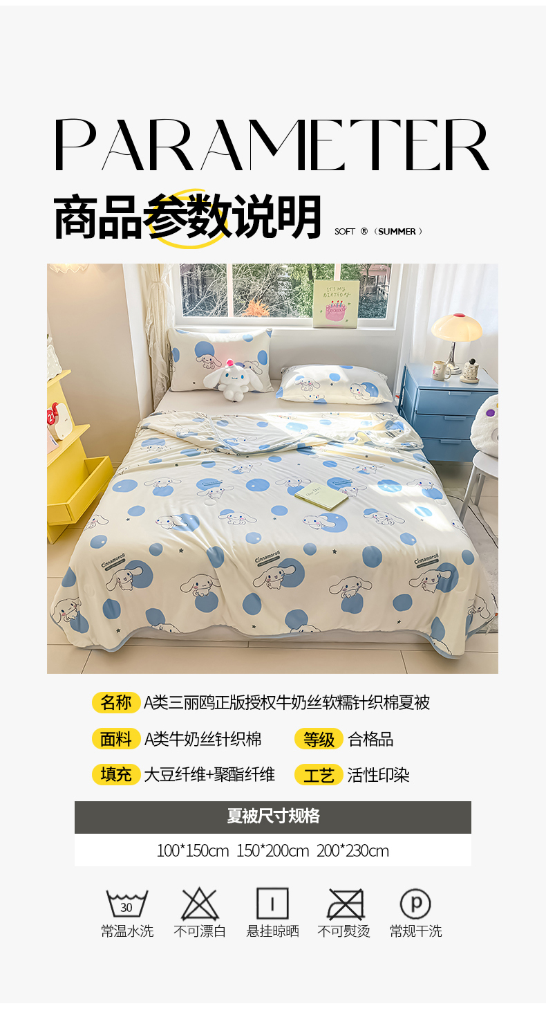 • 91家纺网 家纺一手货源 找家纺 桃子家居 2025新款A类三丽鸥正版授权高品质牛奶丝软糯针织棉大豆夏被系列 针织棉三丽鸥-蓝蓝波点玉桂狗