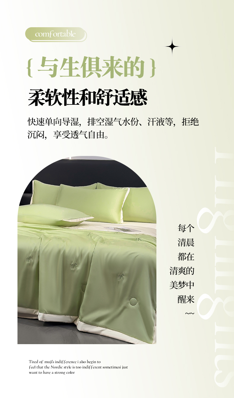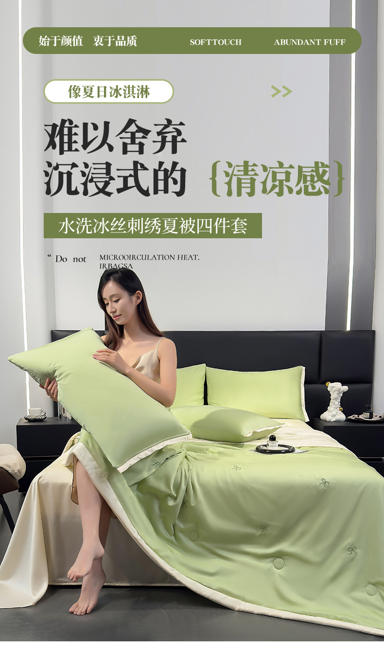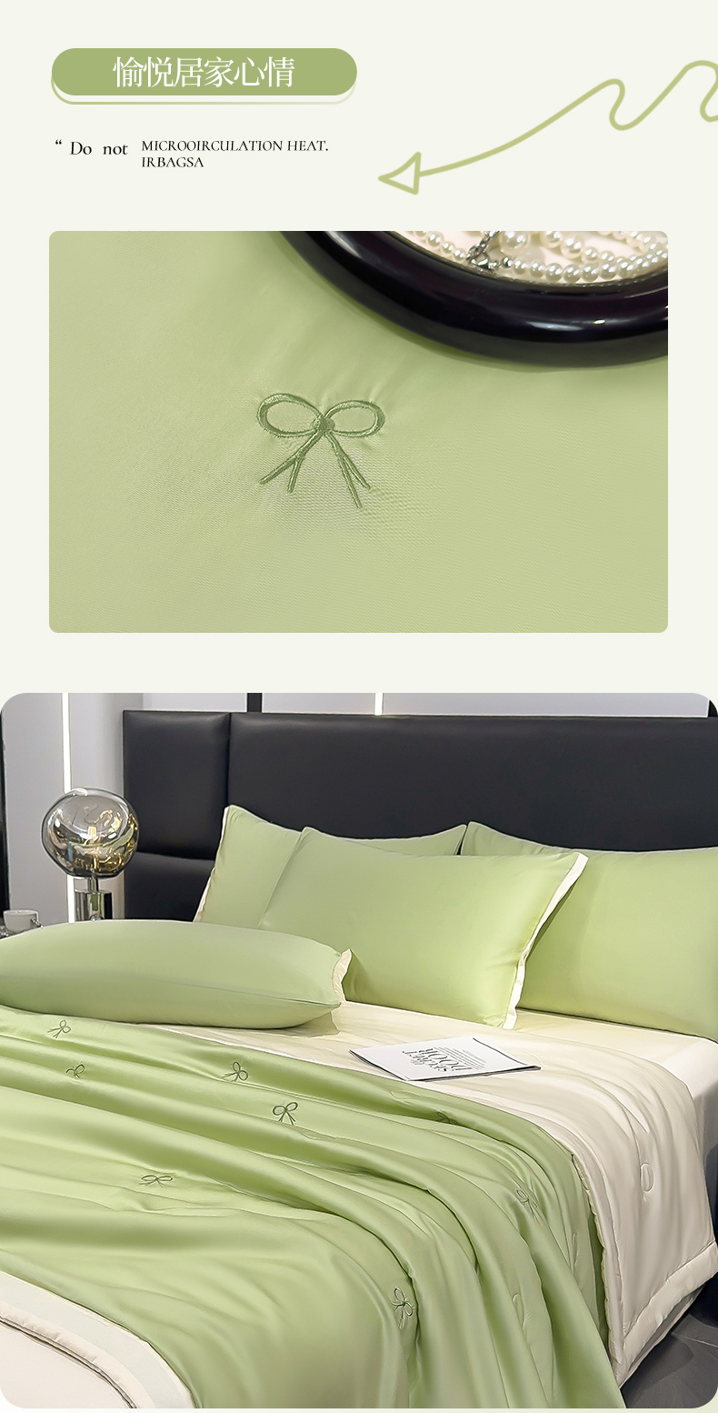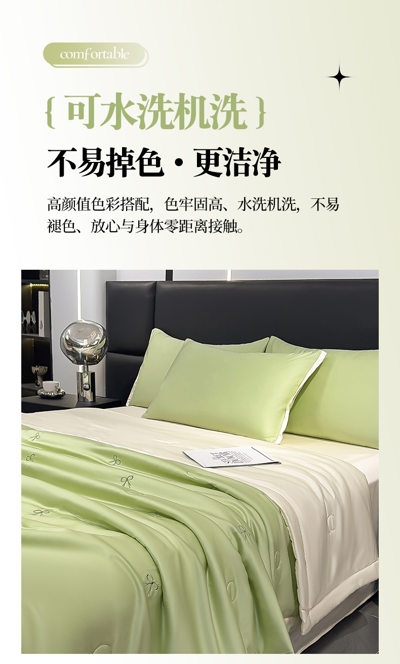 商品名称:2025新款清凉舒适水洗冰丝刺绣夏被四件套 蝴蝶結-青频绿