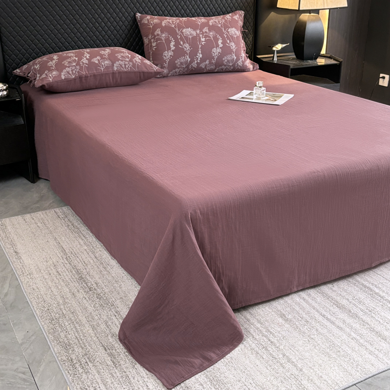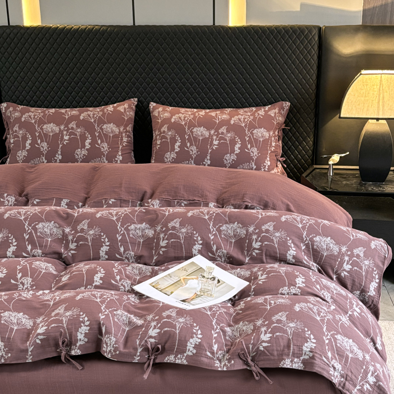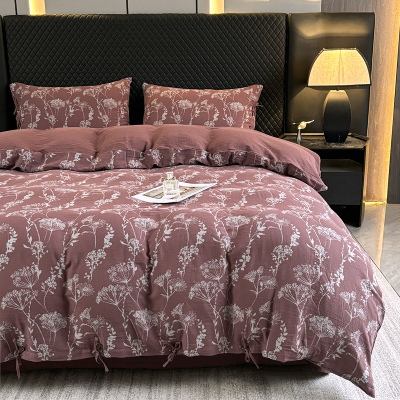 鲁爱家纺供货 2025新款全棉色织双层纱系带款四件套 云影-豆沙
