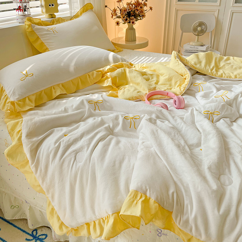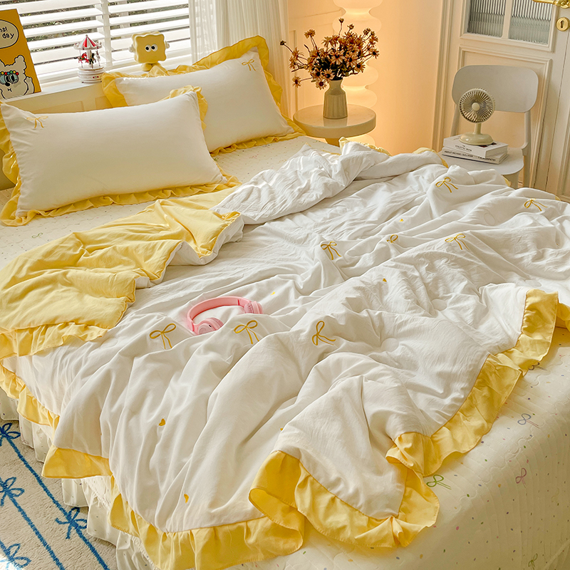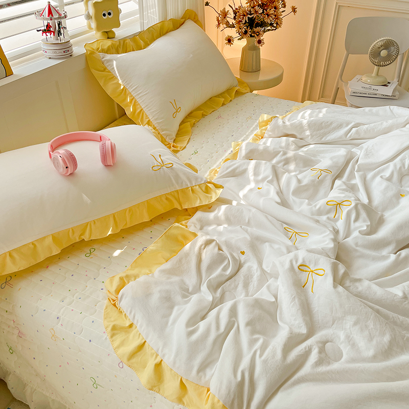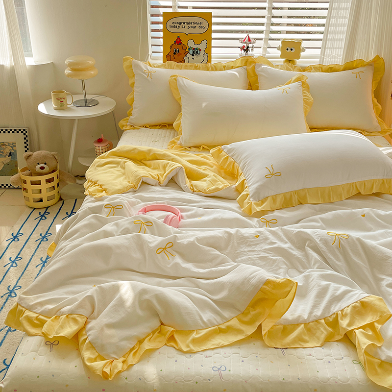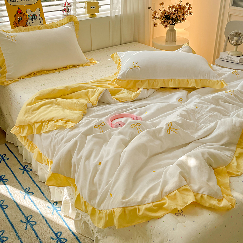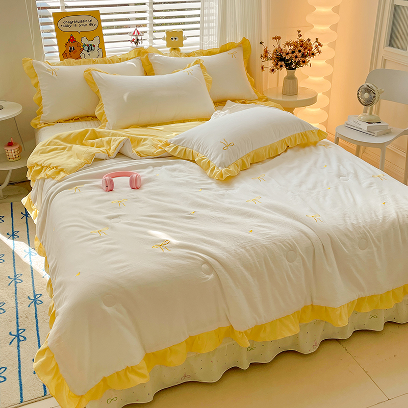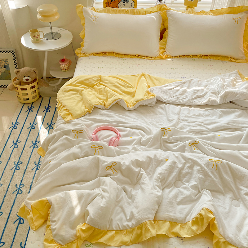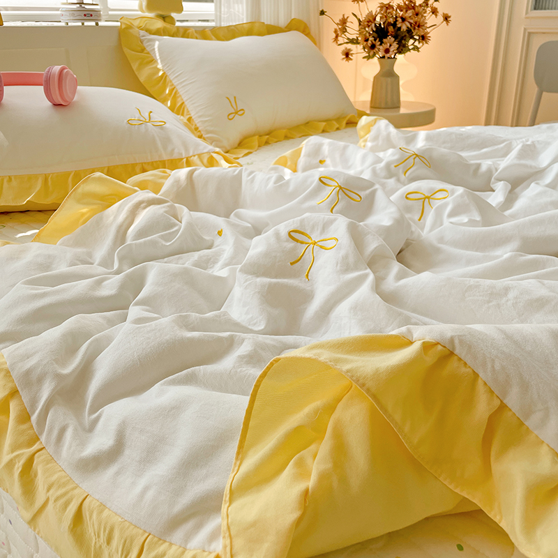2025新款绣花双层纱针织棉夏被床盖四件套全棉夏被四件套 蝴蝶结黄
