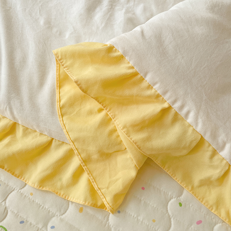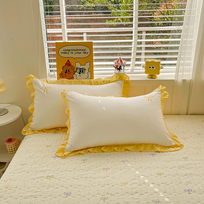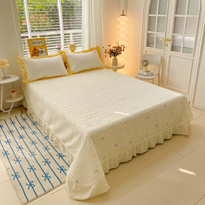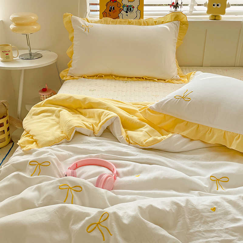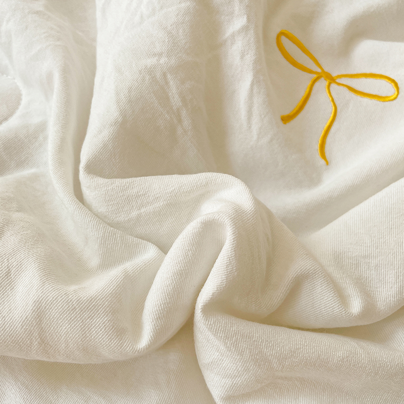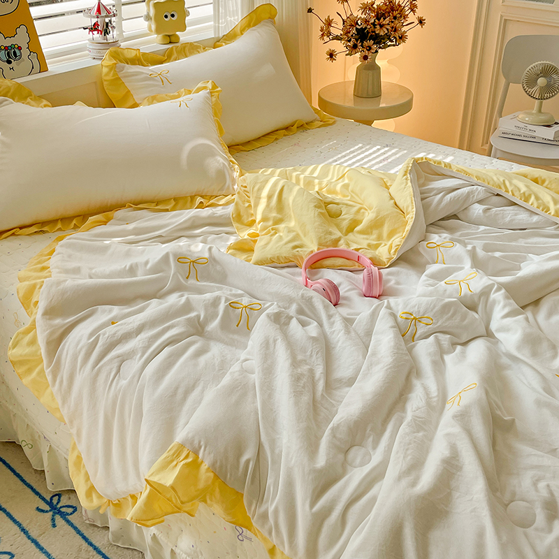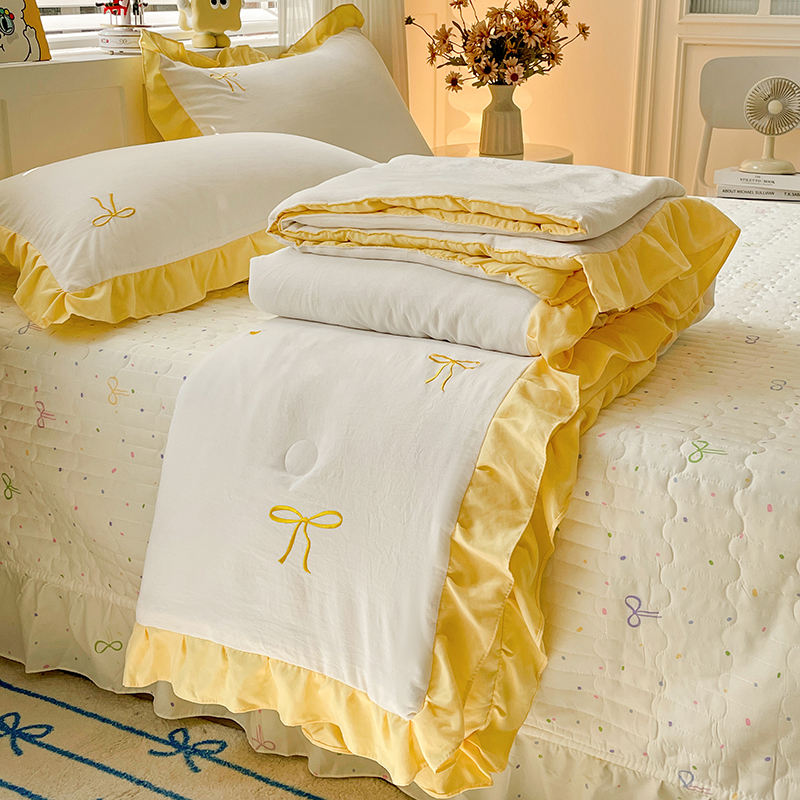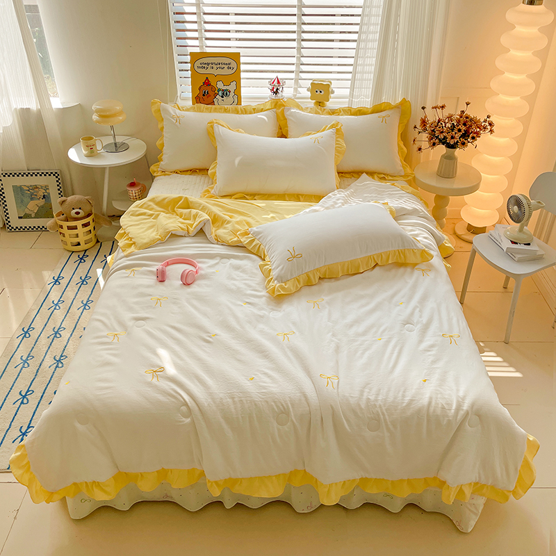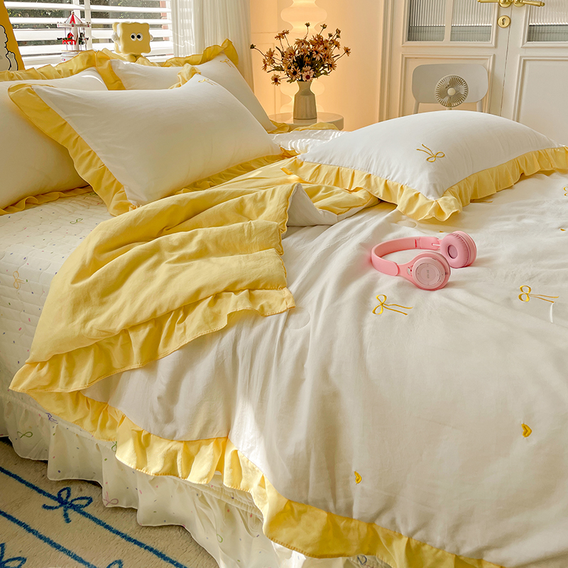 2025新款绣花双层纱针织棉夏被床盖四件套全棉夏被四件套 蝴蝶结黄