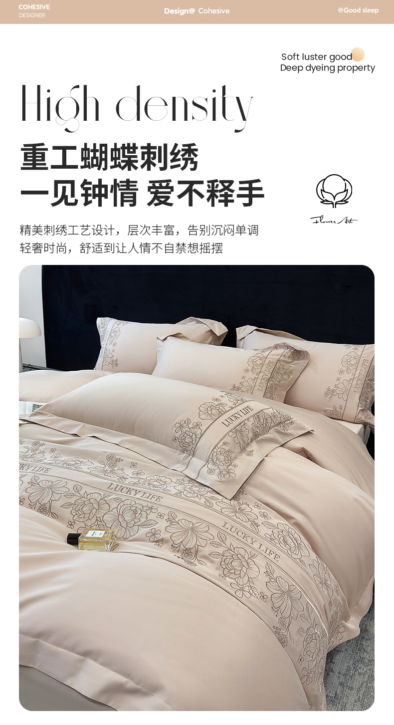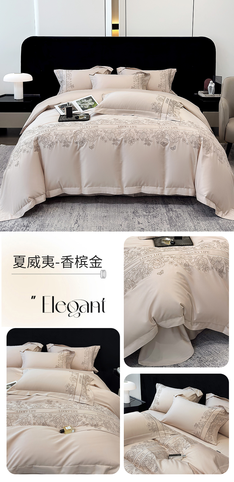 商品名称:家居1号 2025新款50双股四季长绒棉蝴蝶花卉刺绣四件套-夏威夷 夏威夷-香槟金