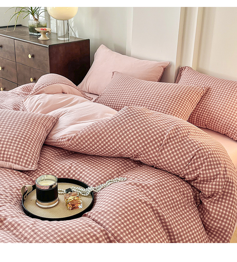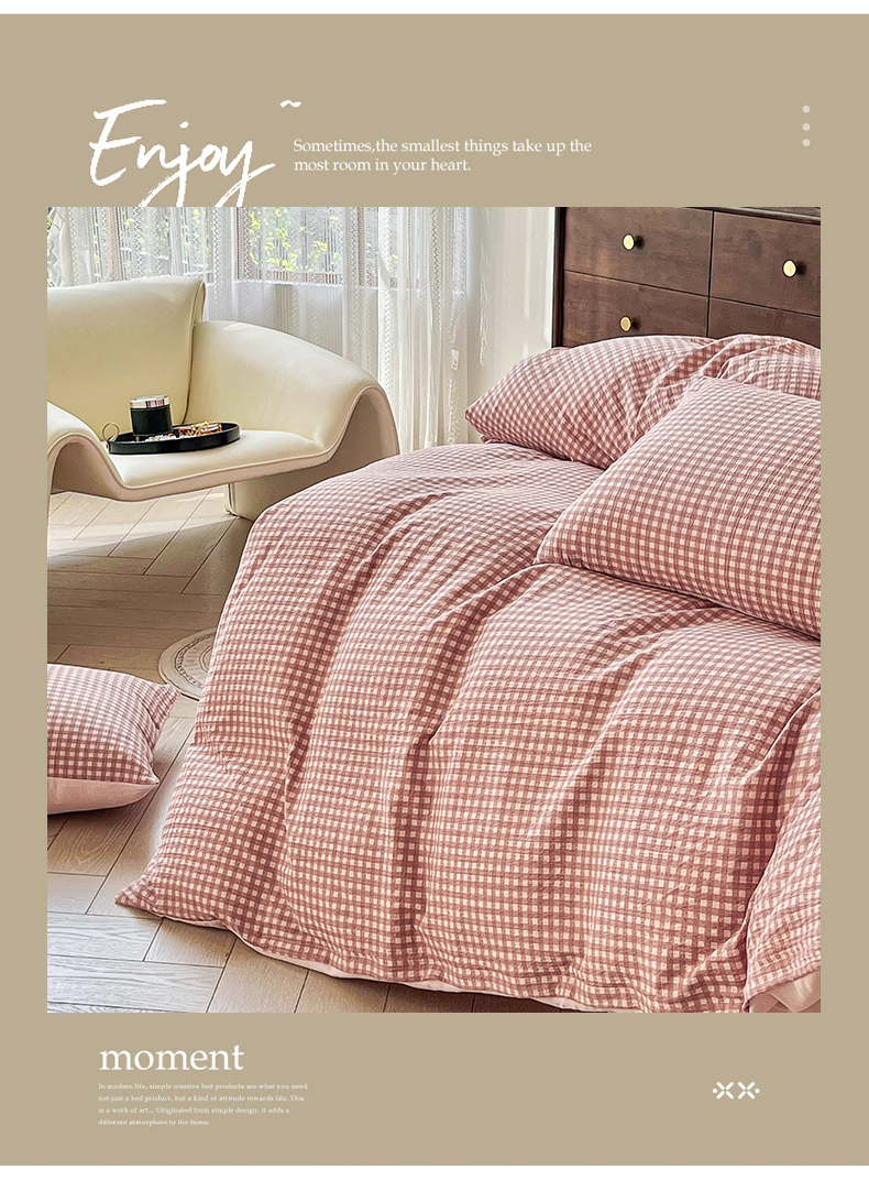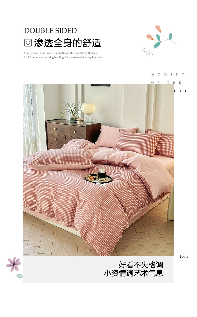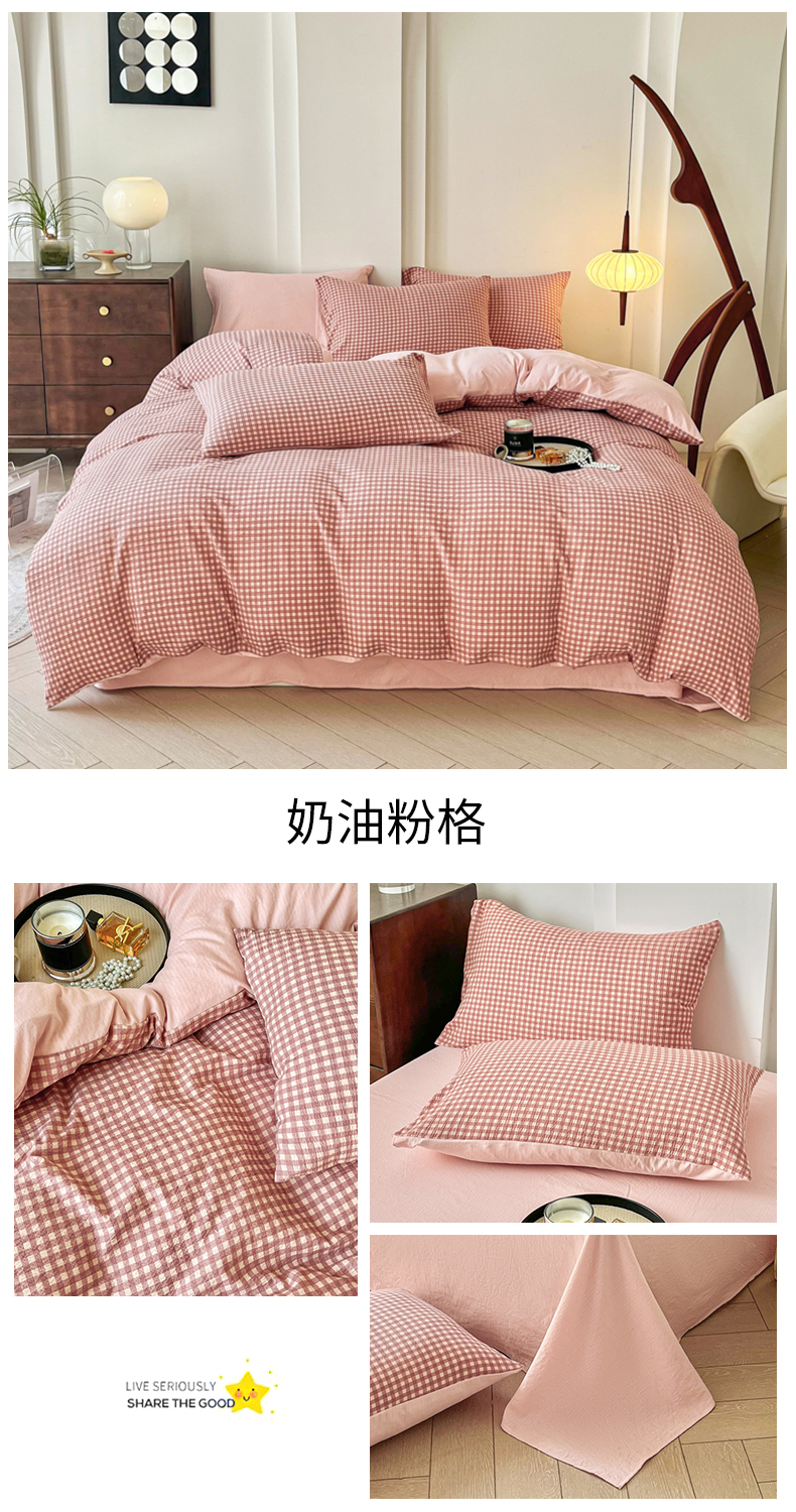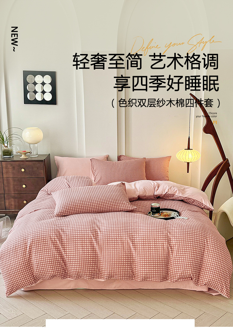 商品名称:优米家纺 2025新款色织双层纱木棉四件套 奶油粉格