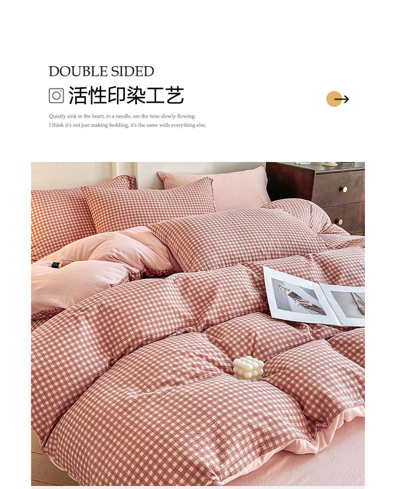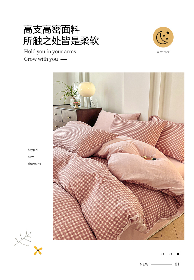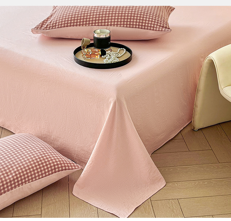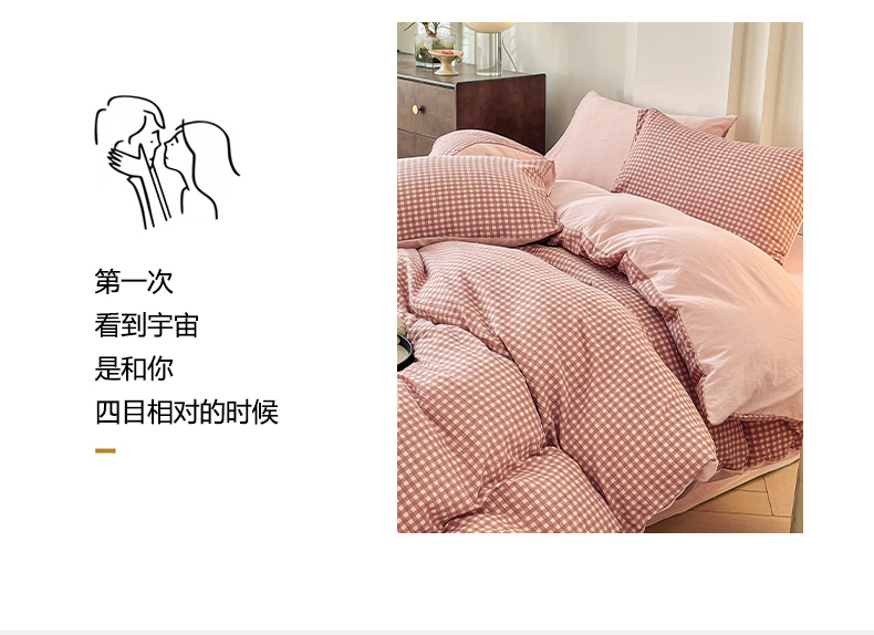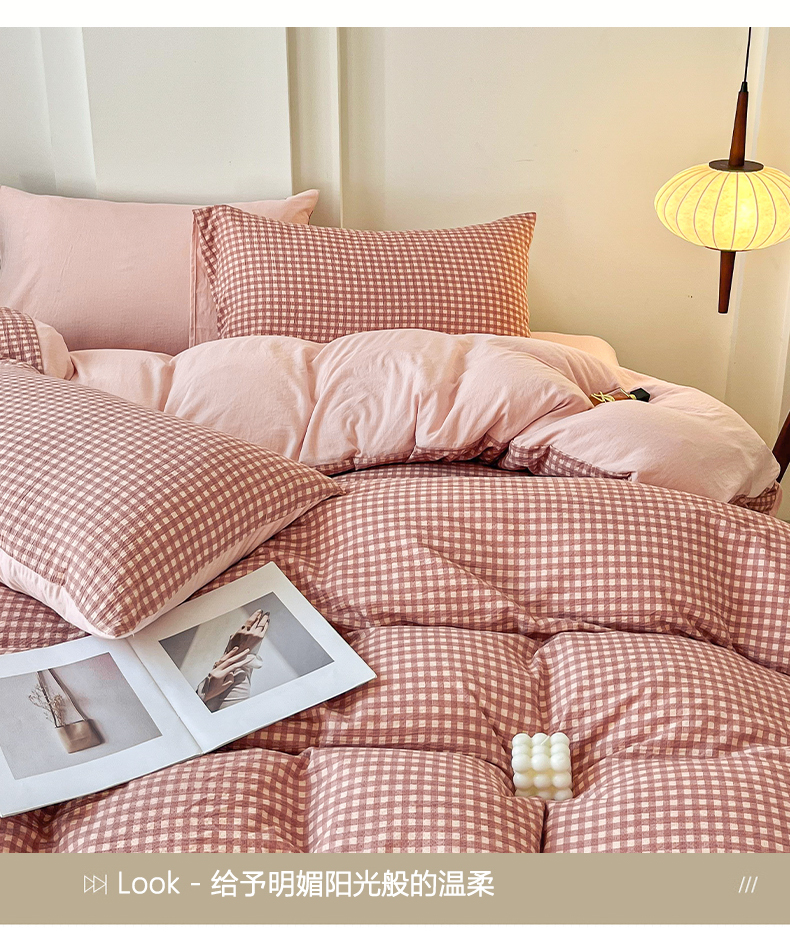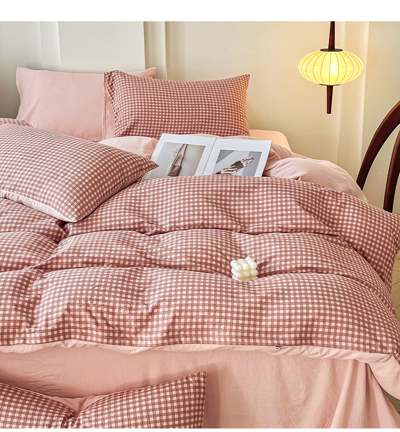 商品名称:优米家纺 2025新款色织双层纱木棉四件套 奶油粉格